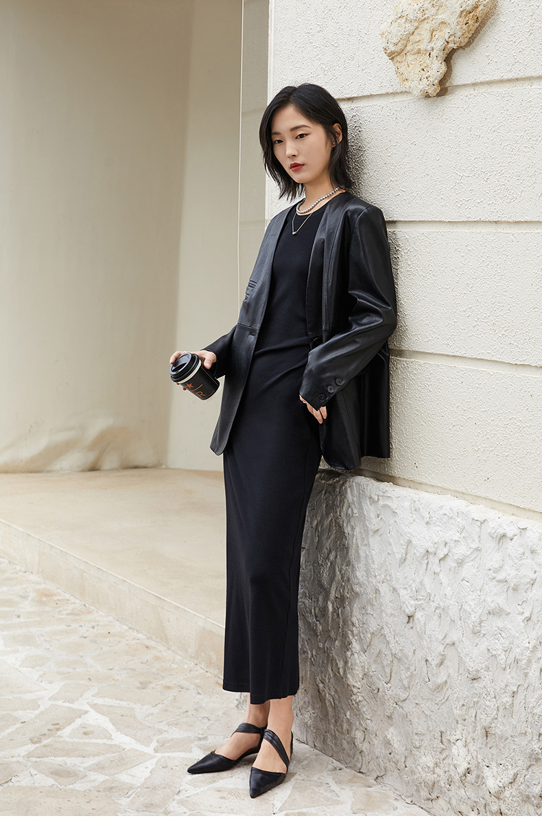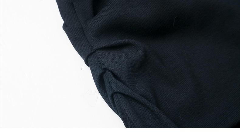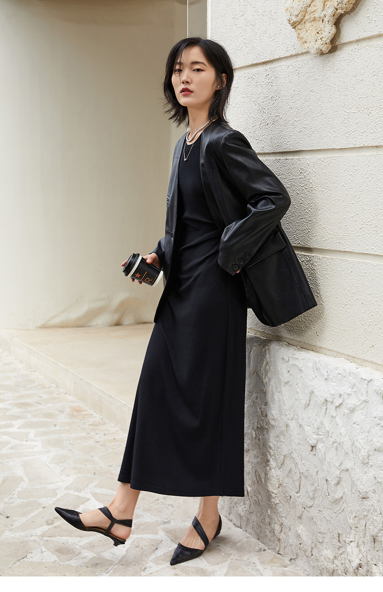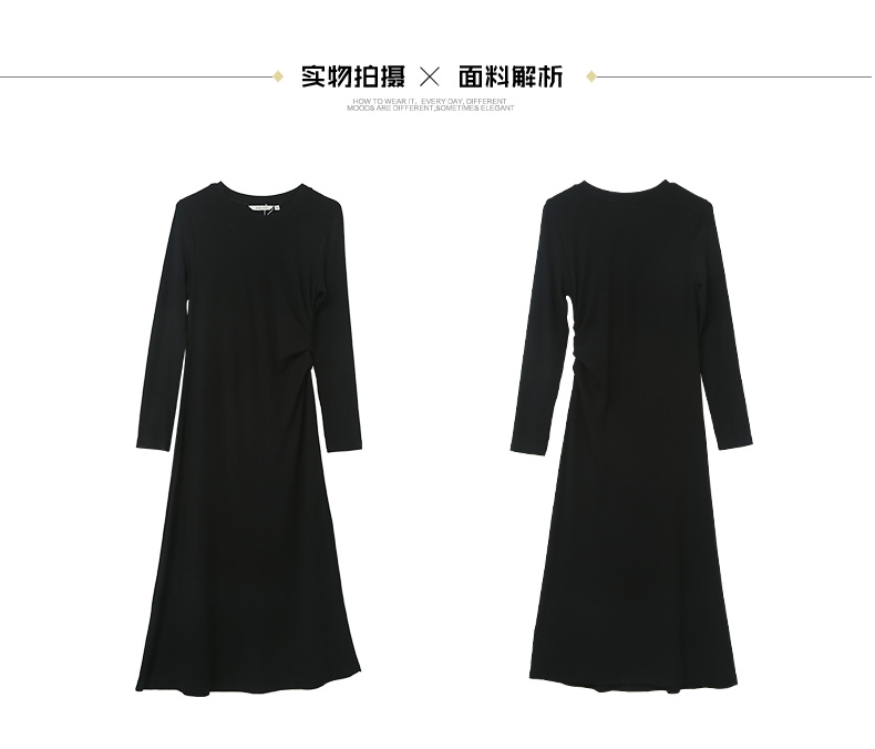通勤约会都可 黑色长袖连衣裙 侧腰褶皱 显瘦气质 百搭长裙