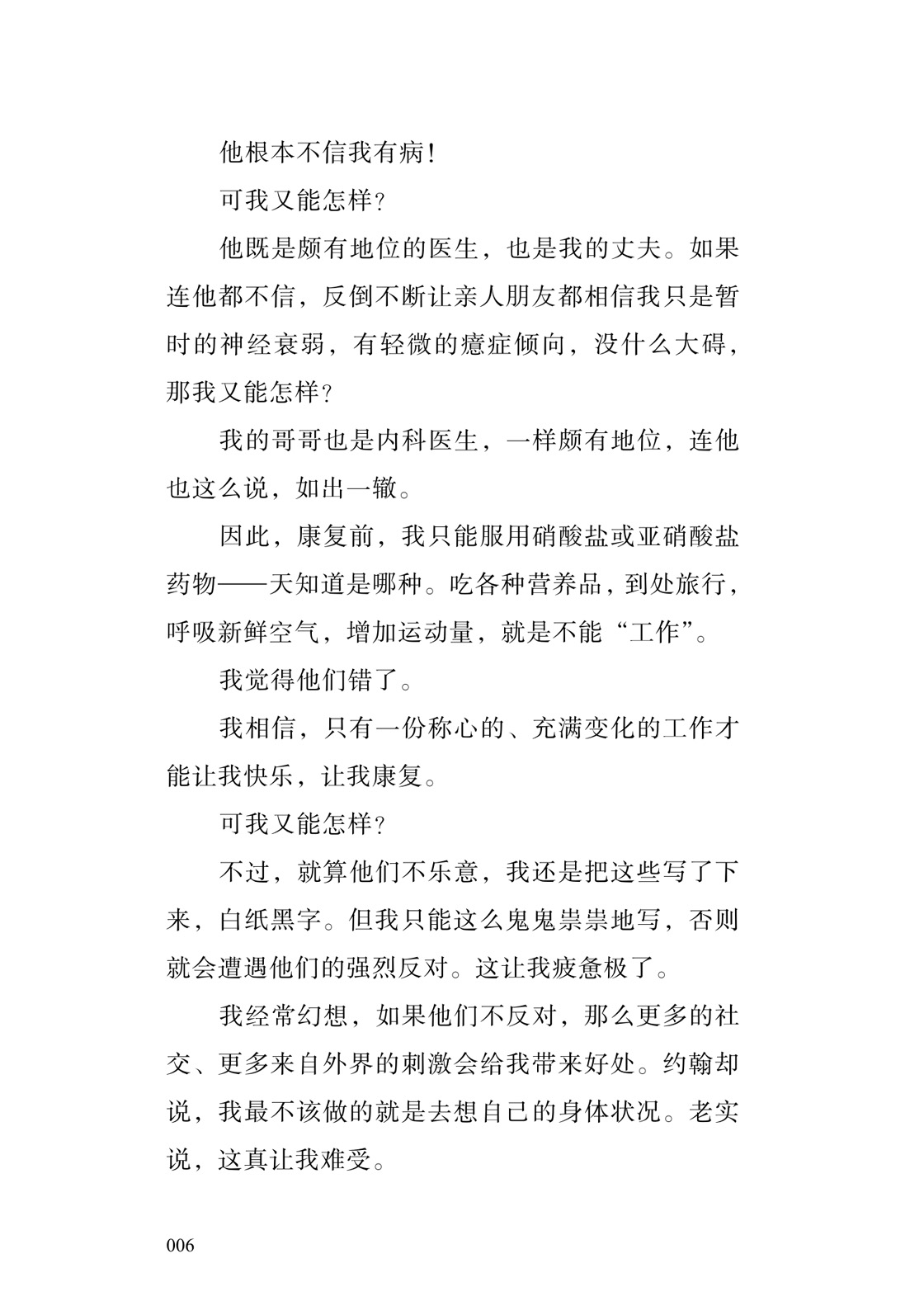 吉尔曼深知,即便一位被看成为“疯狂的”女性被判定要在自己身体那“受到影响的”屋子之中受到监禁,她或许依然会发现,如西尔维娅·普拉斯在70年之后会说的那样,她还有“一个自我需要恢复,那是一位王后”。——《阁楼上的疯女人》