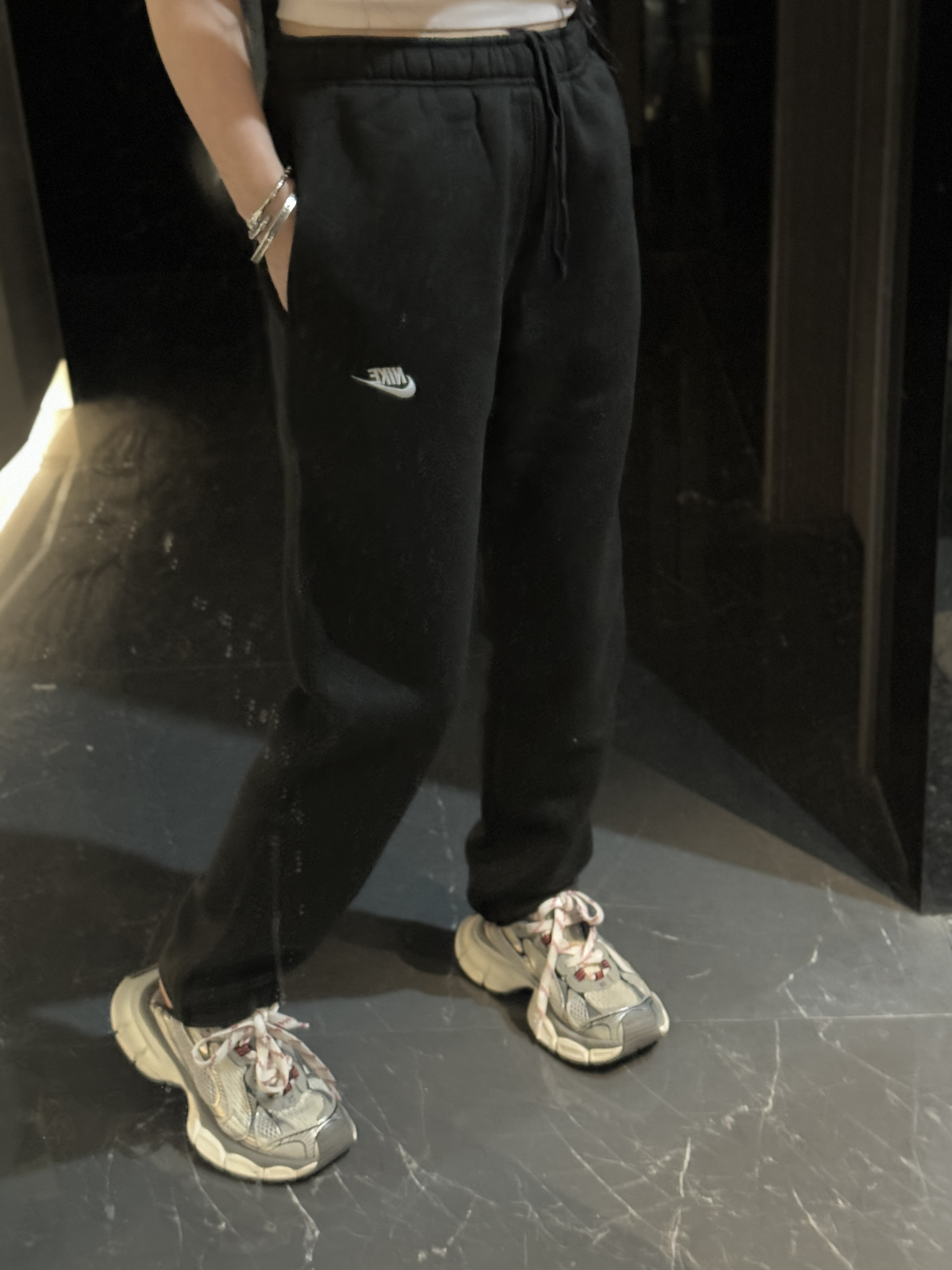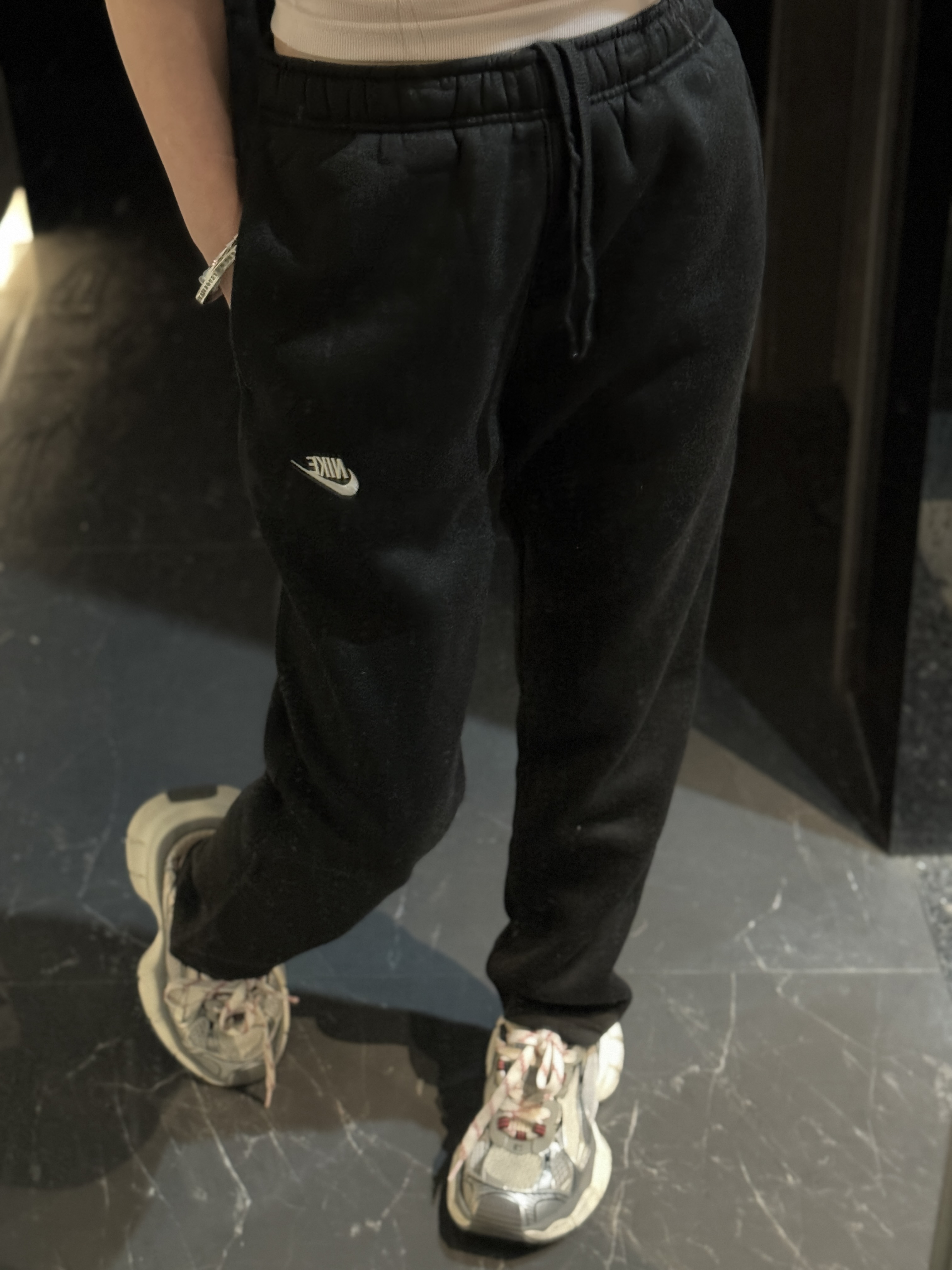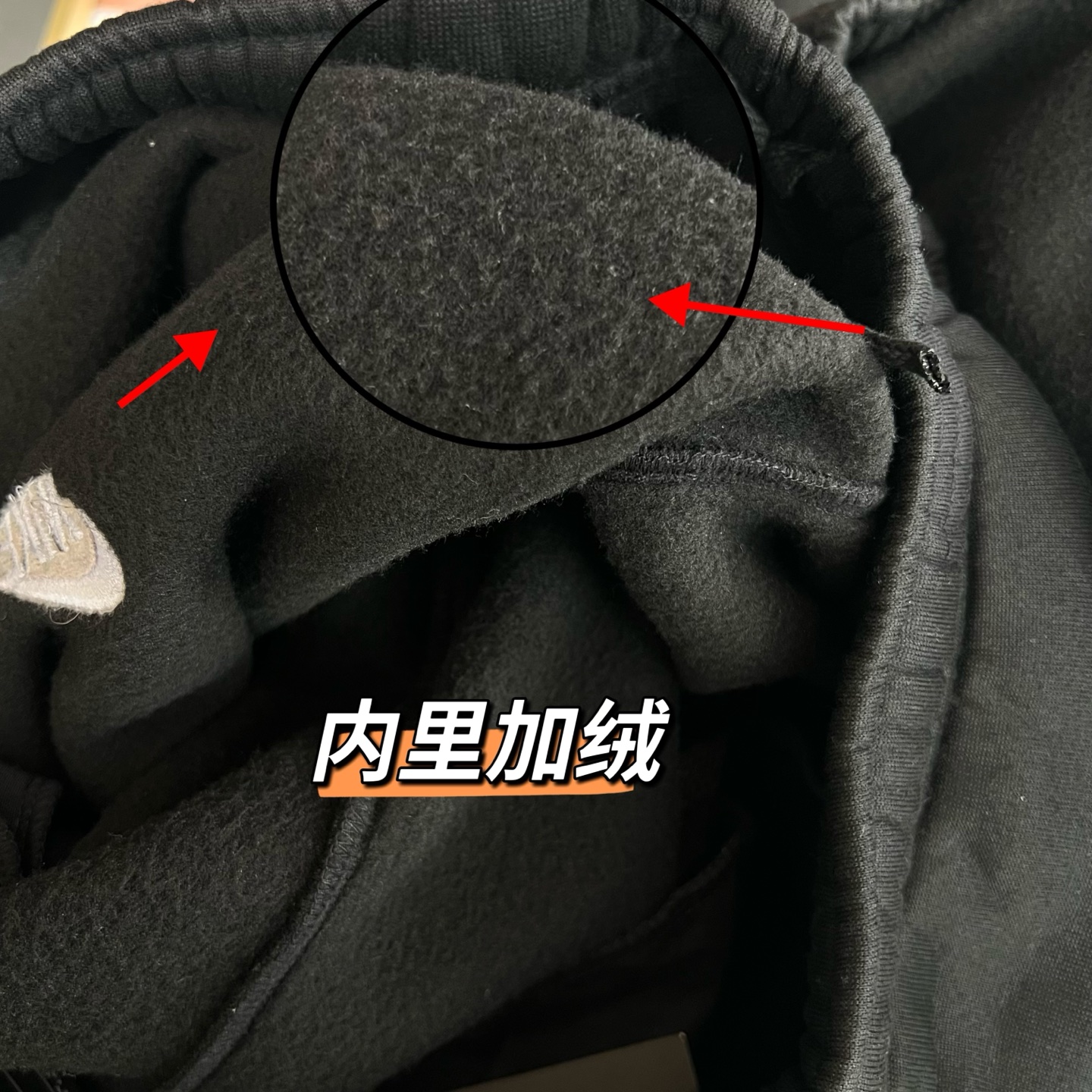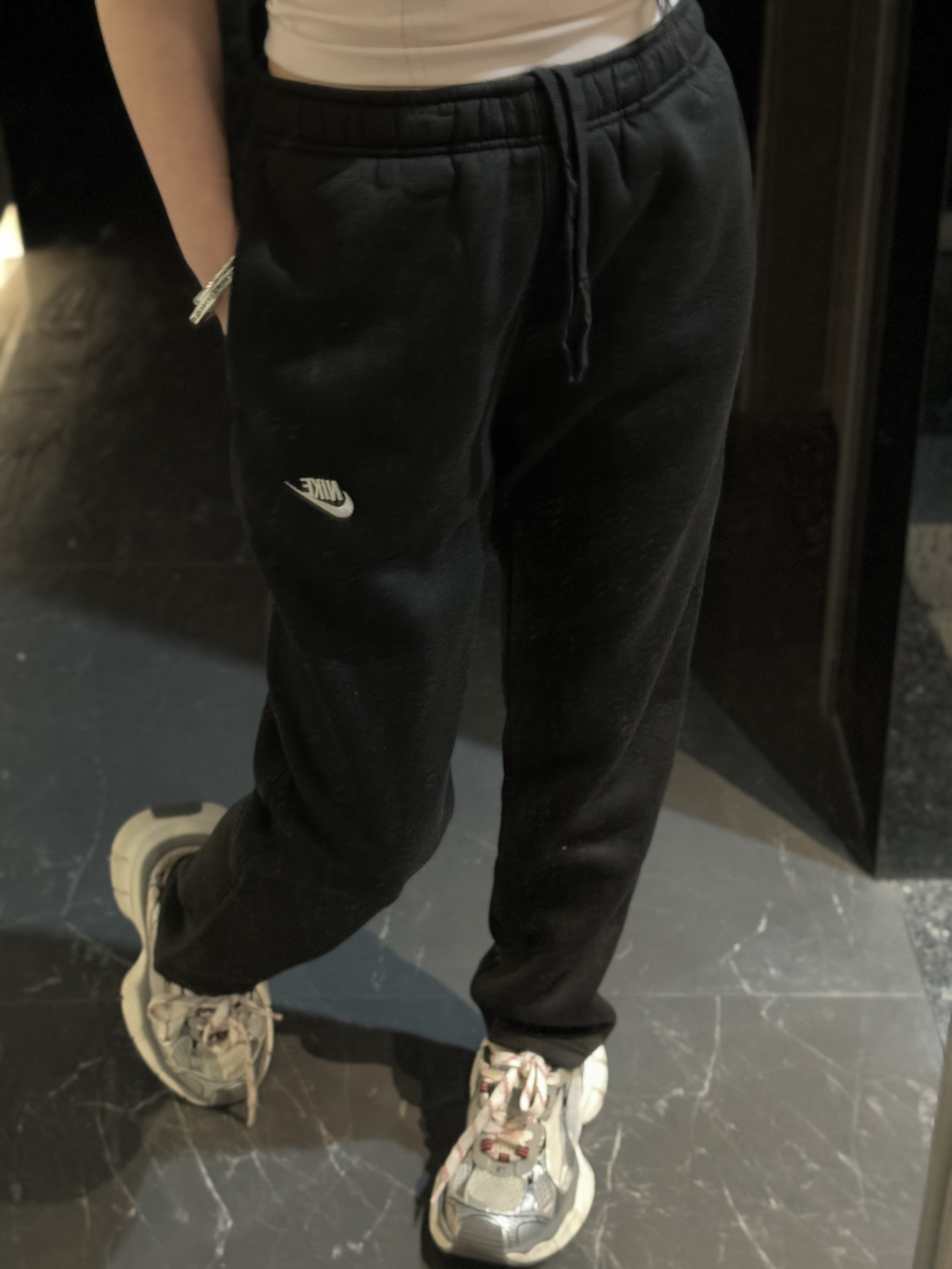 •裤腰是松紧带+抽绳设计😎,方便调节,腿外侧有白色的经典耐克小勾(Swoosh)刺绣Logo