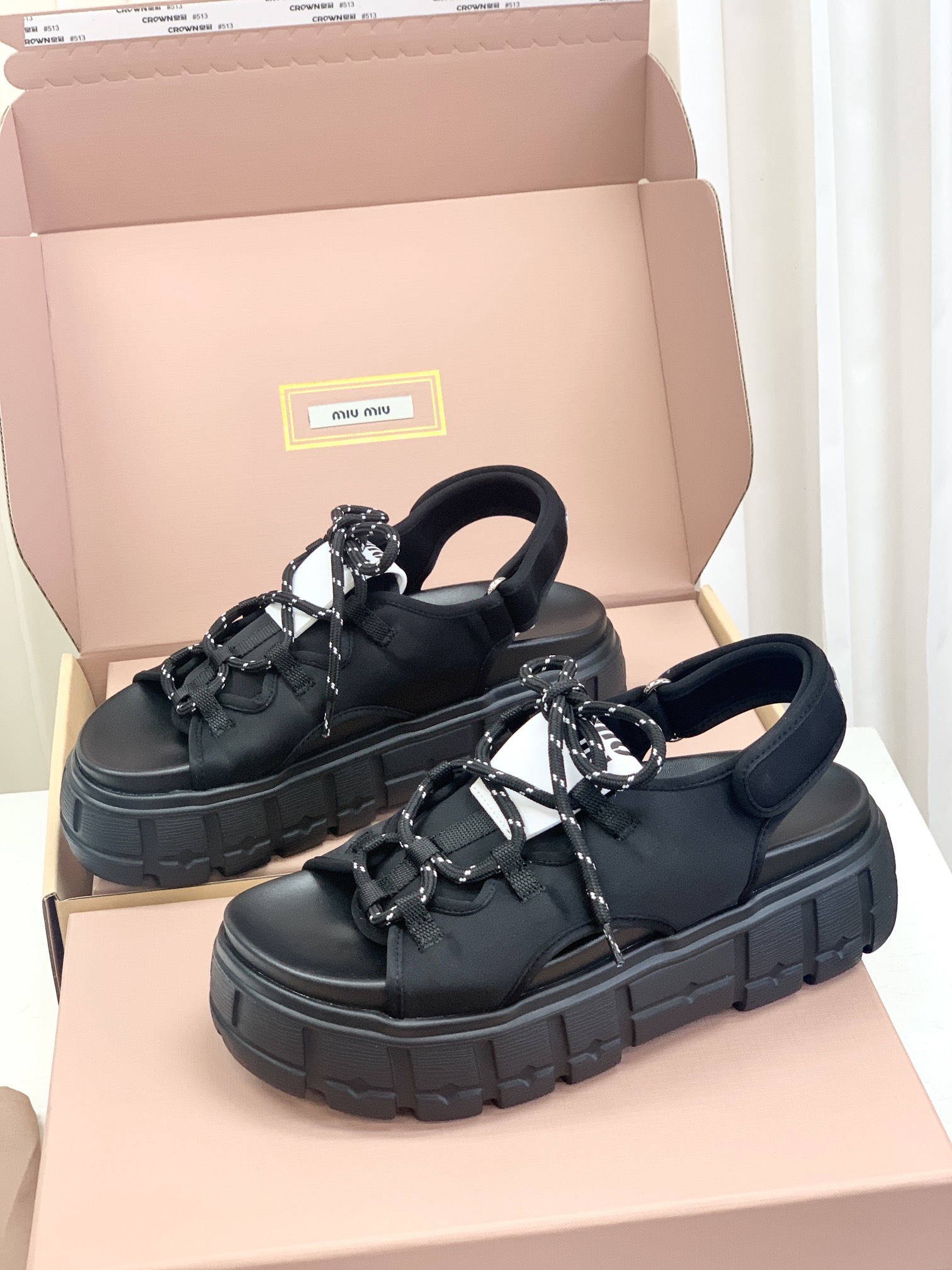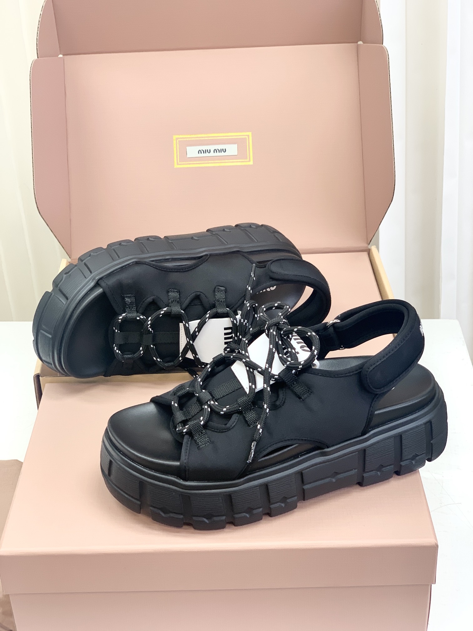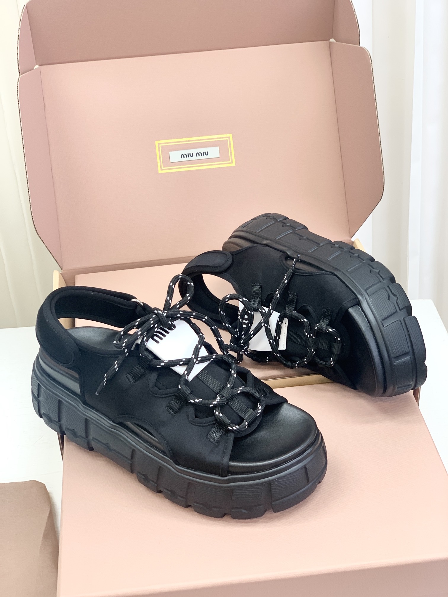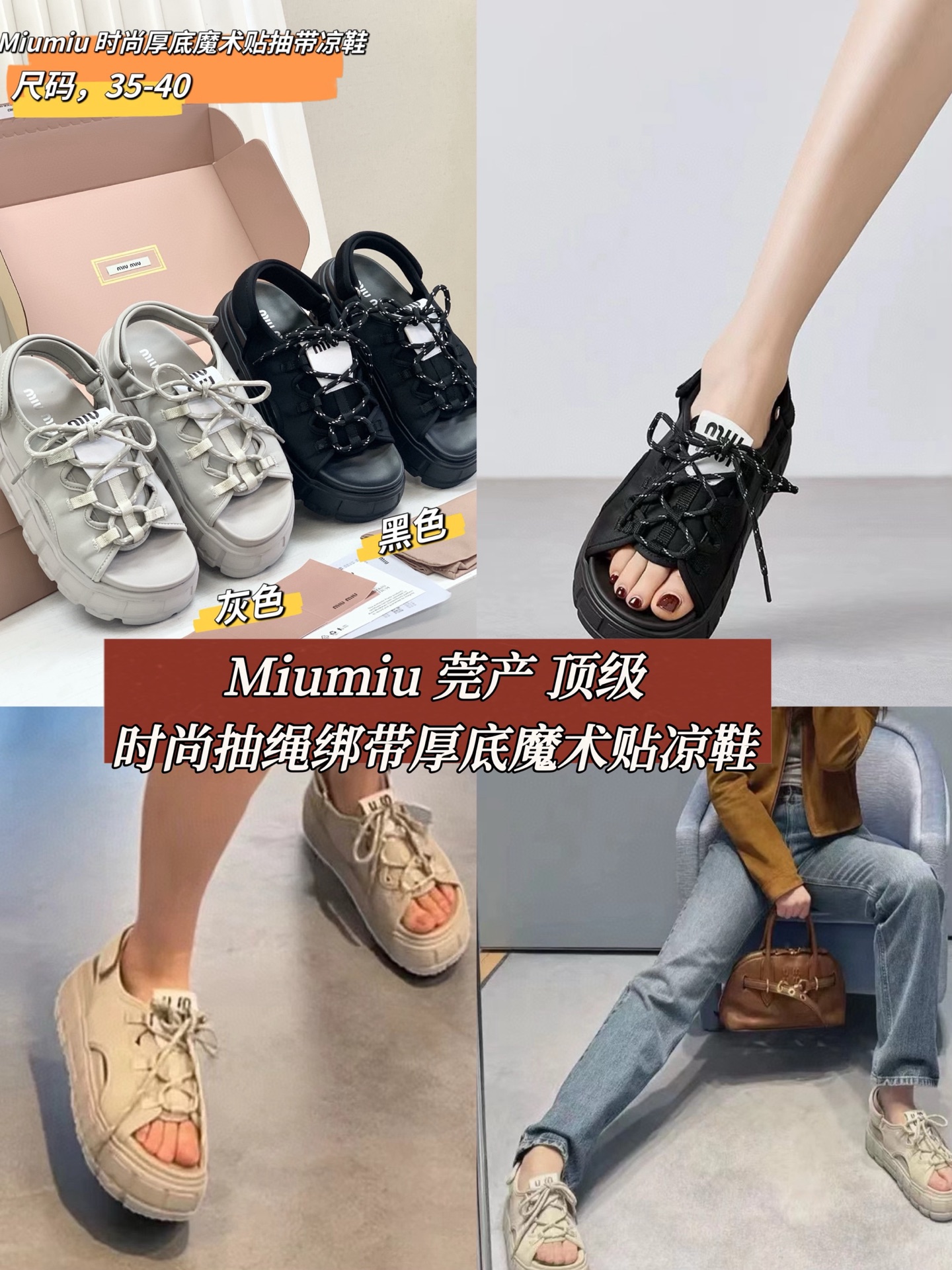 Miumiu,莞产,顶级,官网同步,2025专柜最新款,时尚抽绳绑带厚底魔术贴凉鞋‼️款式新颖时尚,一出场便是焦点,被追问无数次的夏日宝藏凉鞋,黑色款神秘而酷飒,低调中满是高级感,鞋面柔软细腻,随着步伐的移动,尽显奢华质感,温柔又清新,如同春日暖阳下的一缕微风,让你瞬间化身温柔女神 ,演绎随性优雅的气质!面料采用缎莱卡轻弹布,内里垫脚羊皮,柔软细腻,TPU模具发泡大底,底厚6cm!原盒包装,尺码,35 36 37 38 39 40 正码!