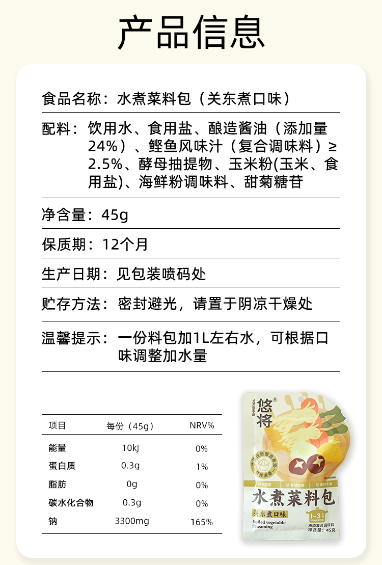 悠将 水煮菜料包关东煮口味45g/袋*10袋