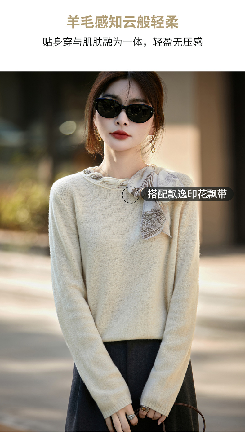 丁摩 蝴蝶结针织衫女新款流行丝巾精纺100羊毛针织打底衫BN860 商品图0