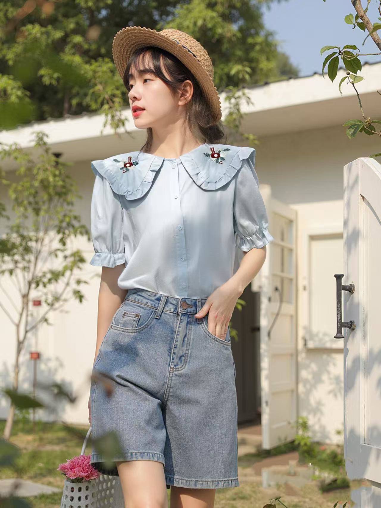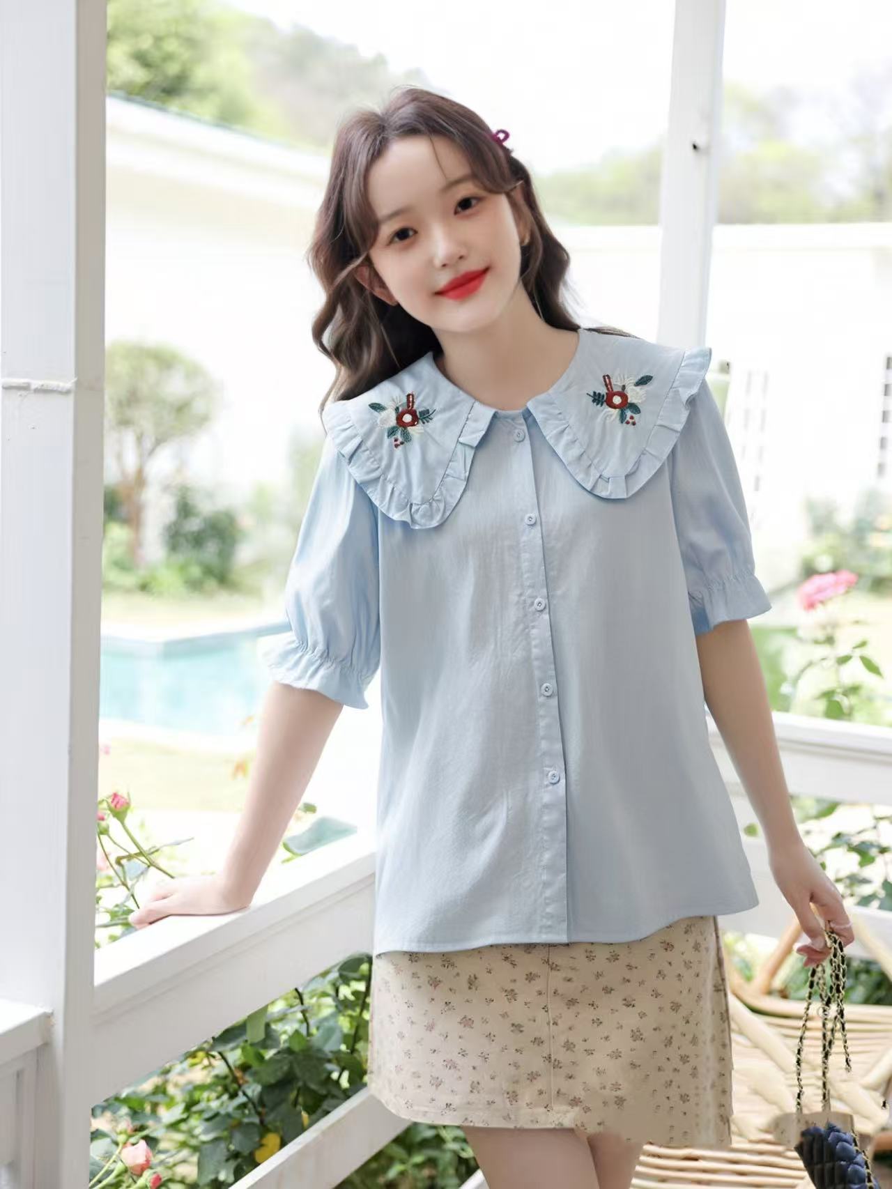 【韩系小衫】9931翻领刺绣花朵棉短袖小衫-喜出