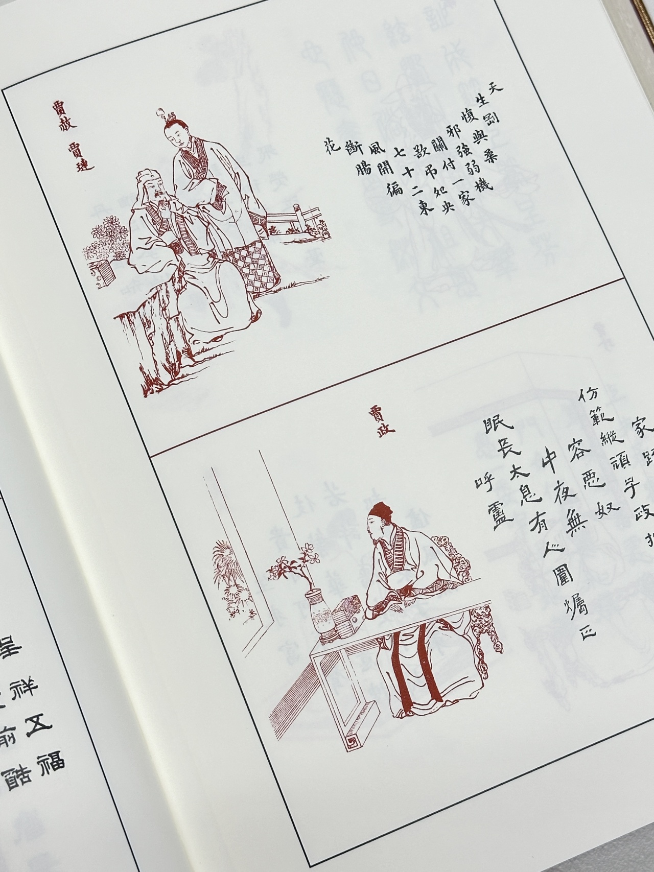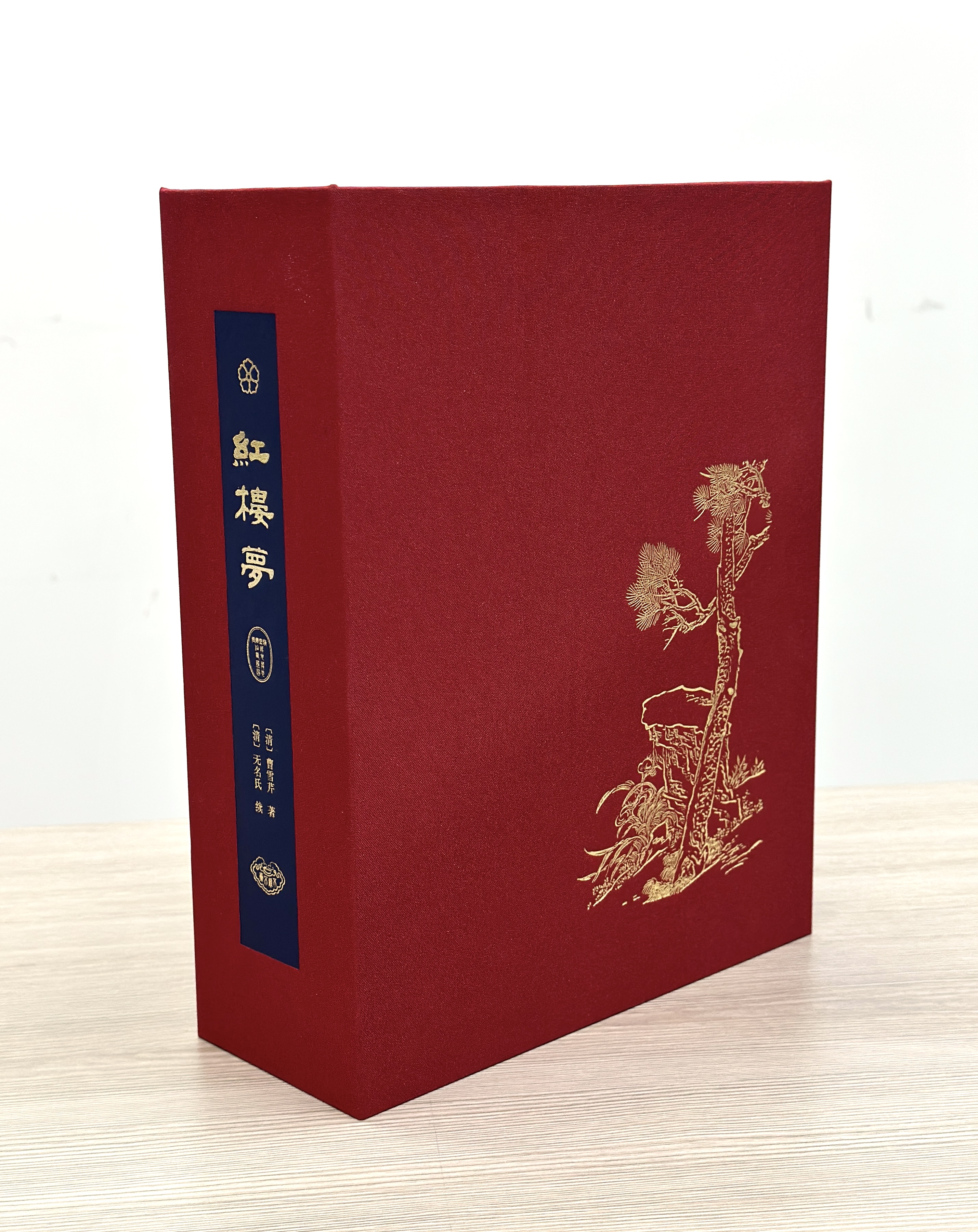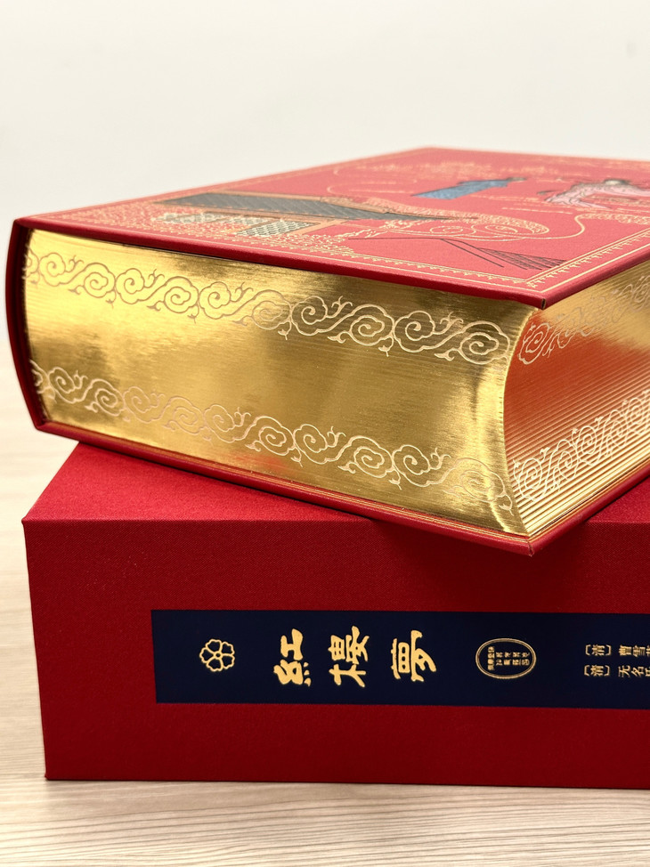 封面选用红色牛皮。封面烫印第五回插图贾宝玉神游太虚境,封底烫印第三十七回插图秋爽斋偶结海棠社。
