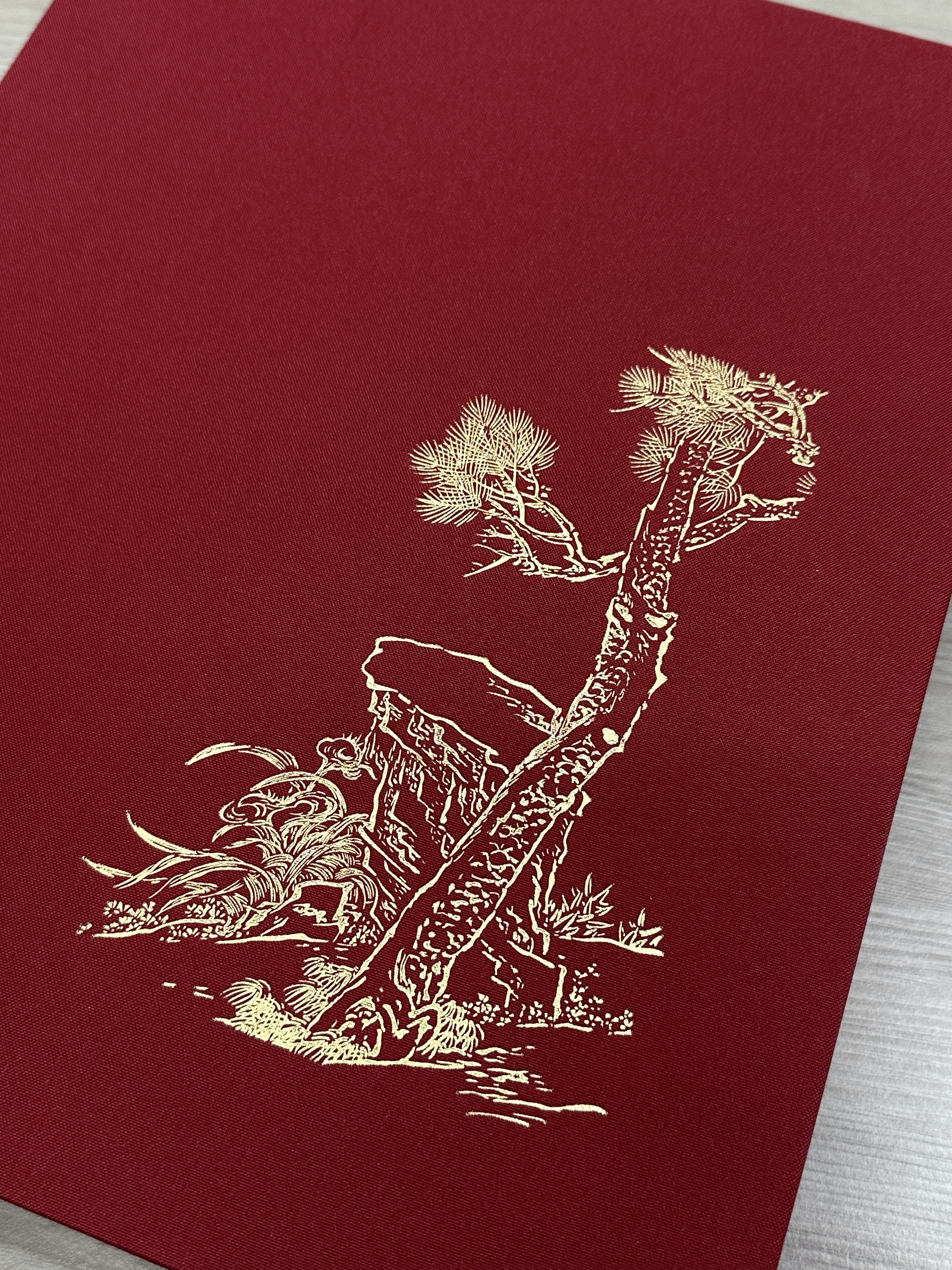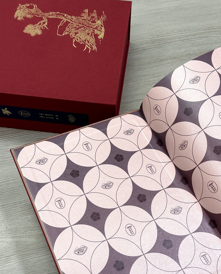前后环衬精选艺术纸四色印刷,封二、封三边框烫金。书口三面鎏金,激光雕刻祥云纹饰。
