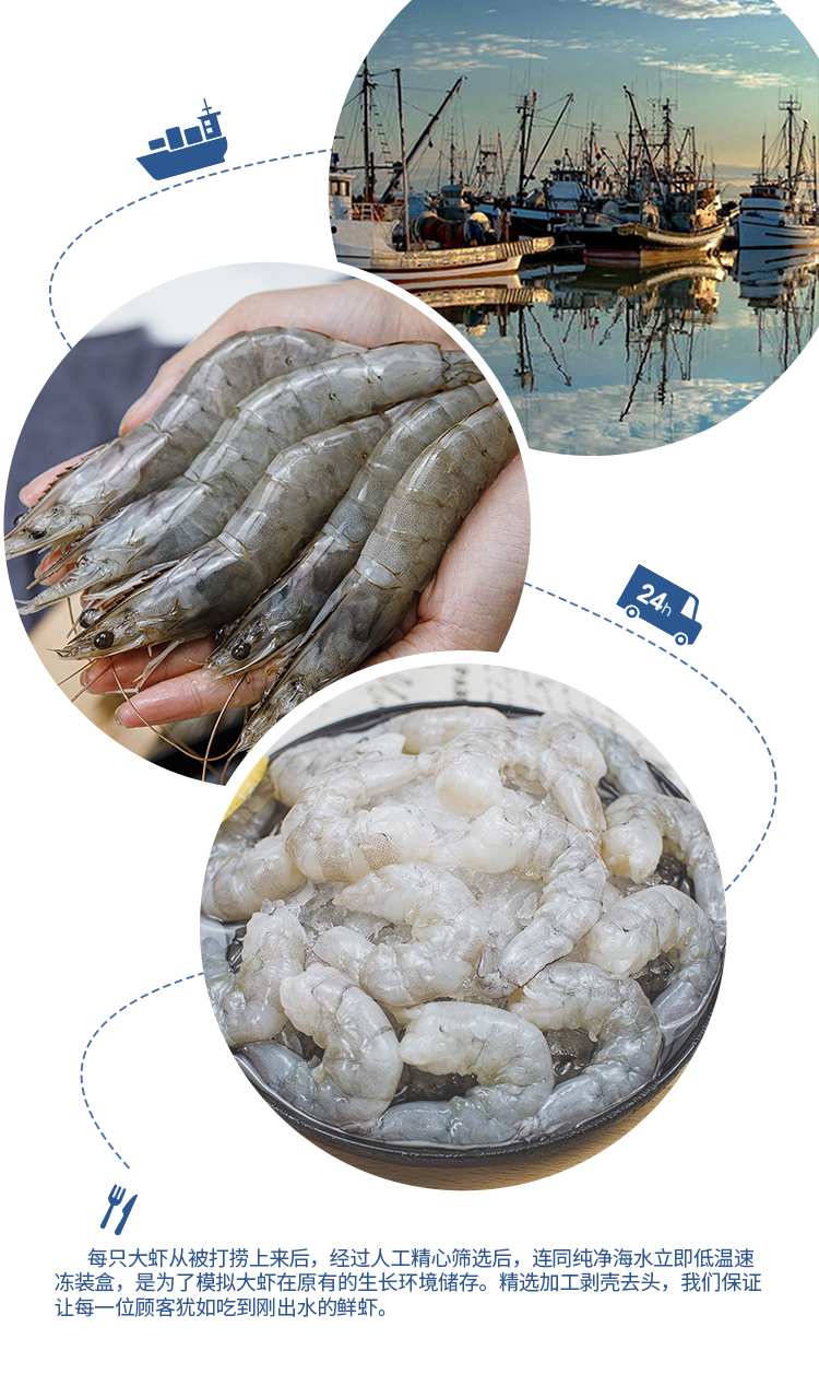 (为了模拟大虾原来的生长环境,每只大虾从被打捞上来,立刻进行人工筛选,便会连同纯净海水立刻低温速冻,这样储存的虾肉才会自然鲜甜。)