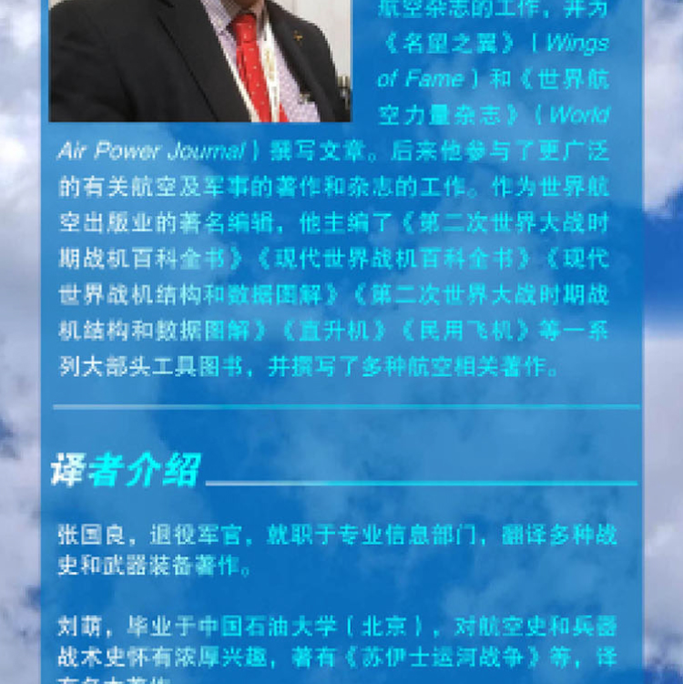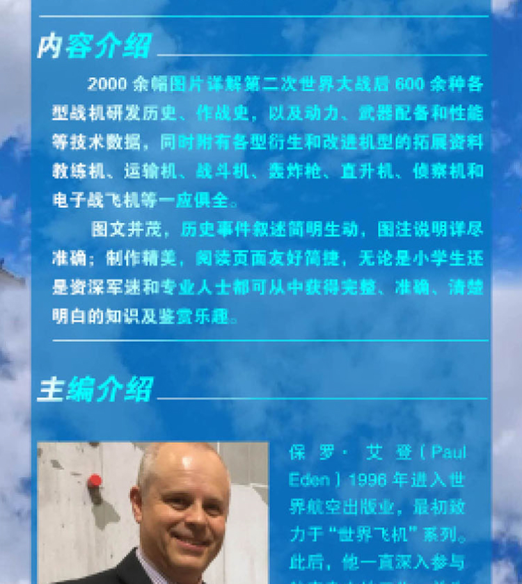 保罗·艾登(Paul Eden)1996年进入世界航空出版业,最初致力于“世界飞机”系列。此后,他一直深入参与航空杂志的工作,并为《名望之翼》(Wings of Fame)和《世界航空力量杂志》(World Air Power Journal)撰写文章。后来他参与了更广泛的有关航空及军事的著作和杂志的工作。作为世界航空出版业的著名编辑,他主编了《第二次世界大战时期战机百科全书》《现代世界战机百科全书》《现代世界战机结构和数据图解》《第二次世界大战时期战机结构和数据图解》《直升机》《民用飞机》等一系列大部头工具图书,并撰写了多种航空相关著作。