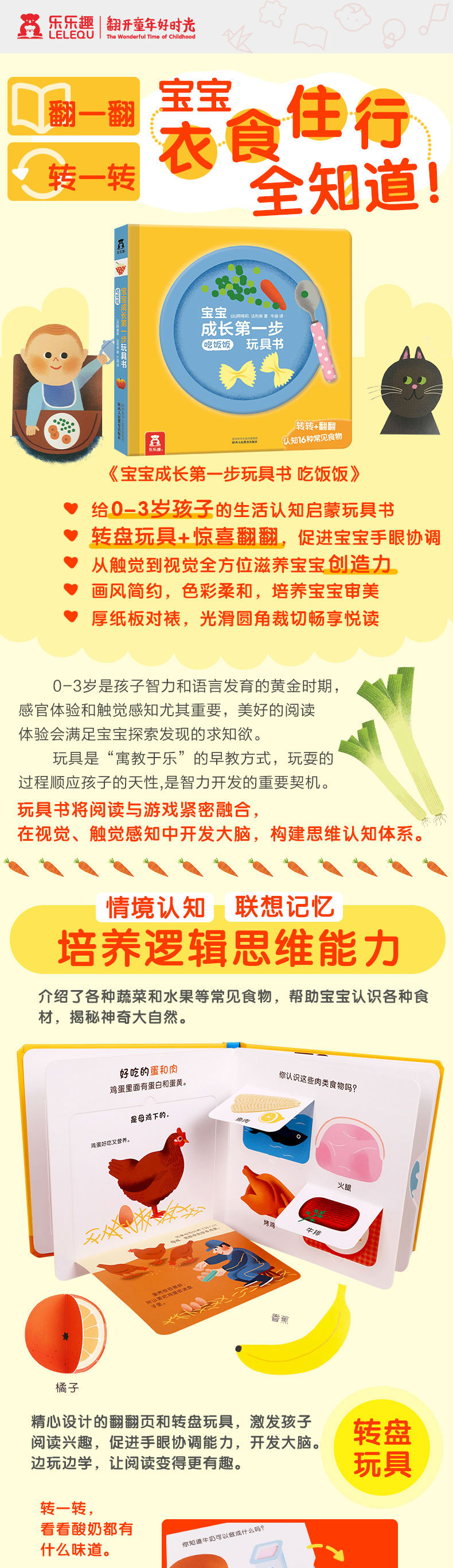 这本书介绍了各种蔬菜和水果等常见的食物,左侧大翻翻页下面是这些食物的生产和成长过程,另外每一页还有对同类食物的拓展认知,包括食物的搭配、料理、内部构造,帮助宝宝认识各种食材,揭秘神奇的大自然。宝宝可以通过转盘选择自己喜欢吃的食物,增强互动性,引导宝宝动手动脑。