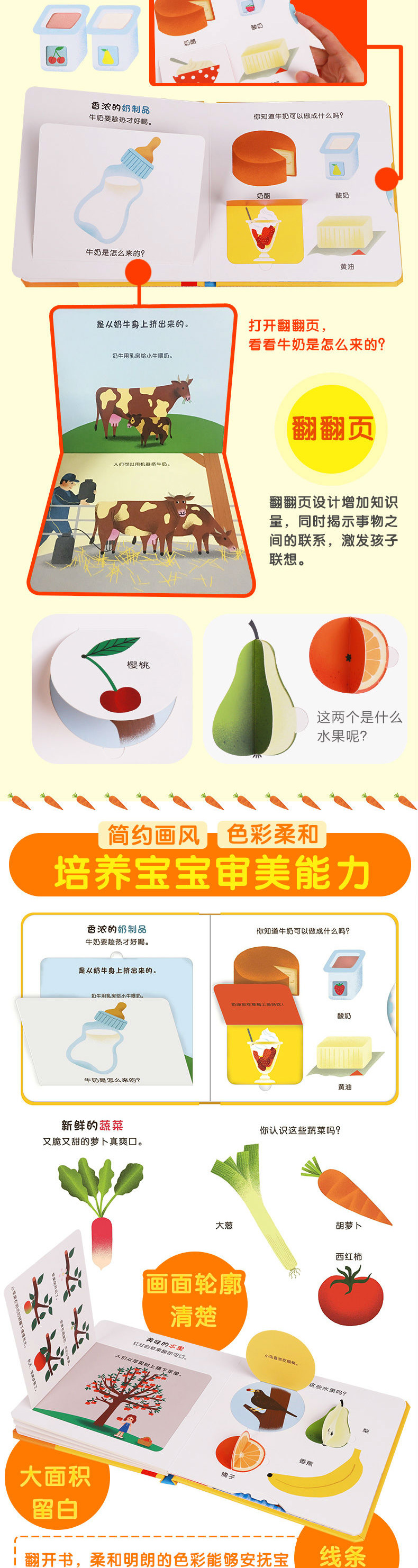 首先翻开书,宝宝看到的都是自己熟悉的事物,会有一种亲切感,愿意去继续翻下去。