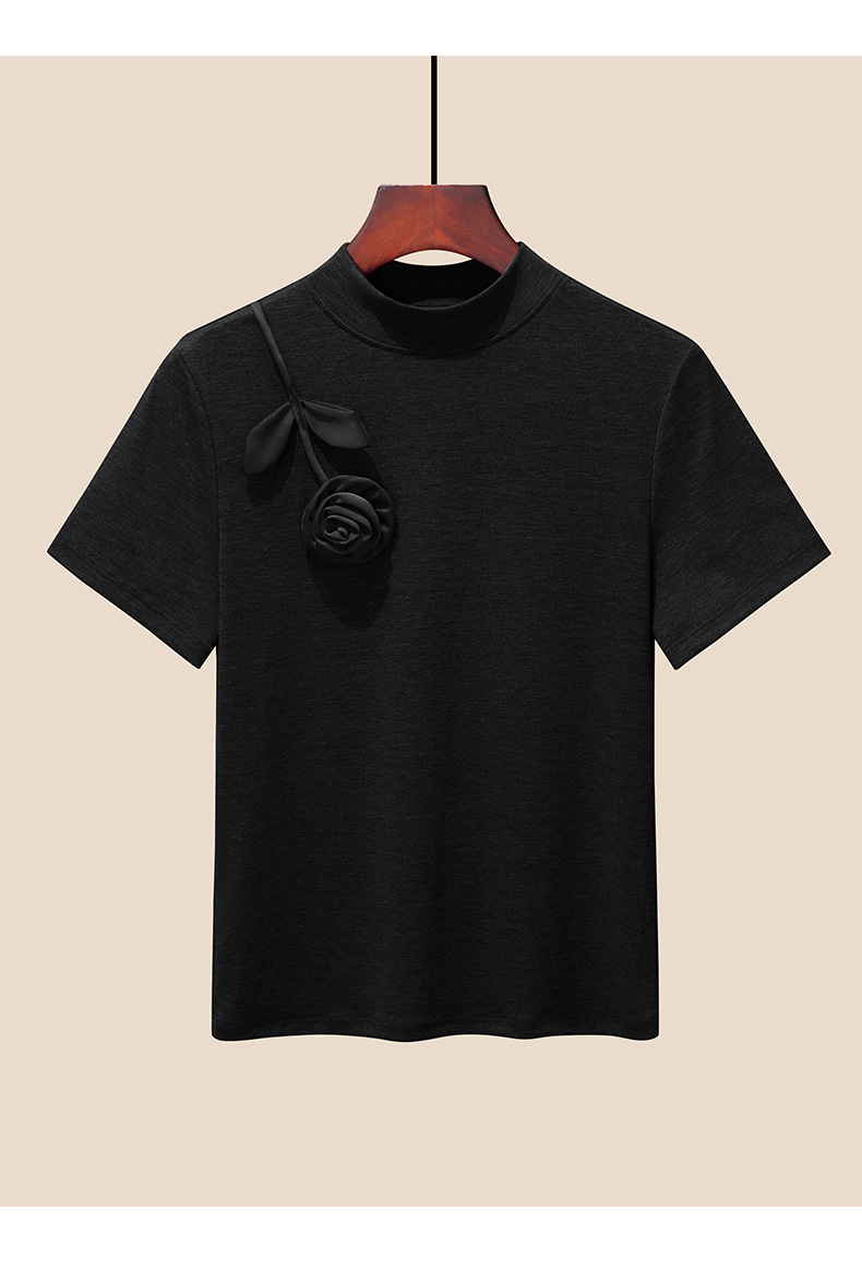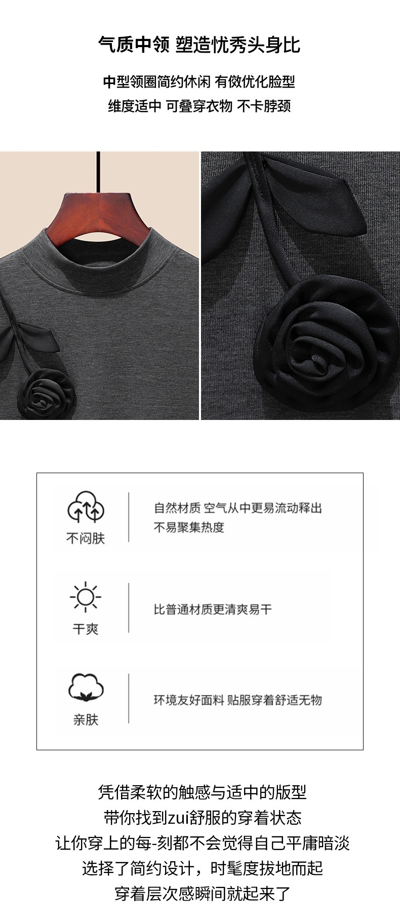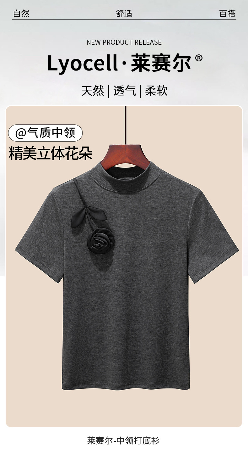 「自j」全新升级【铂金会员119/天猫159/差价40】(03560)洛诗琳莱赛尔天丝花朵T恤2025早秋正肩显瘦半高领打底上衣