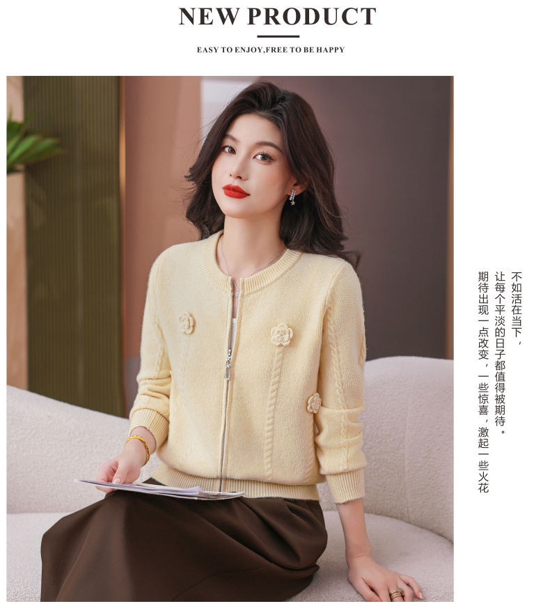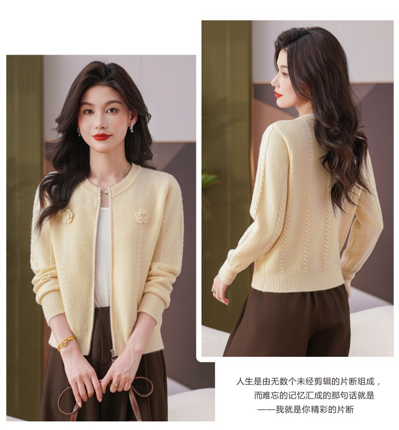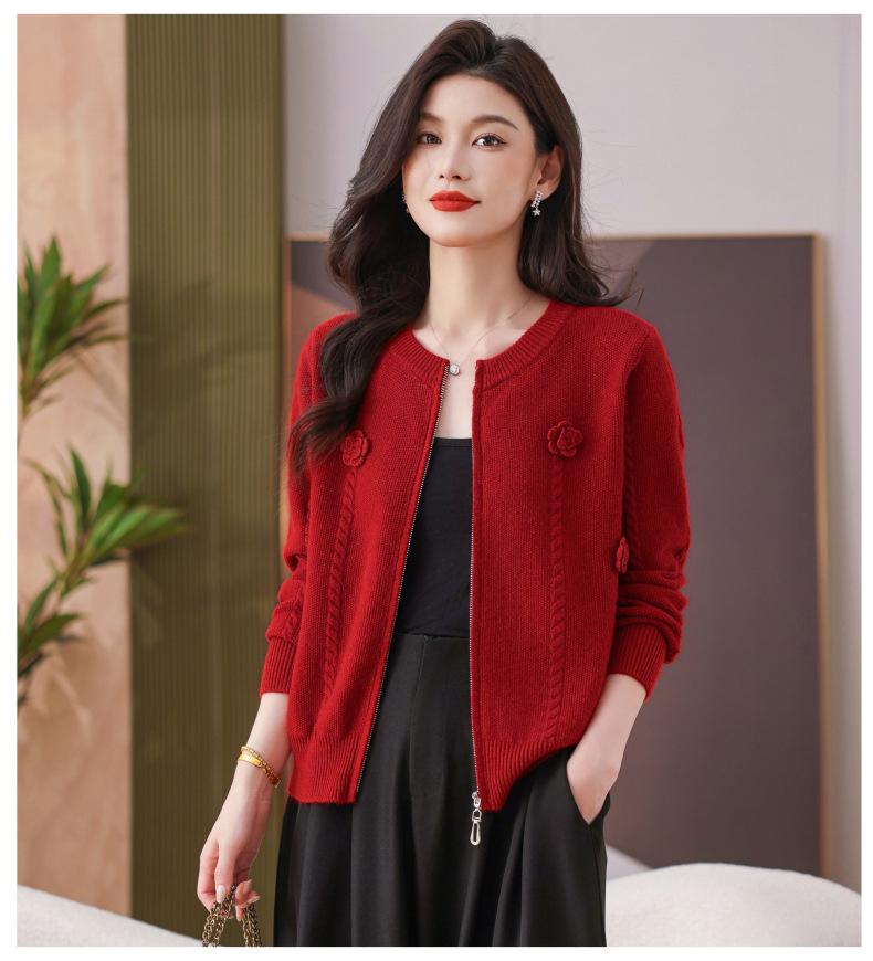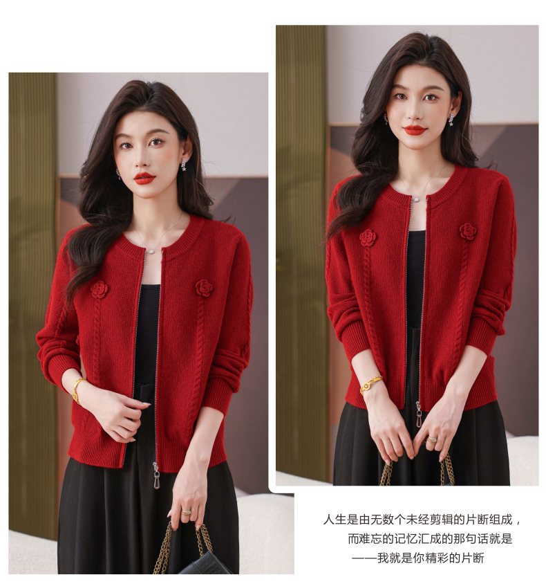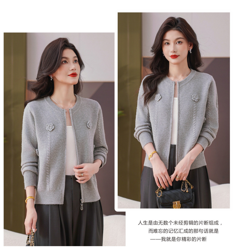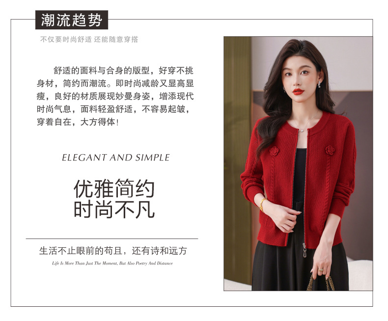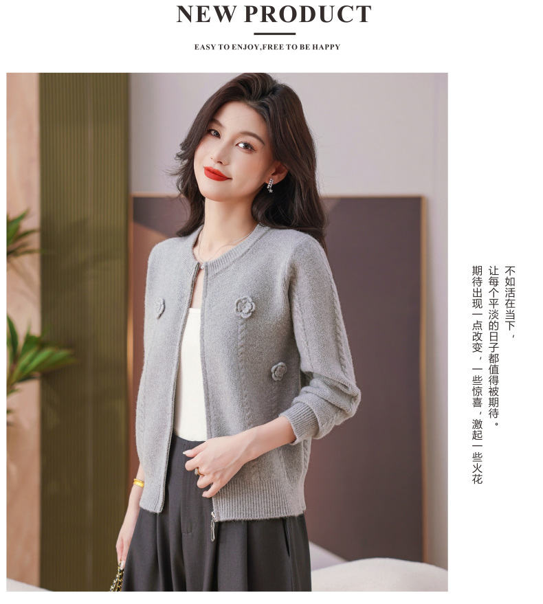 CC圆领拉链休闲女士短外套2025秋季新款立体花朵针织开衫春秋棒球服
