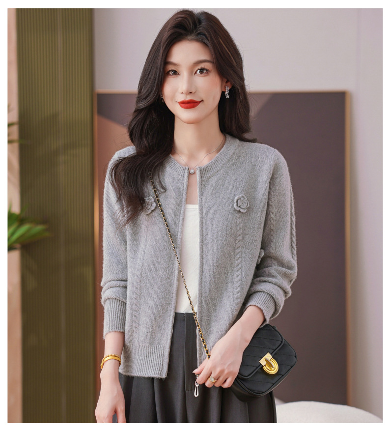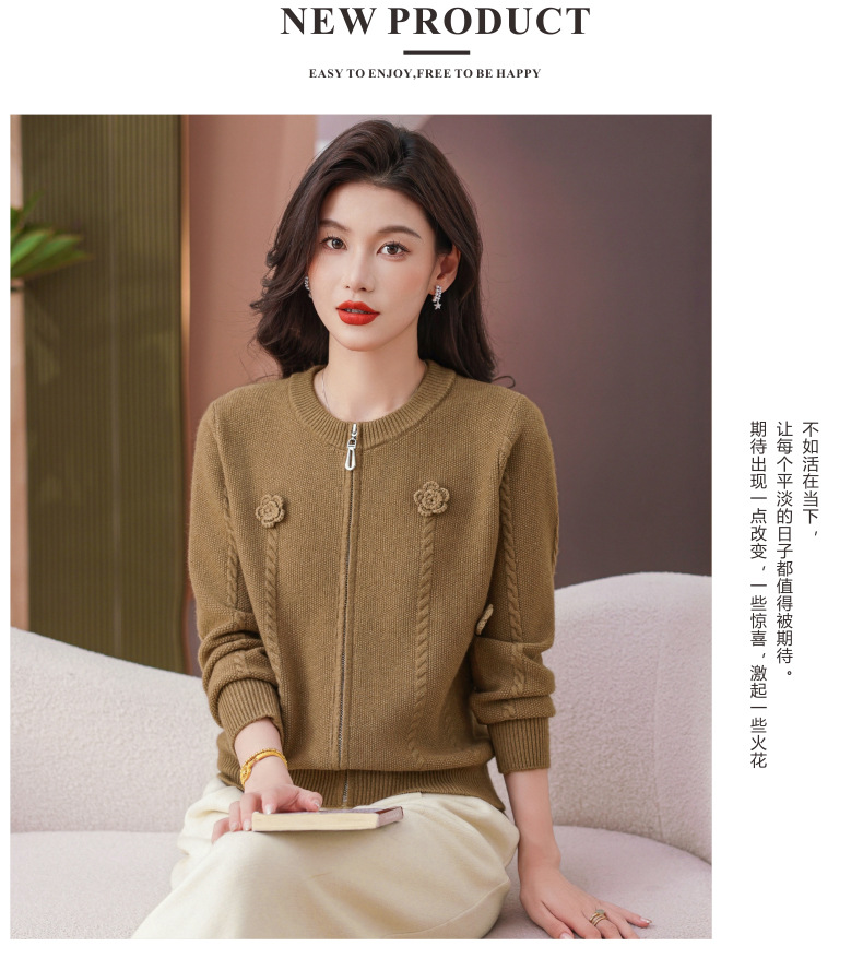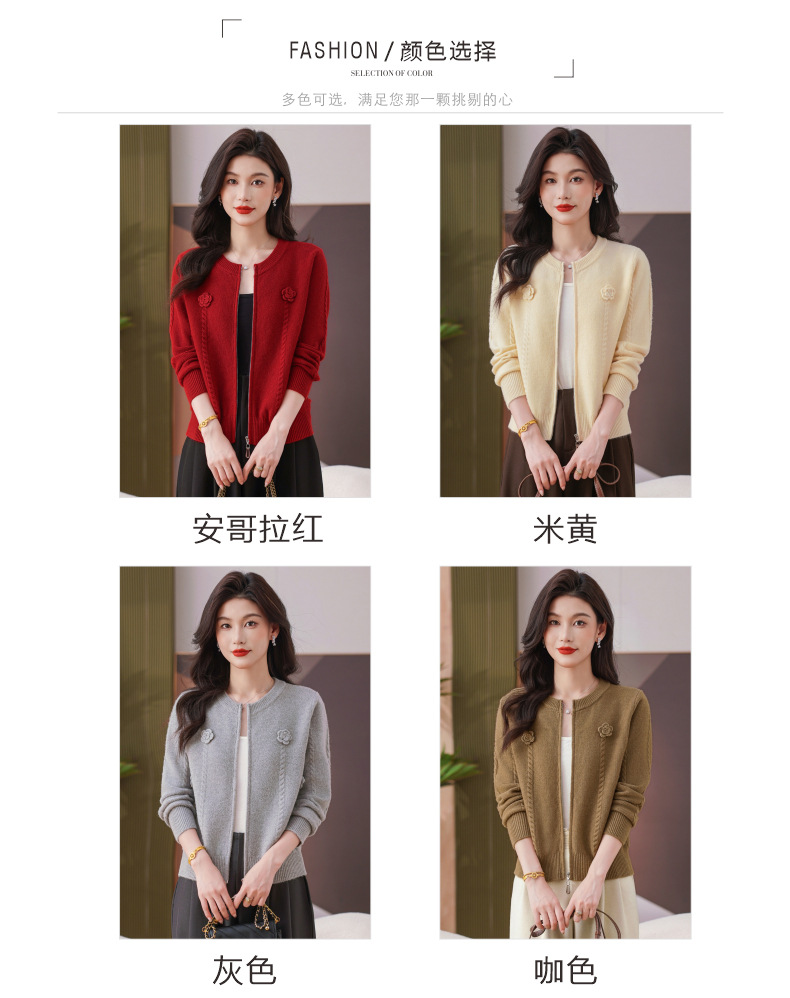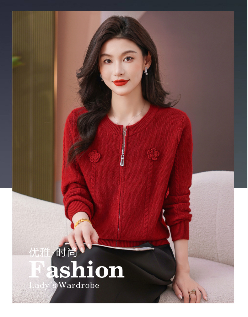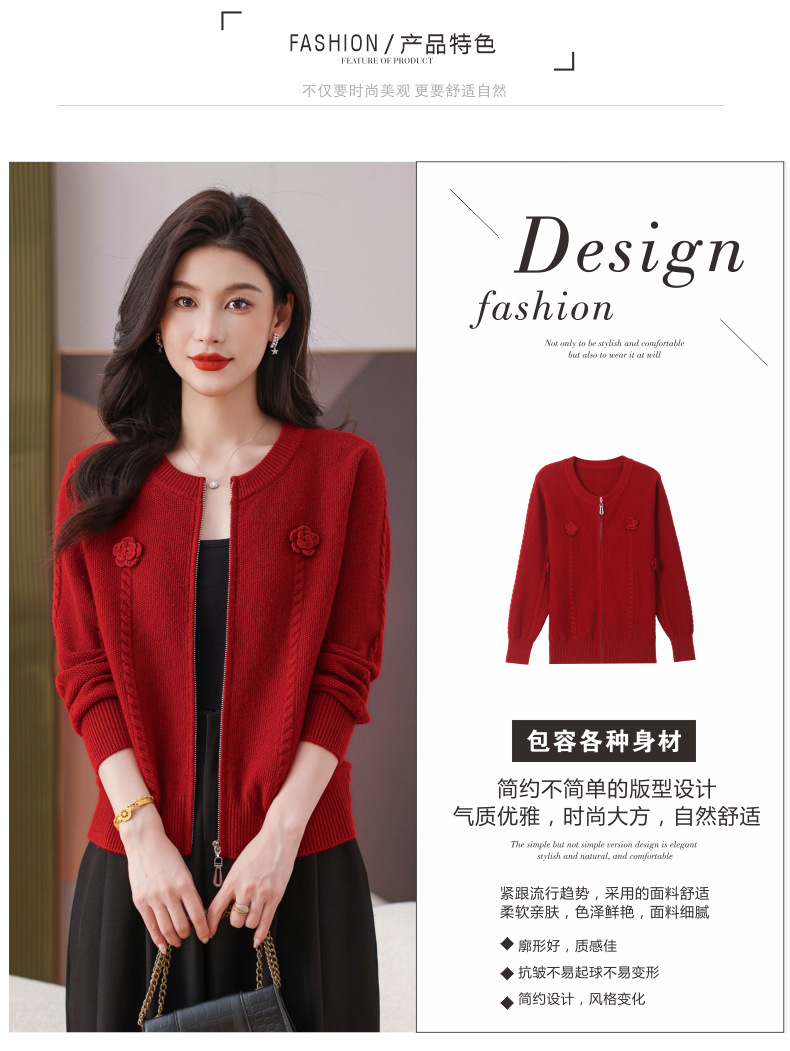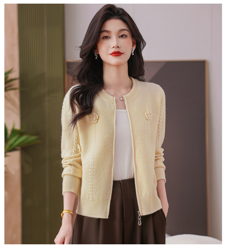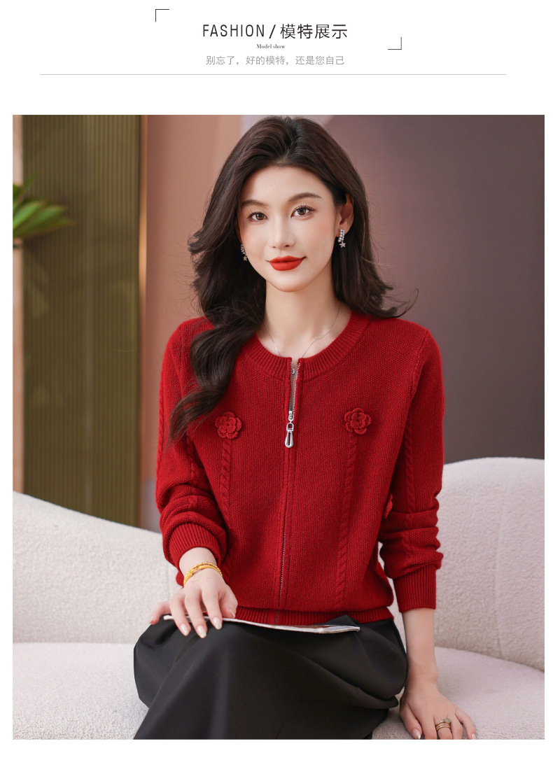 CC圆领拉链休闲女士短外套2025秋季新款立体花朵针织开衫春秋棒球服