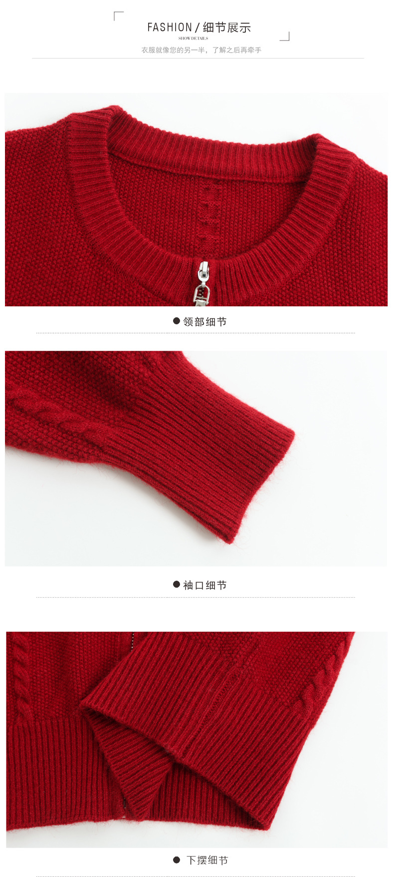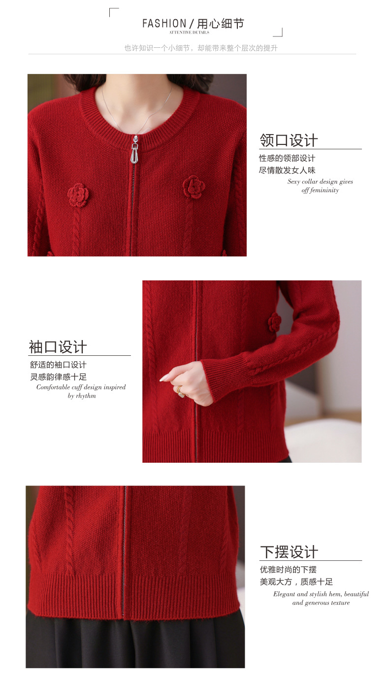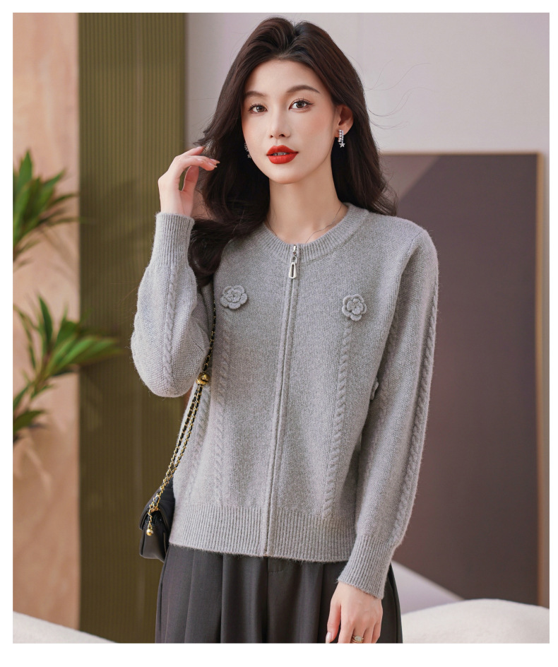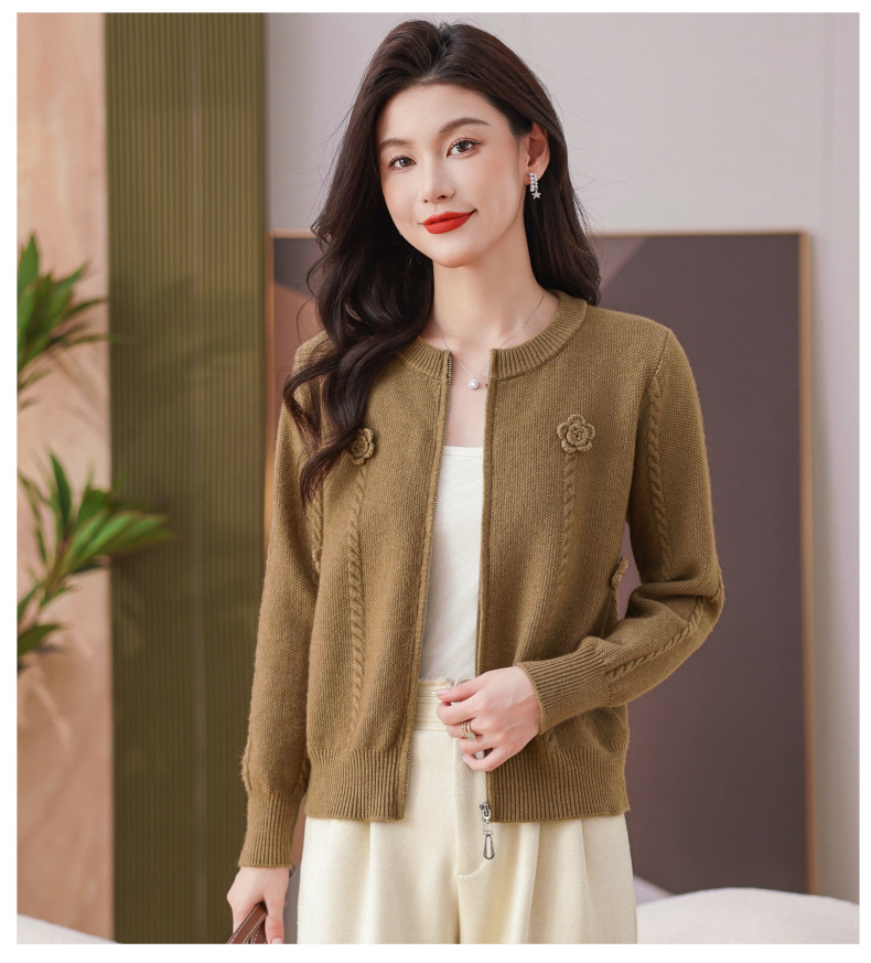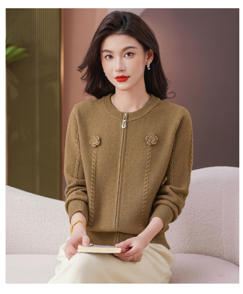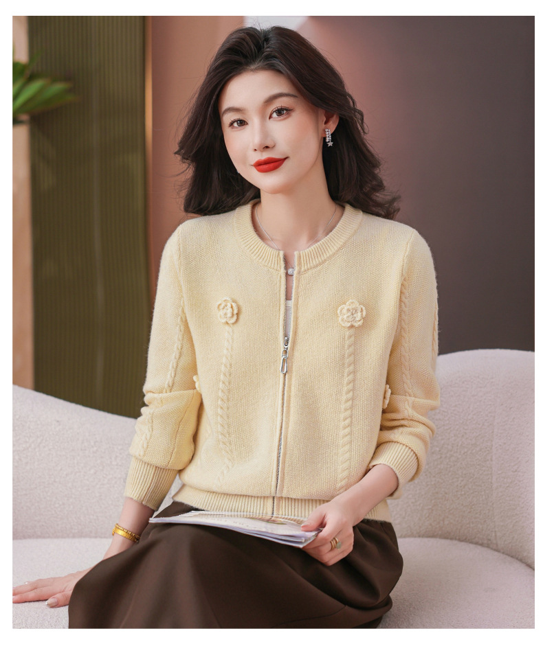CC圆领拉链休闲女士短外套2025秋季新款立体花朵针织开衫春秋棒球服
