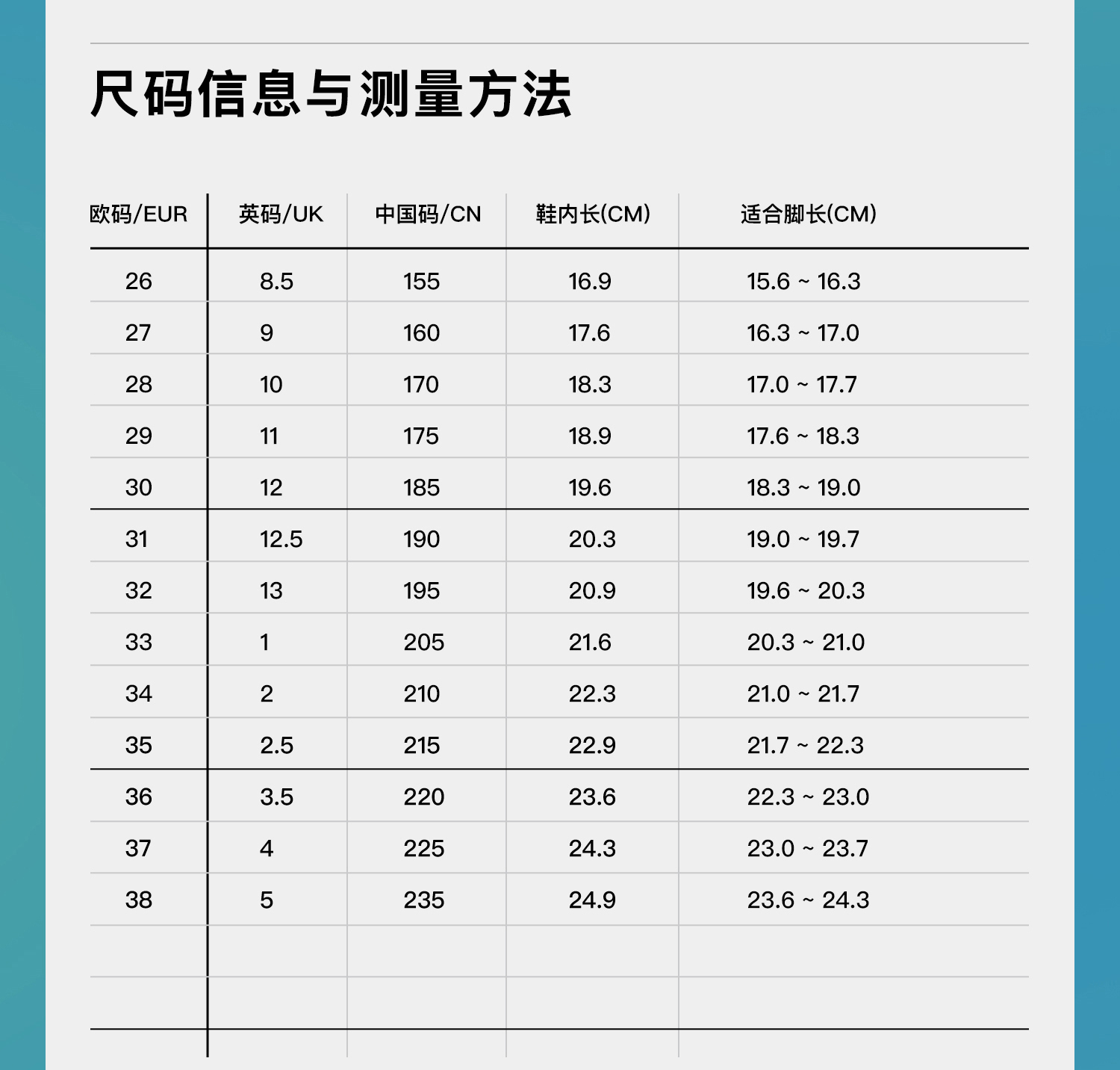 2、鞋内标签:UK对应尺码表的英码,EUR对应尺码表的欧码,CN为中国尺码,因宝宝脚丫胖瘦高矮不一,不建议参考中国尺码选择,且CN不在尺码表呈现。(可参考尺码表适合脚长的范围进行选择)
