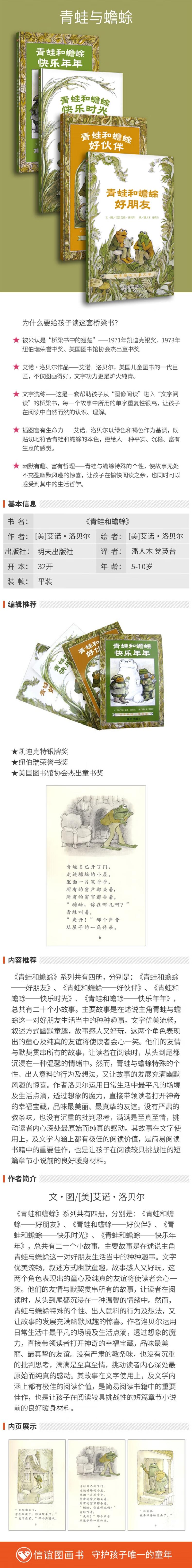 《青蛙和蟾蜍》系列共有四册,分别是:《青蛙和蟾蜍──好朋友》《青蛙和蟾蜍──好伙伴》《青蛙和蟾蜍──快乐时光》《青蛙和蟾蜍──快乐年年》,总共有二十个小故事,讲述主角青蛙与蟾蜍这一对好朋友生活当中的种种趣事。文字优美流畅,叙述方式幽默童趣,故事感人又好玩,这两个角色表现出的童心及纯真的友谊将使读者会心一笑。他们的友情与默契贯穿**的故事,让读者在阅读时,从头到尾都沉浸在一种温馨的情绪中。然而,青蛙与蟾蜍特殊的个性、出人意料的行为及想法,又让故事的发展充满幽默风趣的惊喜。作者洛贝尔运用日常生活中*平凡的场景及生活点滴,通过想象的魔力,直接带领读者打开神奇的幸福宝藏,品味*美丽、真挚的友谊。没有严肃的教条味,也没有沉重的批判思考,满满是至真至情,挑动读者内心深处*原始而纯真的感动。其故事在文字使用上及文学内涵上都有**的阅读价值,是简易阅读书籍中的重要佳作,也是孩子在阅读较具挑战性的短篇章节小说前的良好暖身材料。