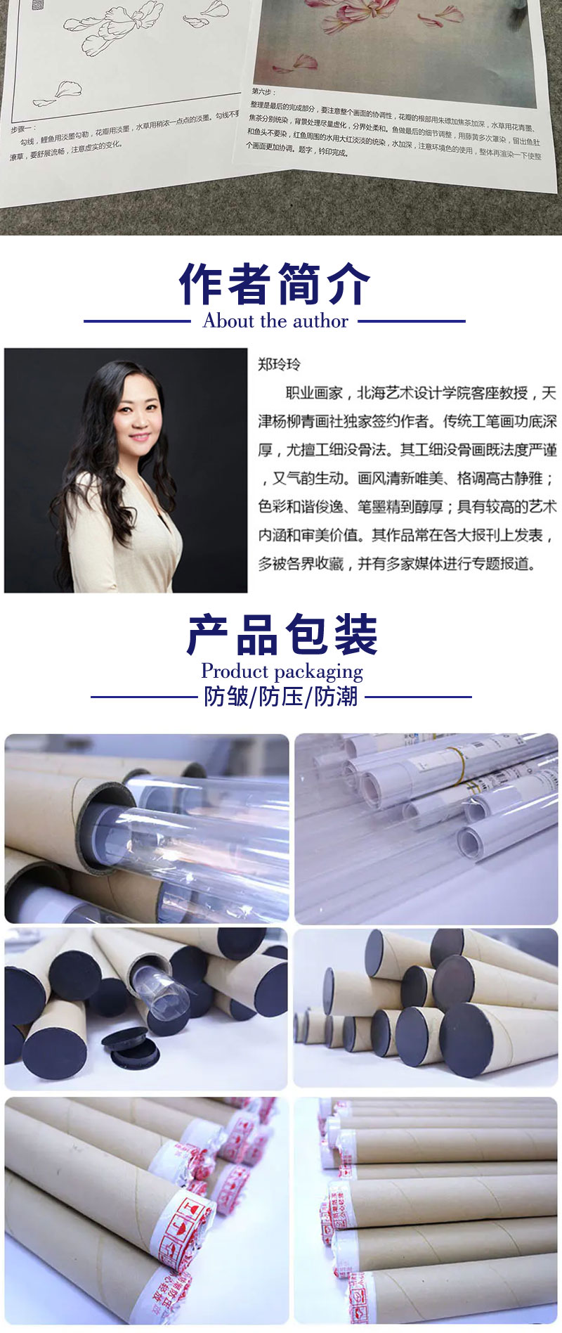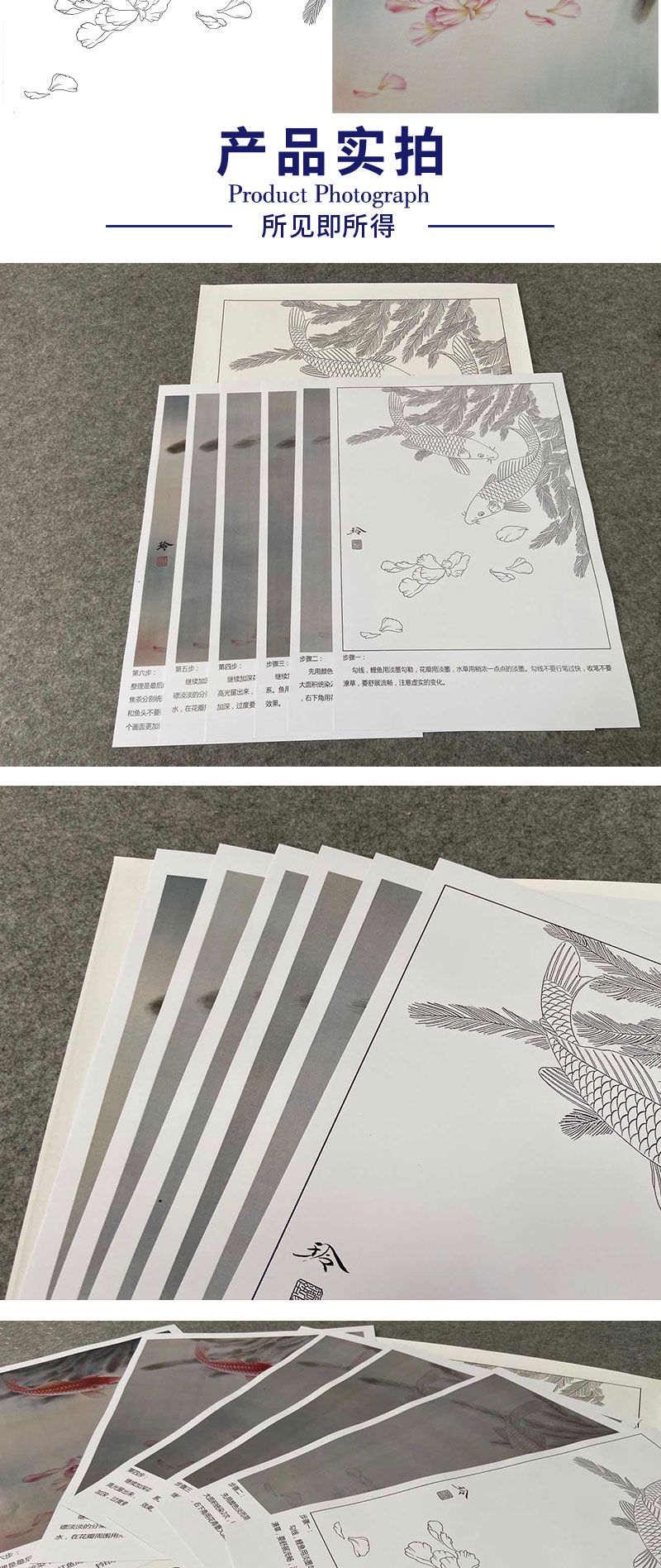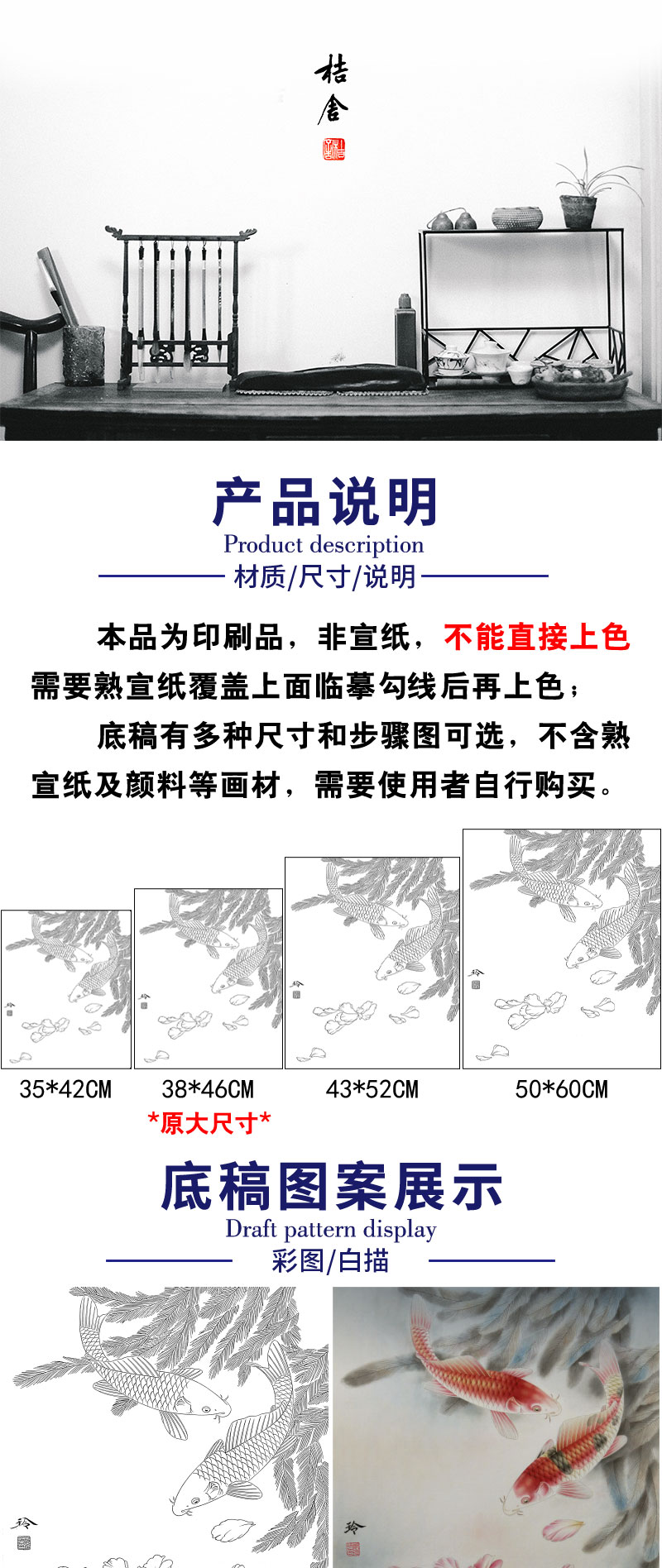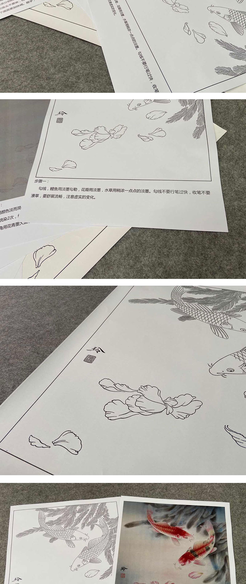 【有步骤、大彩图】郑玲玲工笔画白描底稿小品《竟自游》鲤鱼初学者临摹花鸟线稿ZL28