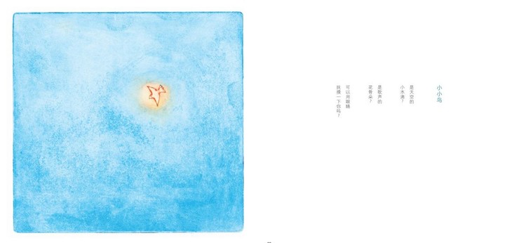 也许可以这么说,只有优秀的童诗才能成就优秀的插图,如果童诗失败了,那么再好的绘画也无法弥补这种裂隙,这也是童诗绘本存在的本真。绘本的形式在于它构造了一个极具诱惑的立场——在短暂庇护儿童心灵的同时,也在铺展未来可供塑造他们的东西,比如色彩、线条、故事中释放出来的语言奇迹等。