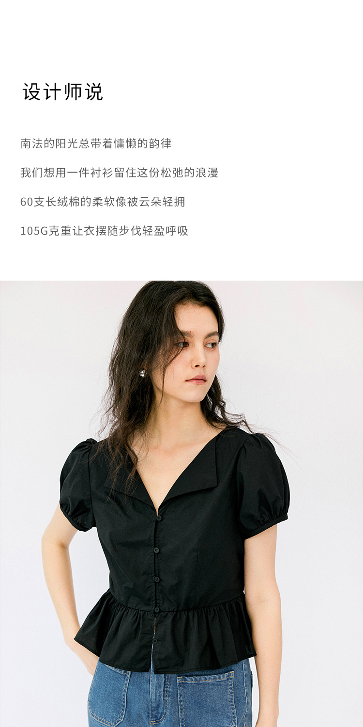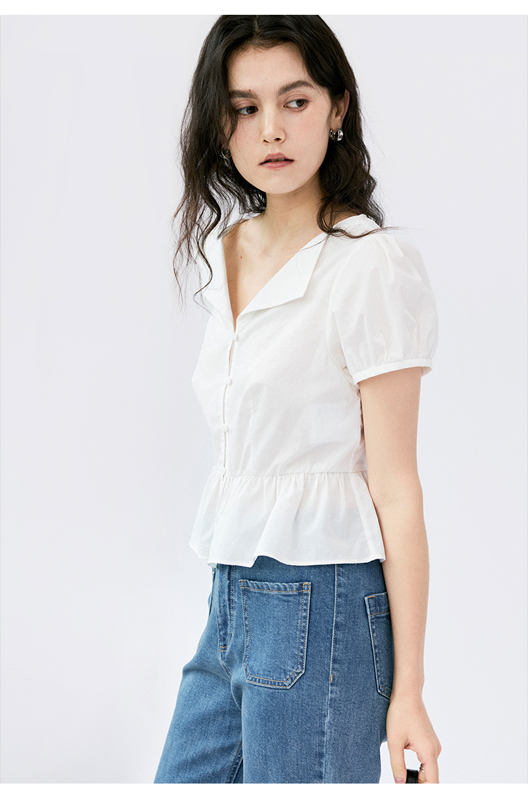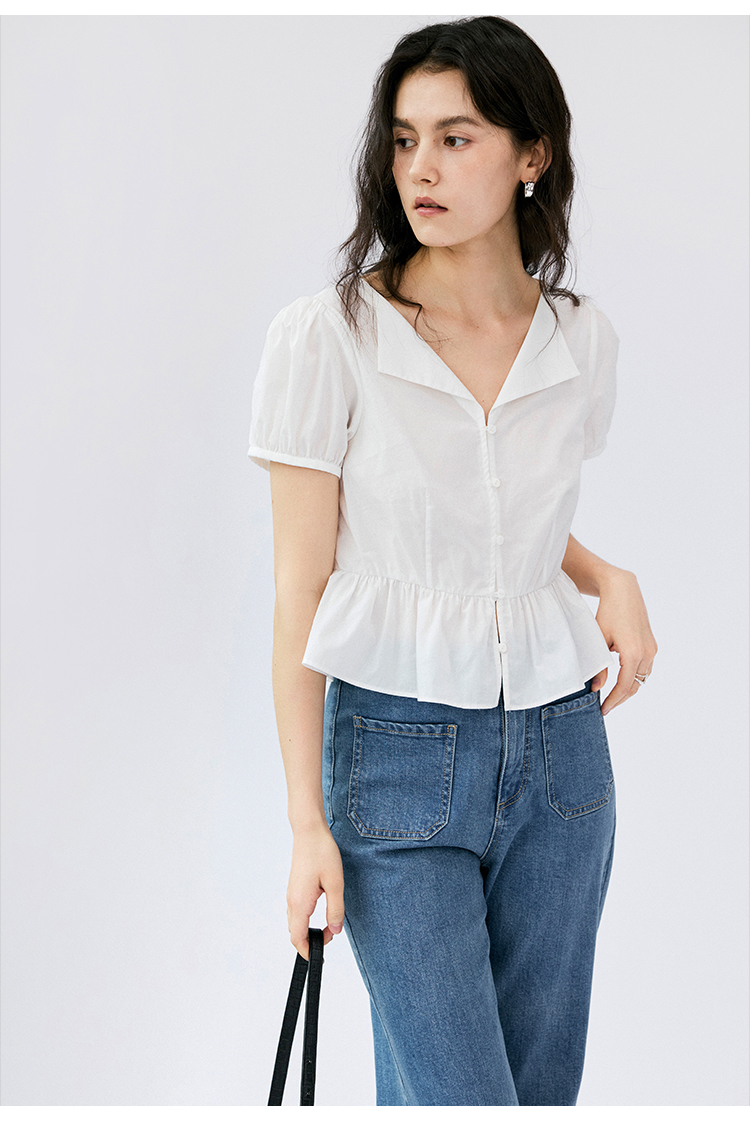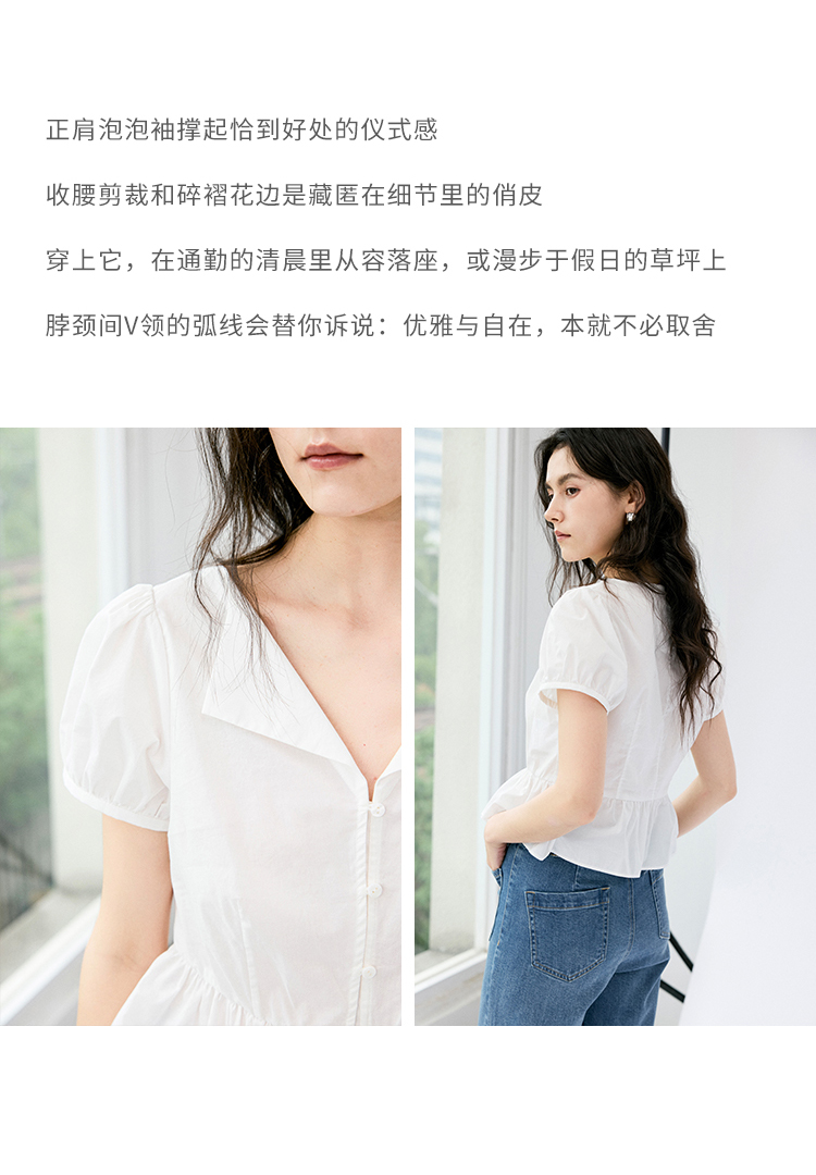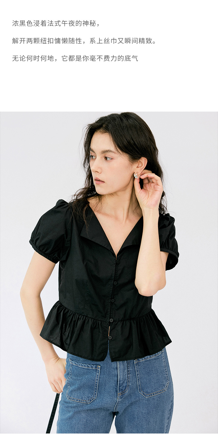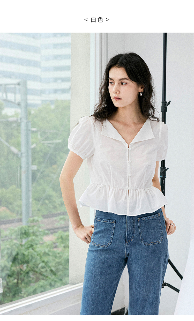 HeyDress法式翻领衬衫女夏季复古收腰纯棉短袖通勤短款泡泡袖上衣