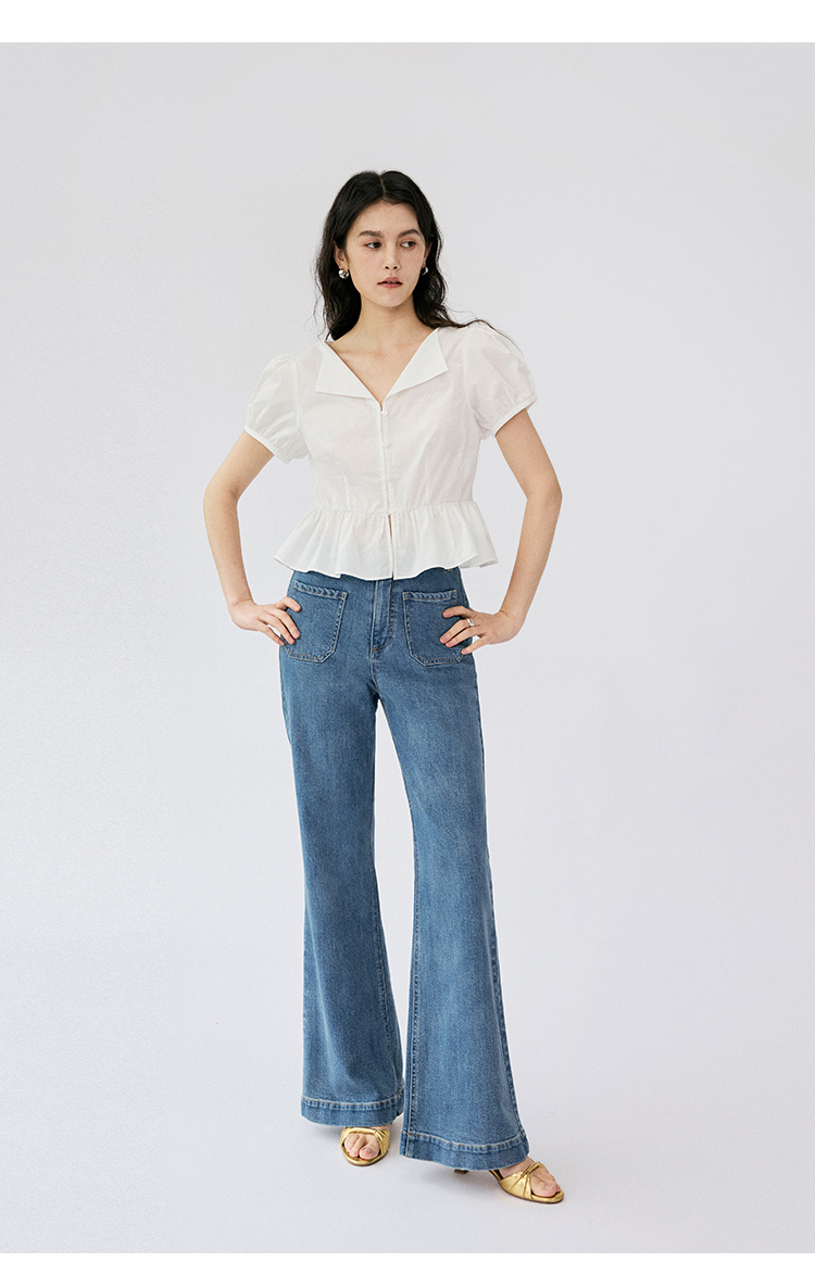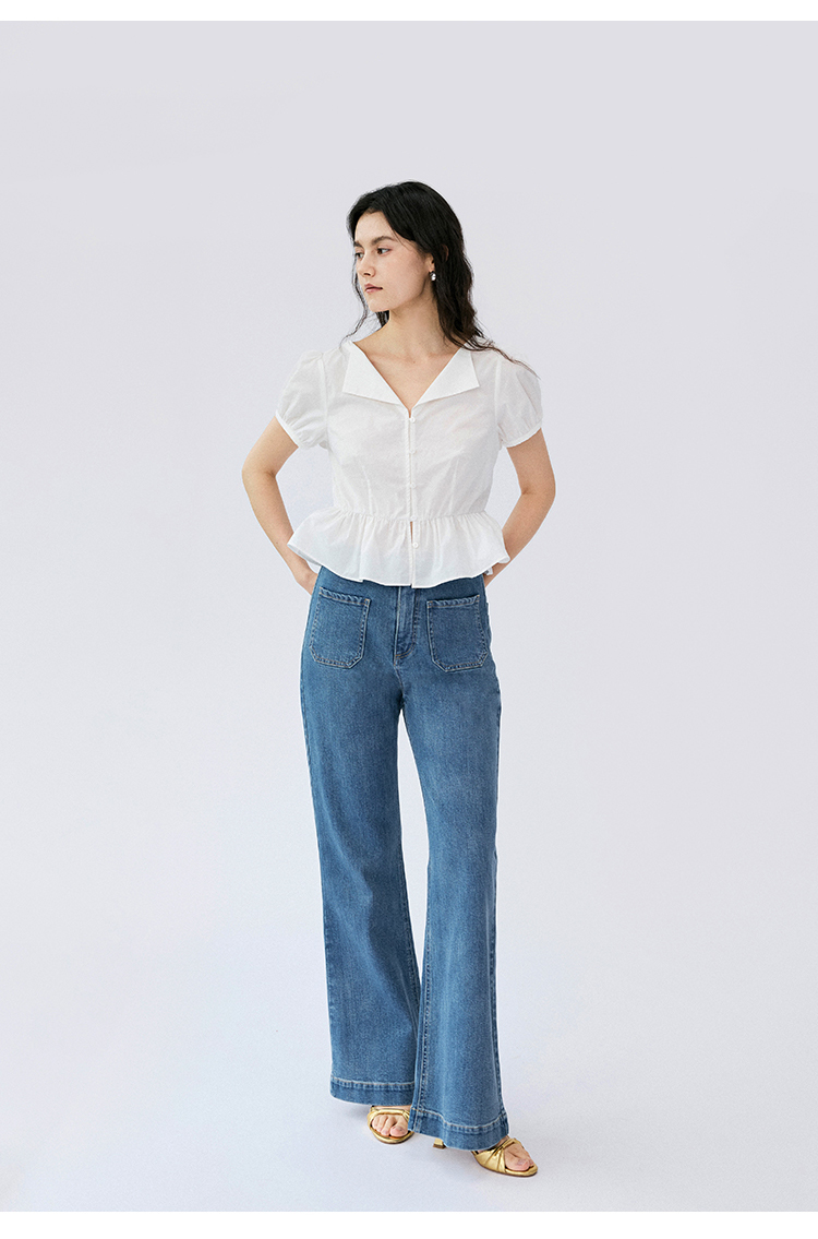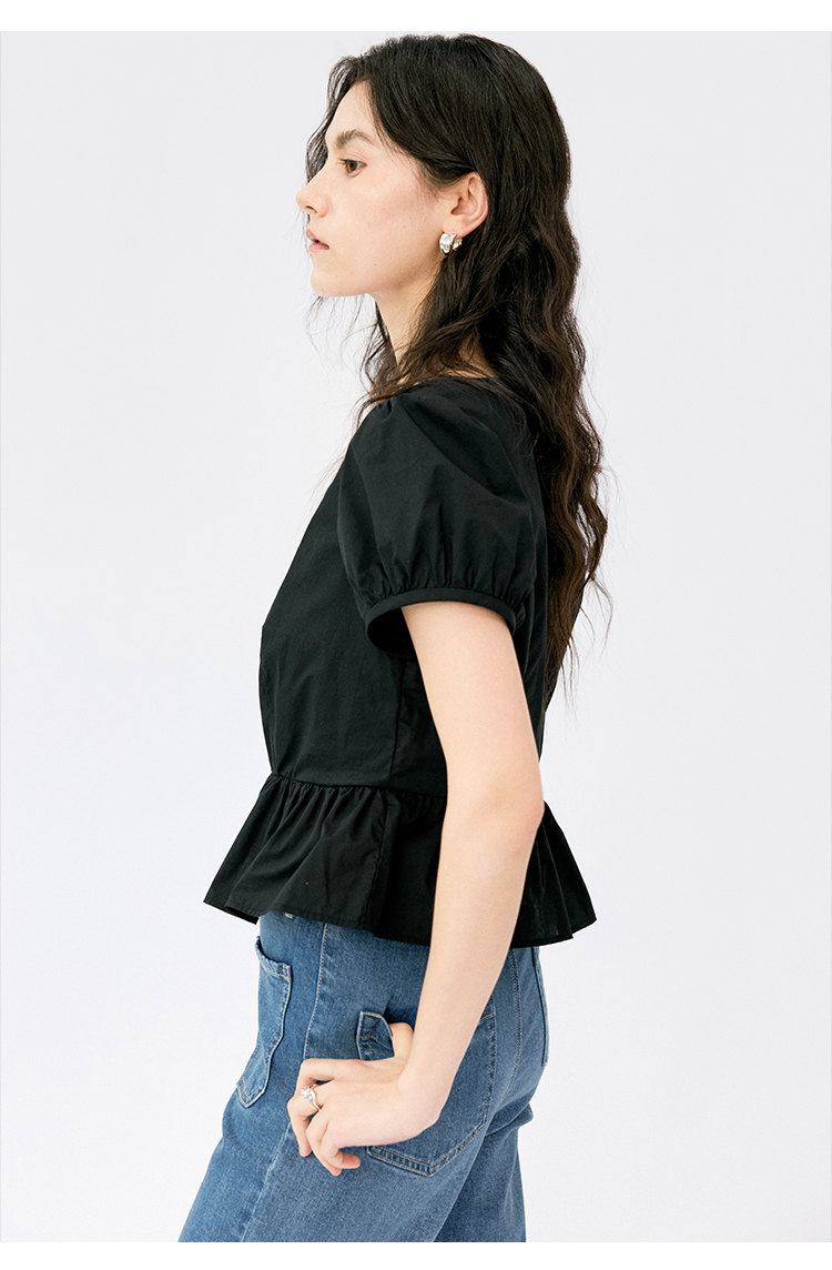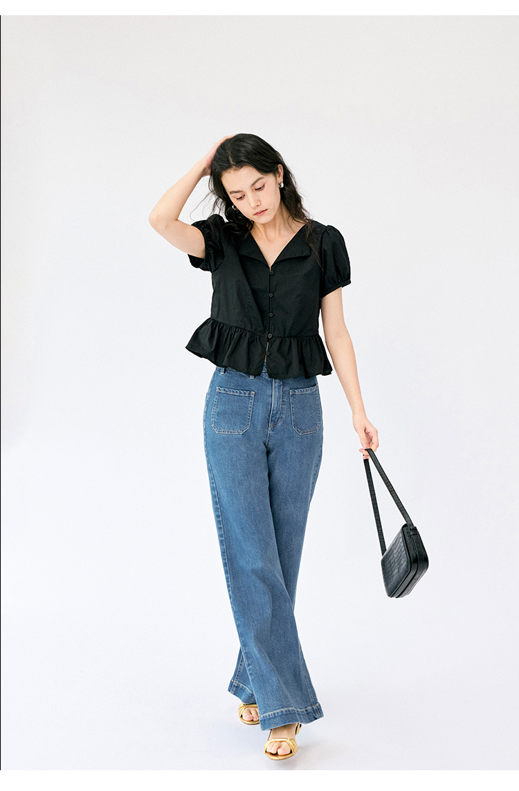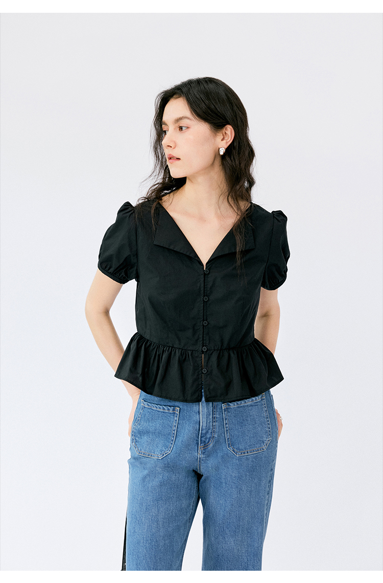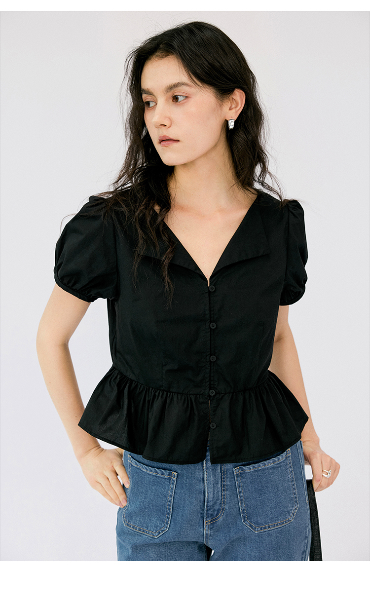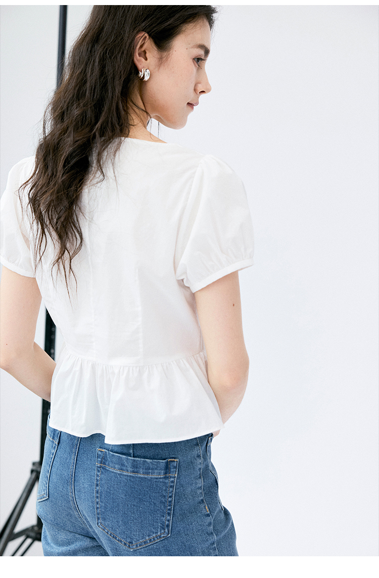 HeyDress法式翻领衬衫女夏季复古收腰纯棉短袖通勤短款泡泡袖上衣