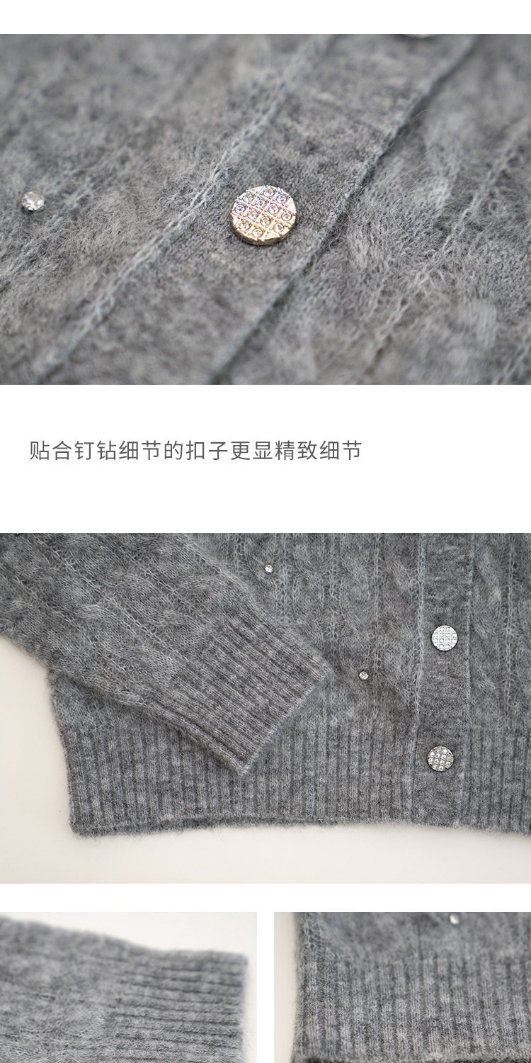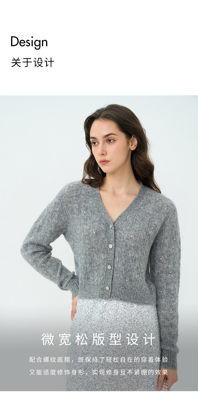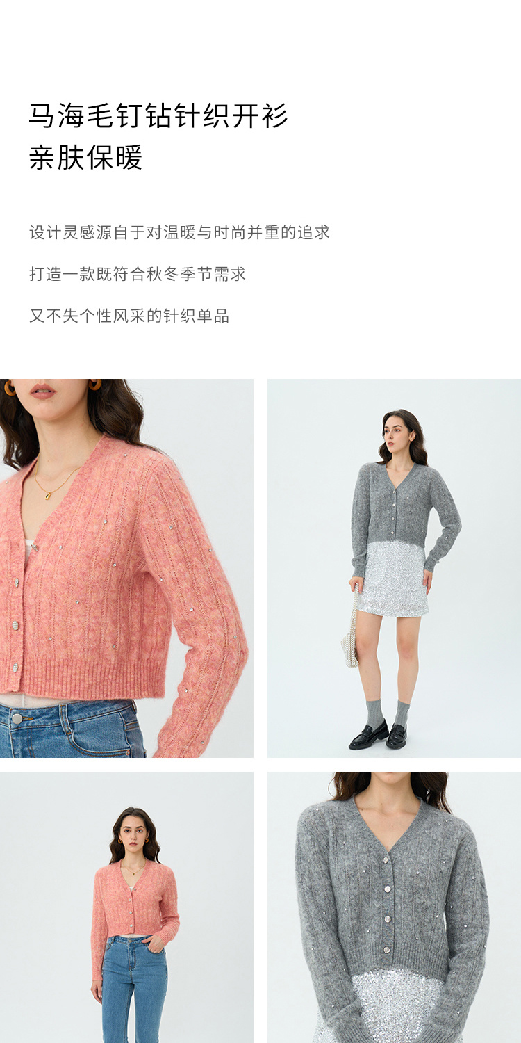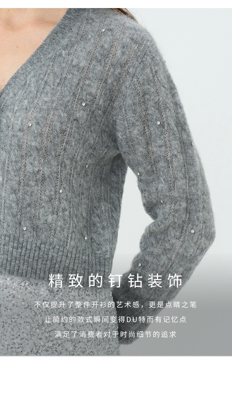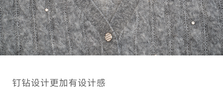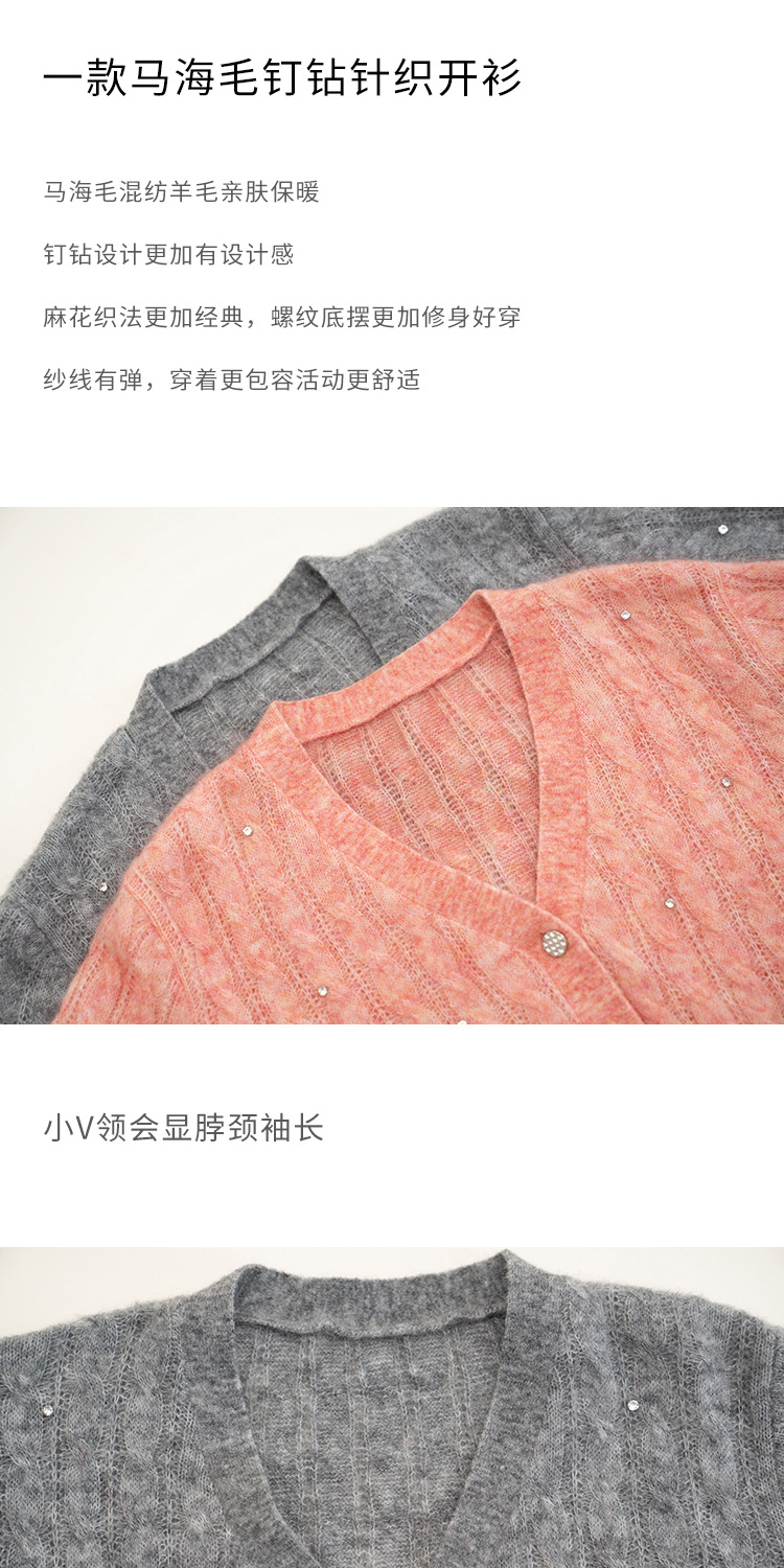 HeyDress马海毛钉钻针织开衫女秋冬法式v领宽松慵懒温柔气质上衣