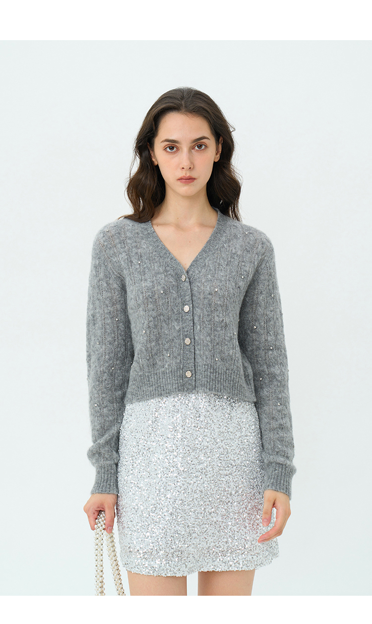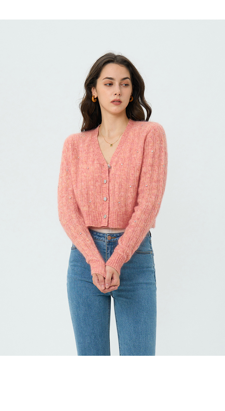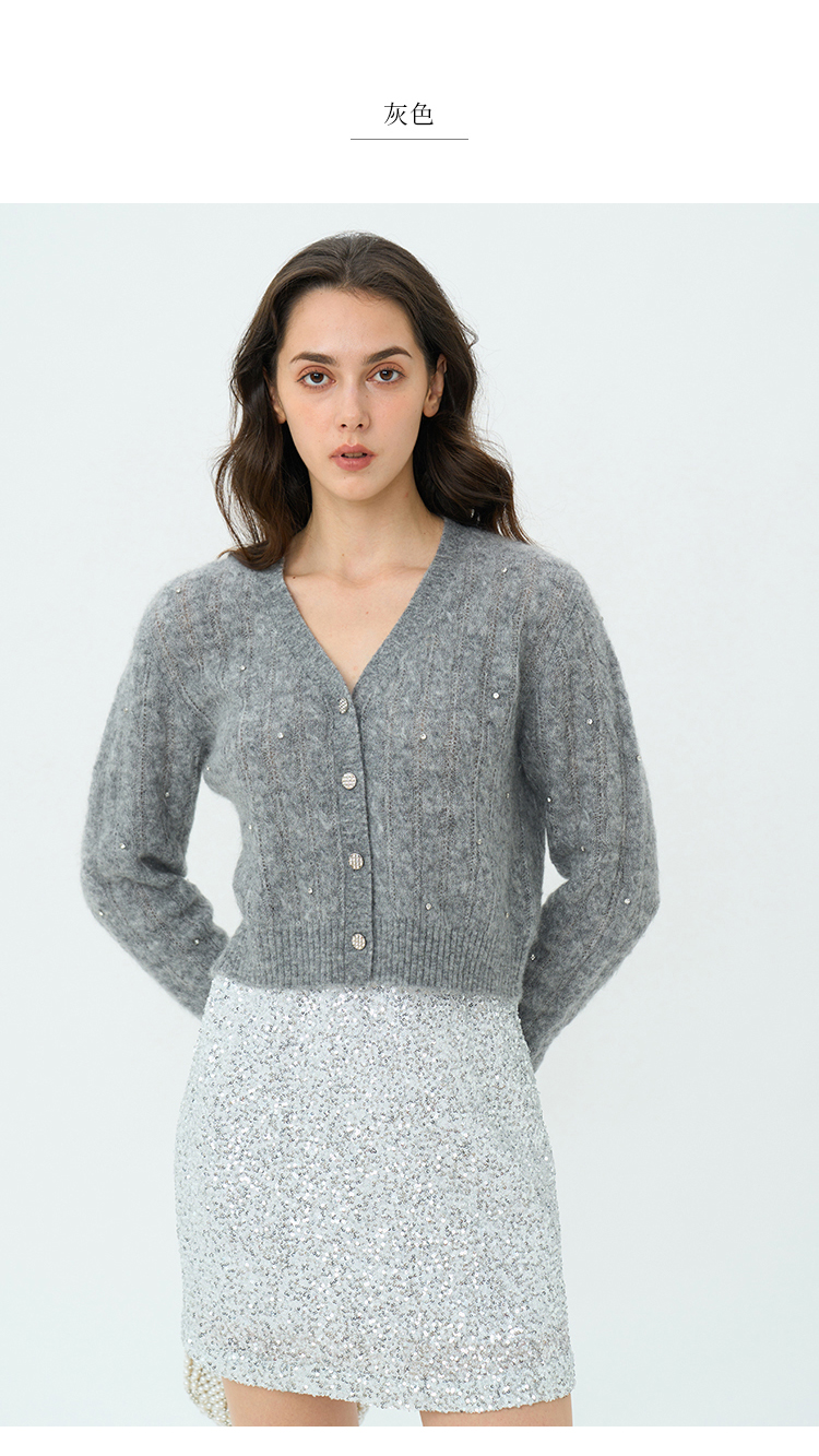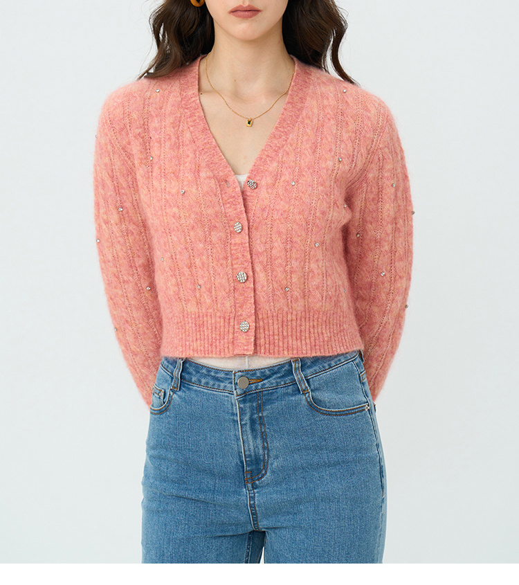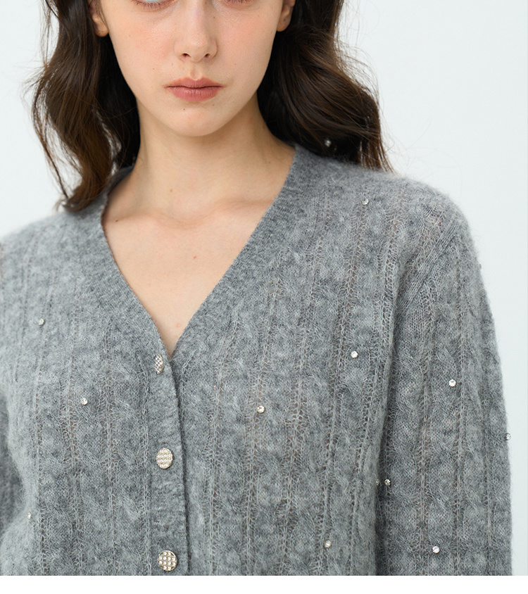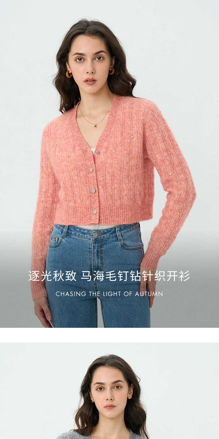 HeyDress马海毛钉钻针织开衫女秋冬法式v领宽松慵懒温柔气质上衣
