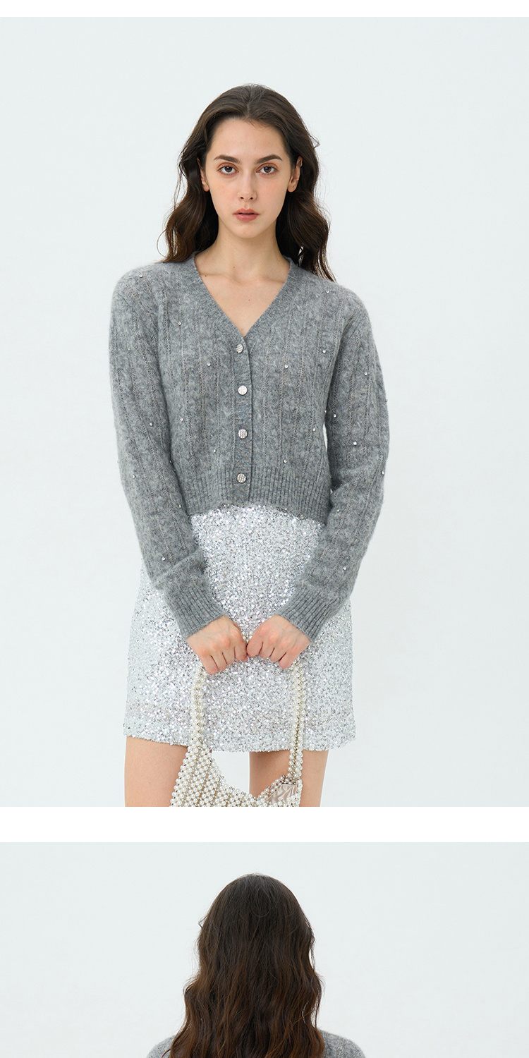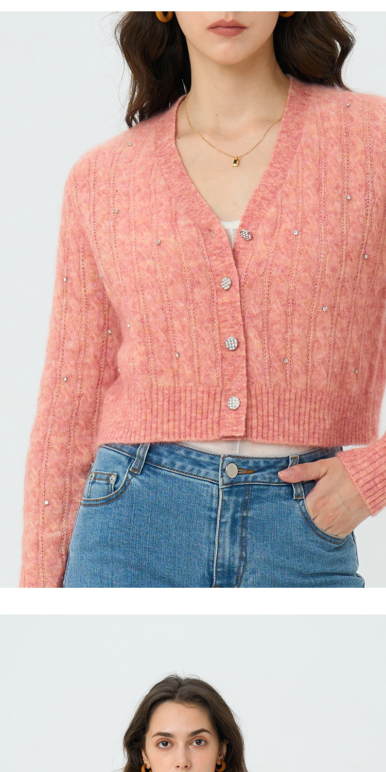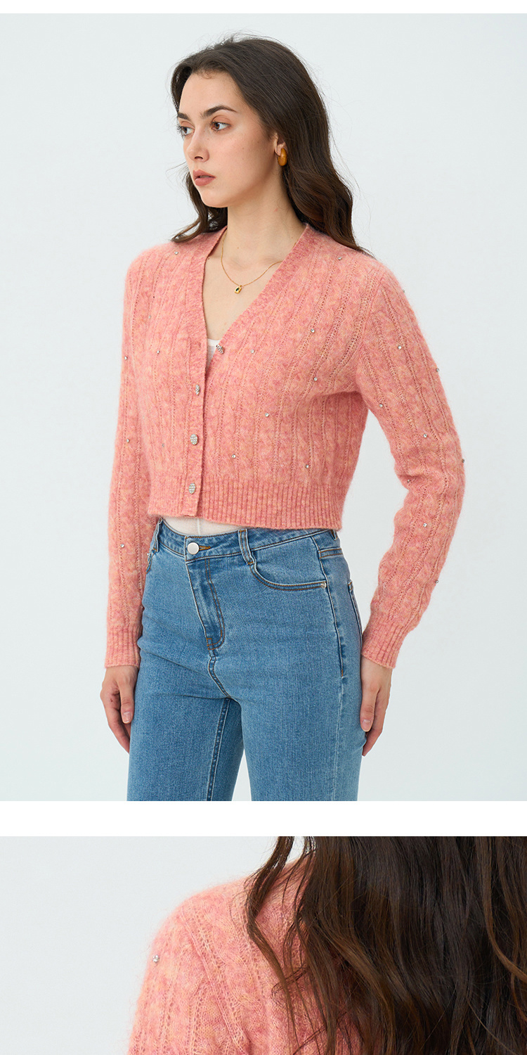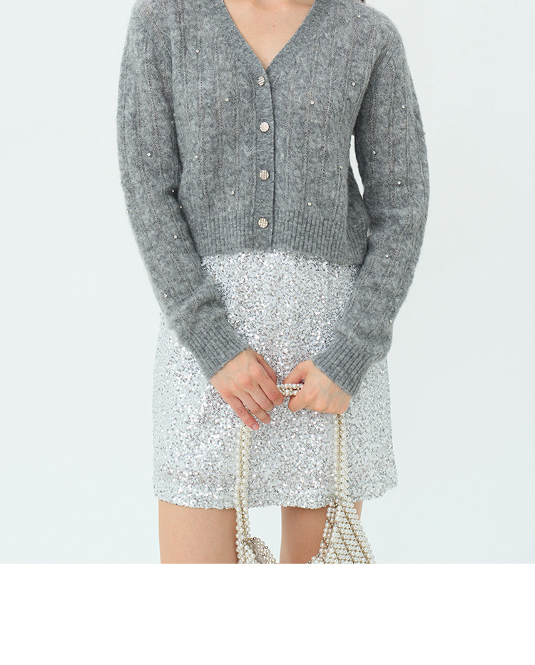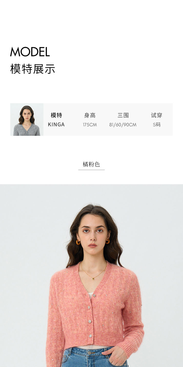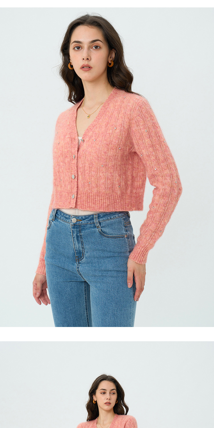HeyDress马海毛钉钻针织开衫女秋冬法式v领宽松慵懒温柔气质上衣