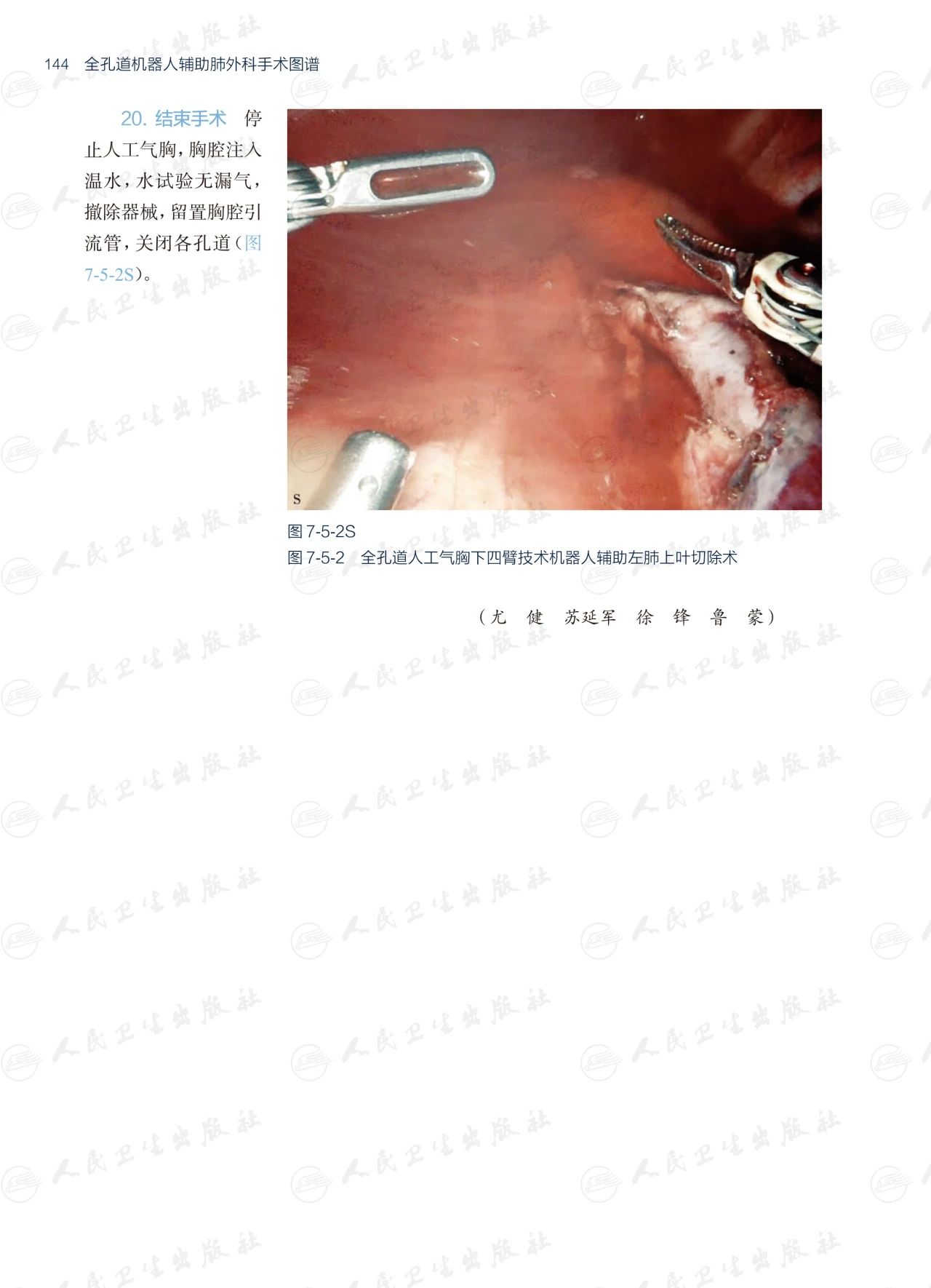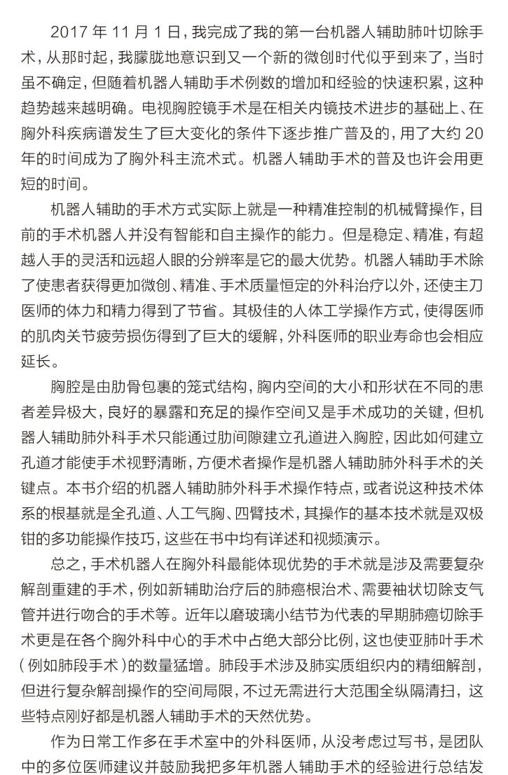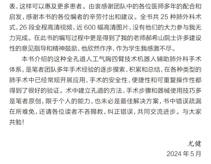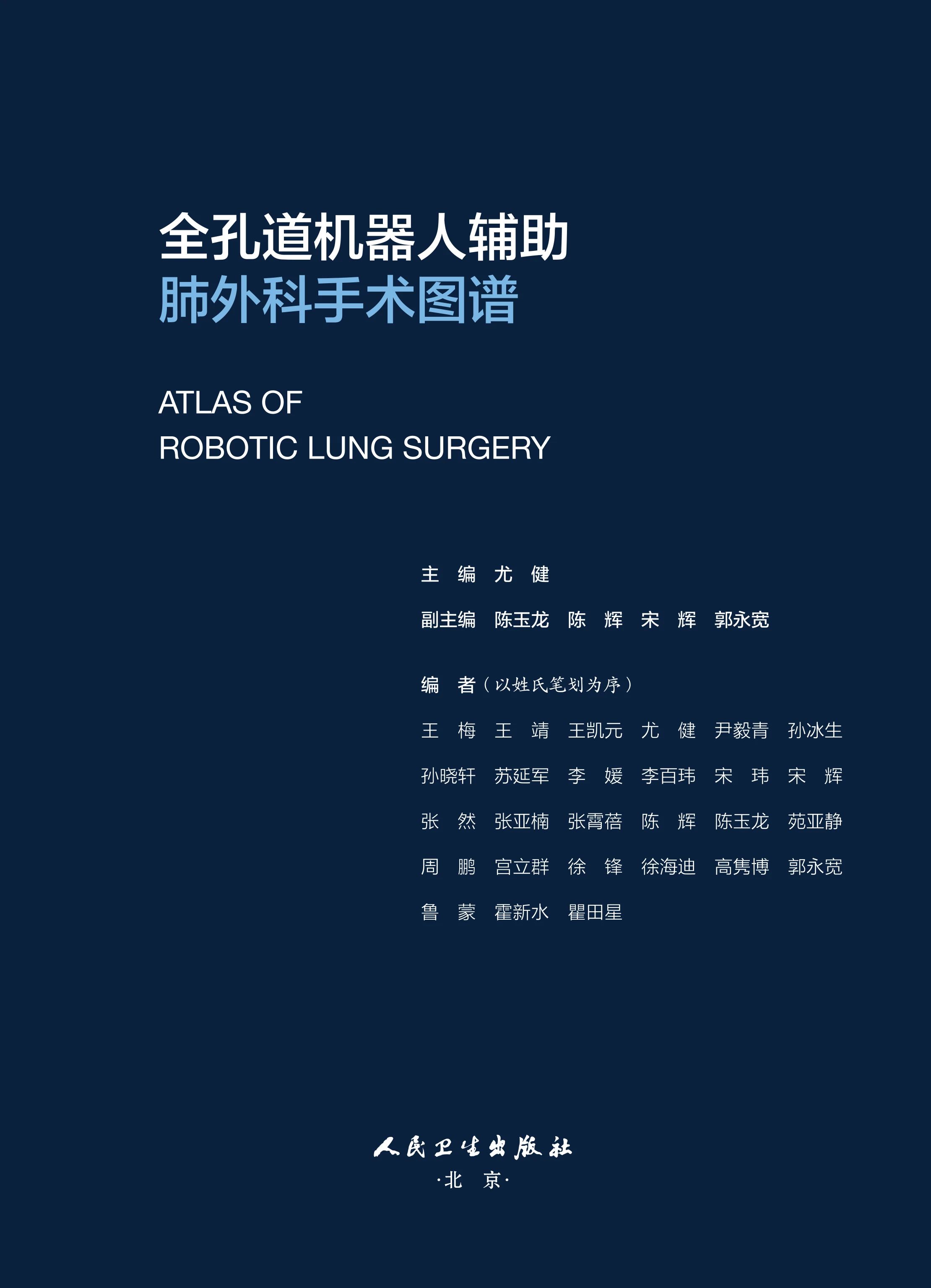 由尤健医师总结多年实际操作的经验而编写出版的《全孔道机器人辅助肺外科手术图谱》一书,是一部图文并茂、内容丰富的专著。此书是他的团队大量手术的经验总结和手术方法的创新汇总,涵盖了所有胸外科常规开展的术式。书中各术式手术步骤讲解极为细致,视频完整清晰,实操性极强。