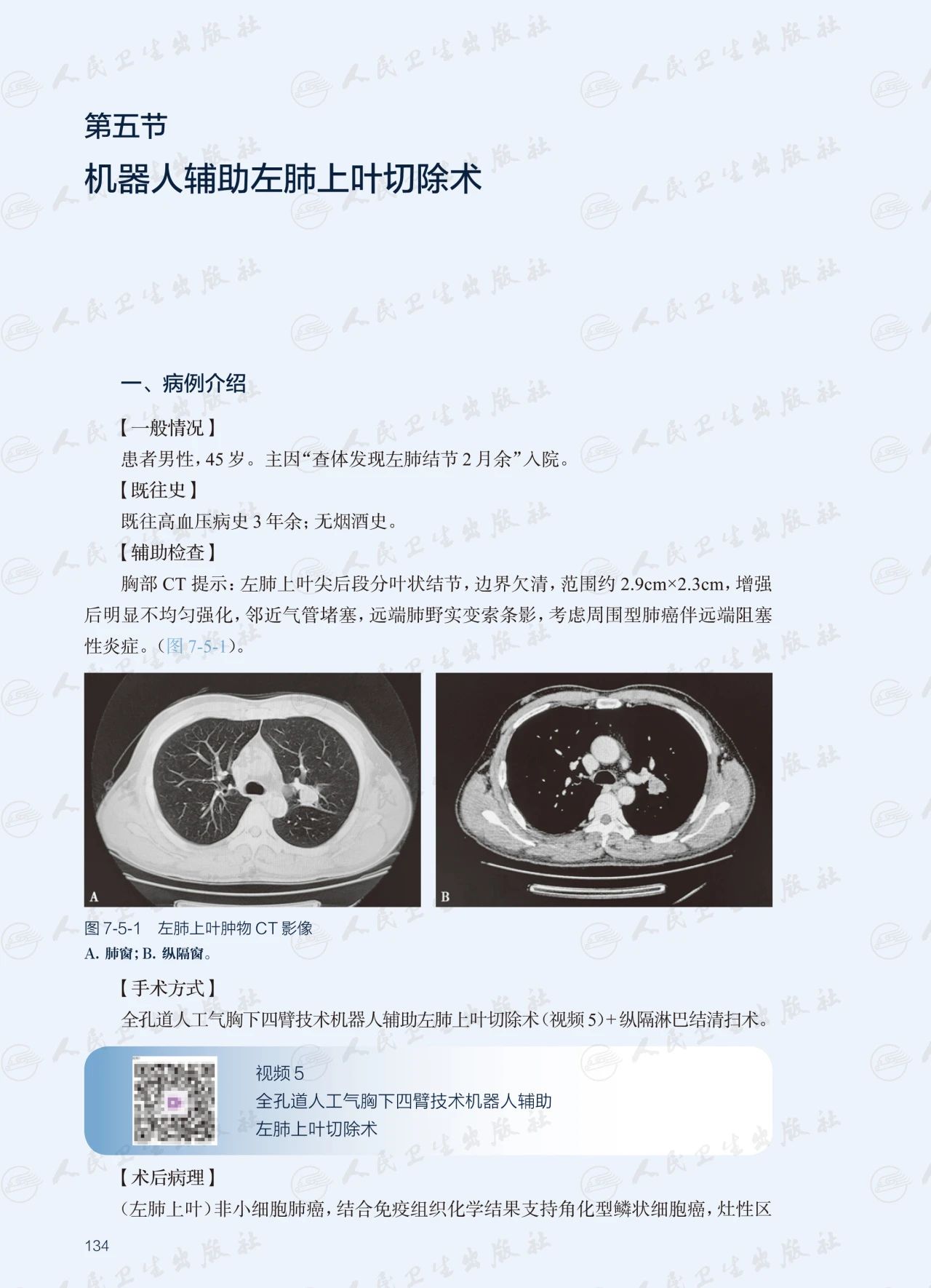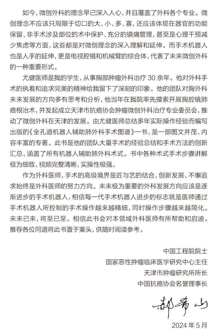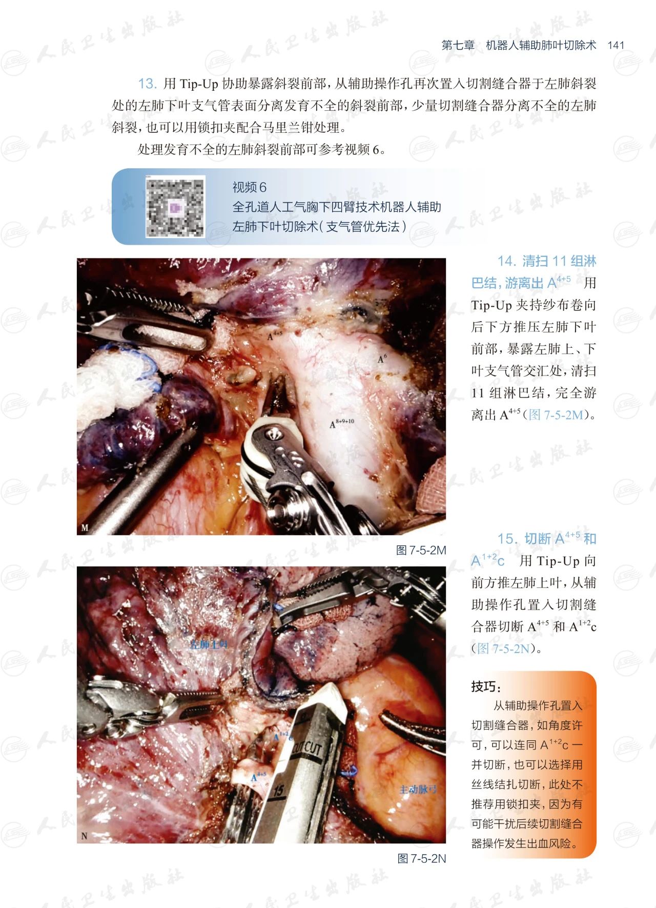 由尤健医师总结多年实际操作的经验而编写出版的《全孔道机器人辅助肺外科手术图谱》一书,是一部图文并茂、内容丰富的专著。此书是他的团队大量手术的经验总结和手术方法的创新汇总,涵盖了所有胸外科常规开展的术式。书中各术式手术步骤讲解极为细致,视频完整清晰,实操性极强。
