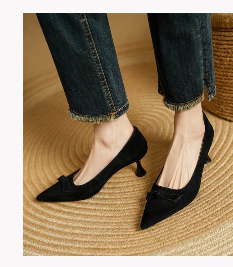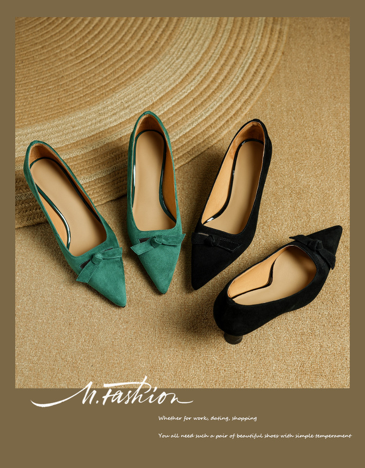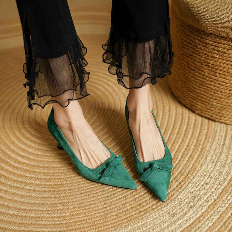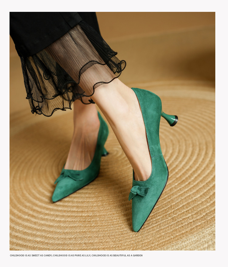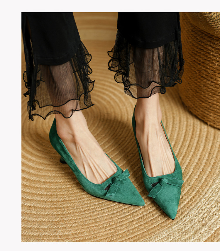 【预售5天】里外全皮复古墨绿色尖头高跟鞋细跟羊翻皮浅口法式蝴蝶结中跟单鞋PS&PS3012-1