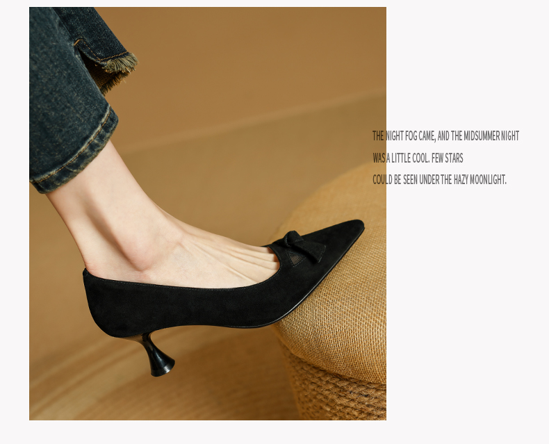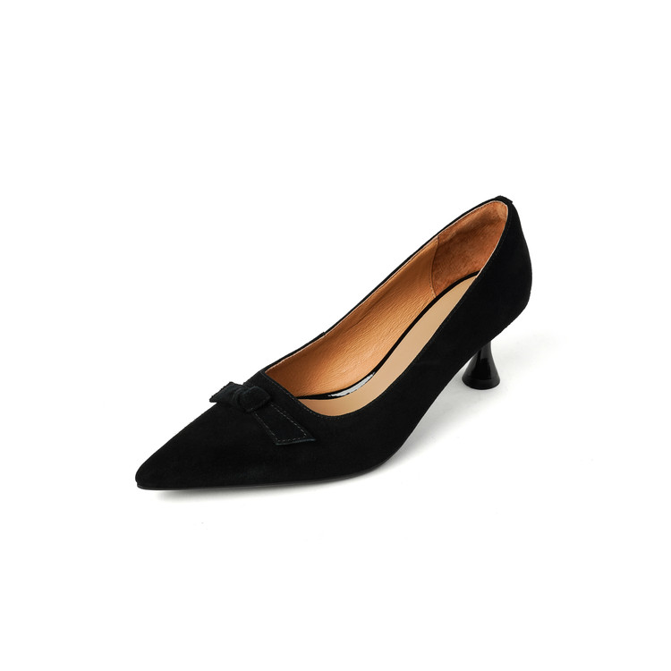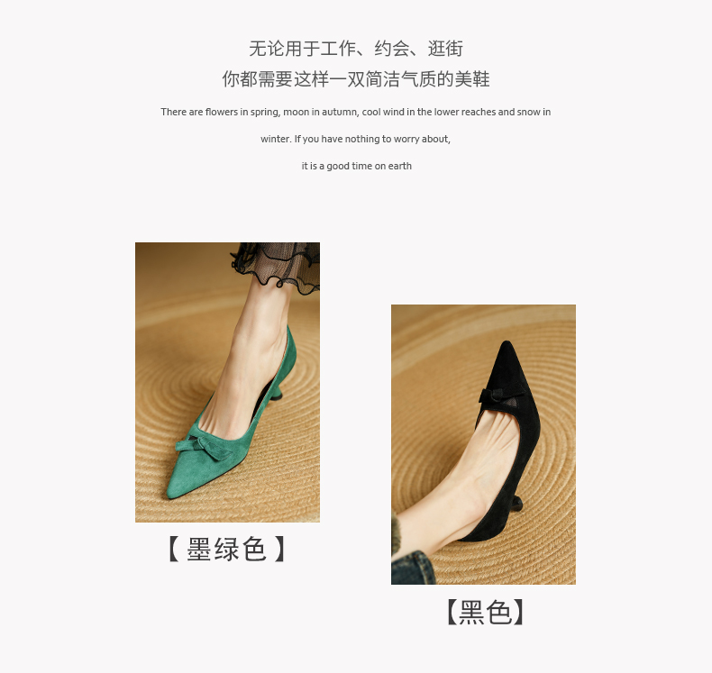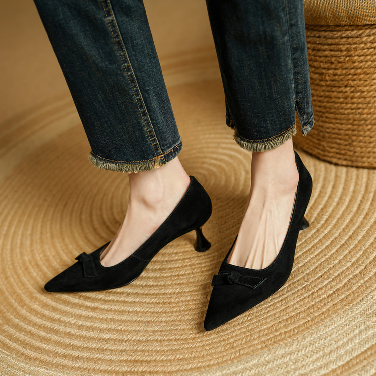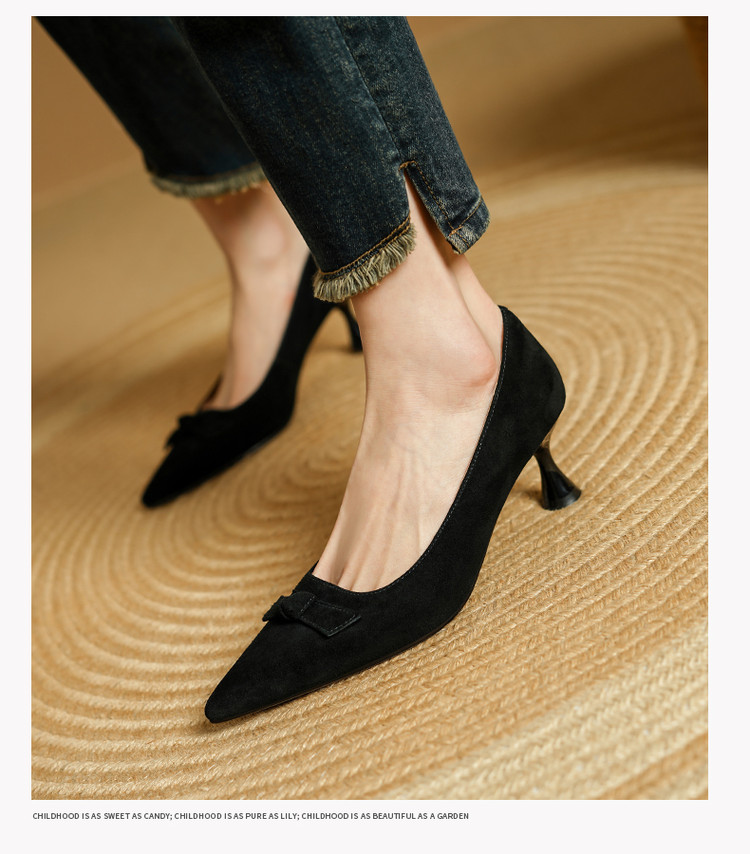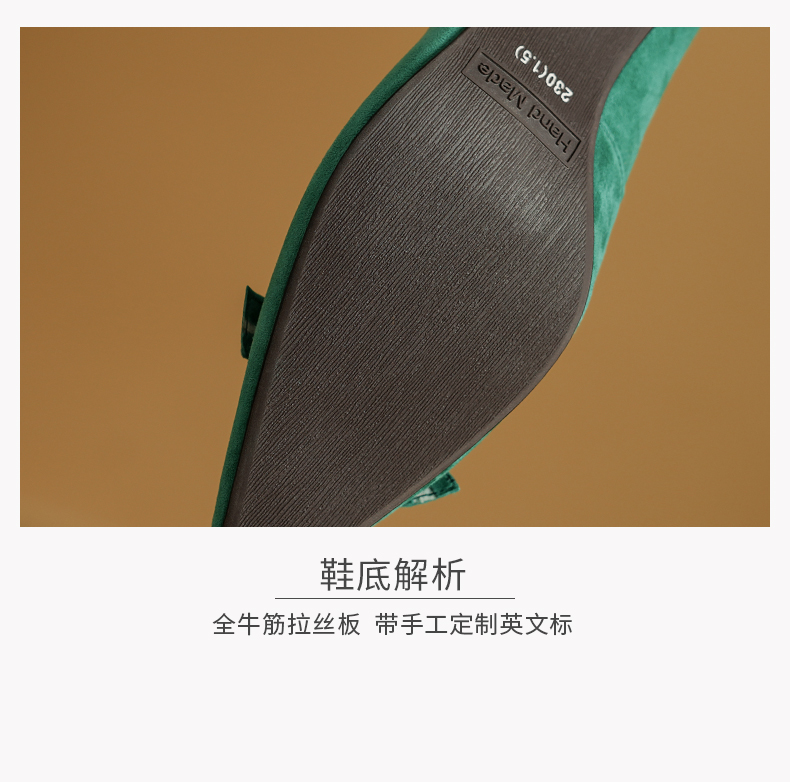 【预售5天】里外全皮复古墨绿色尖头高跟鞋细跟羊翻皮浅口法式蝴蝶结中跟单鞋PS&PS3012-1