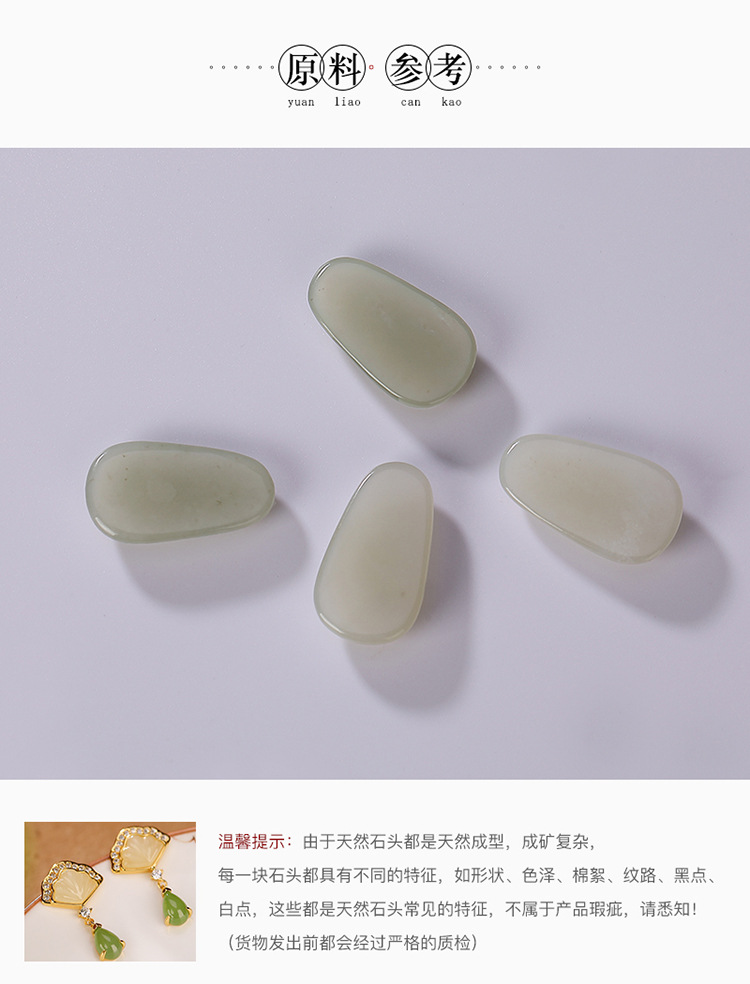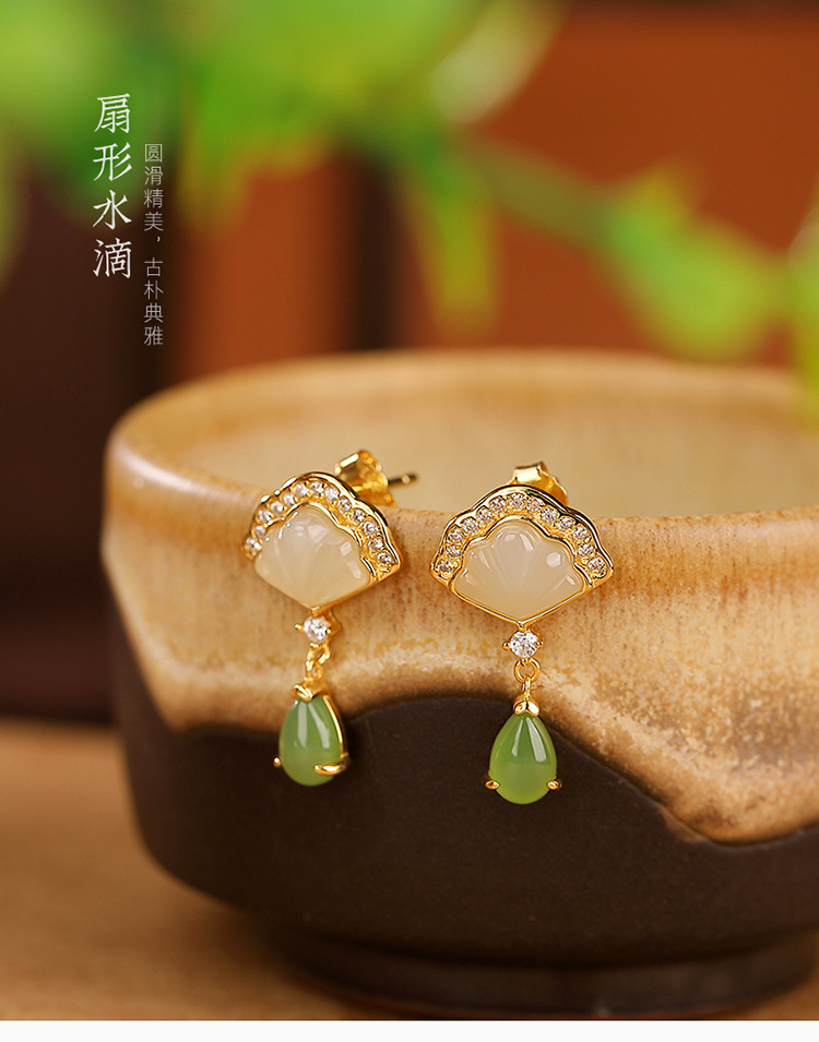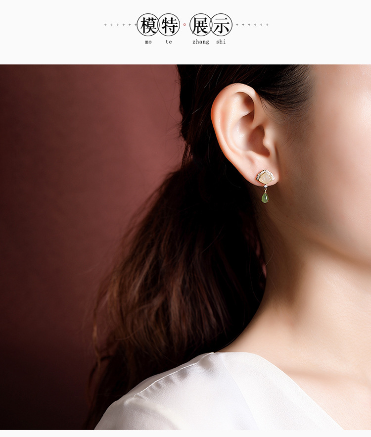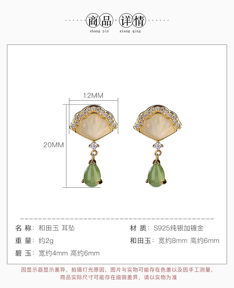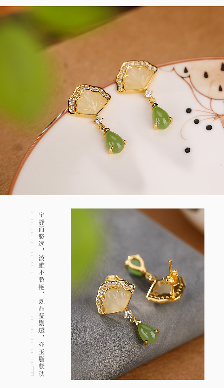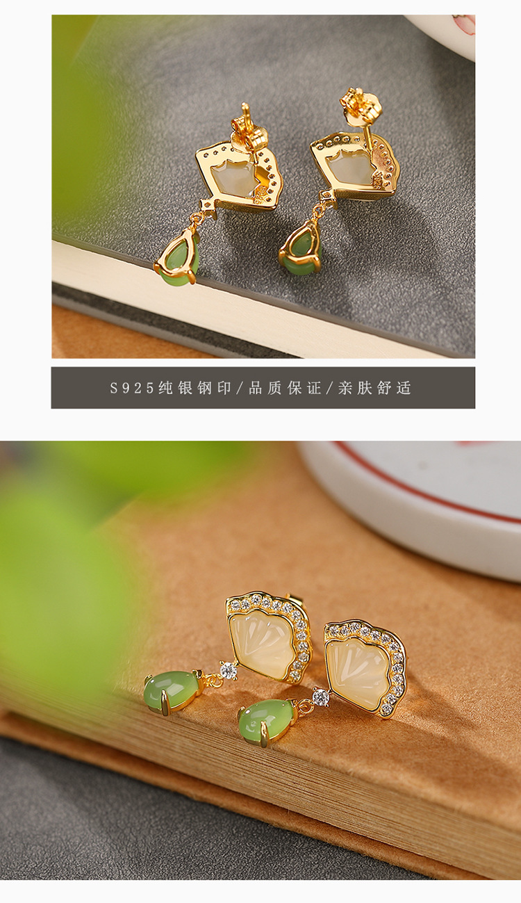 S925纯银镀金,和田玉碧玉复古贝壳水滴耳钉气质百搭耳坠耳饰CW-241