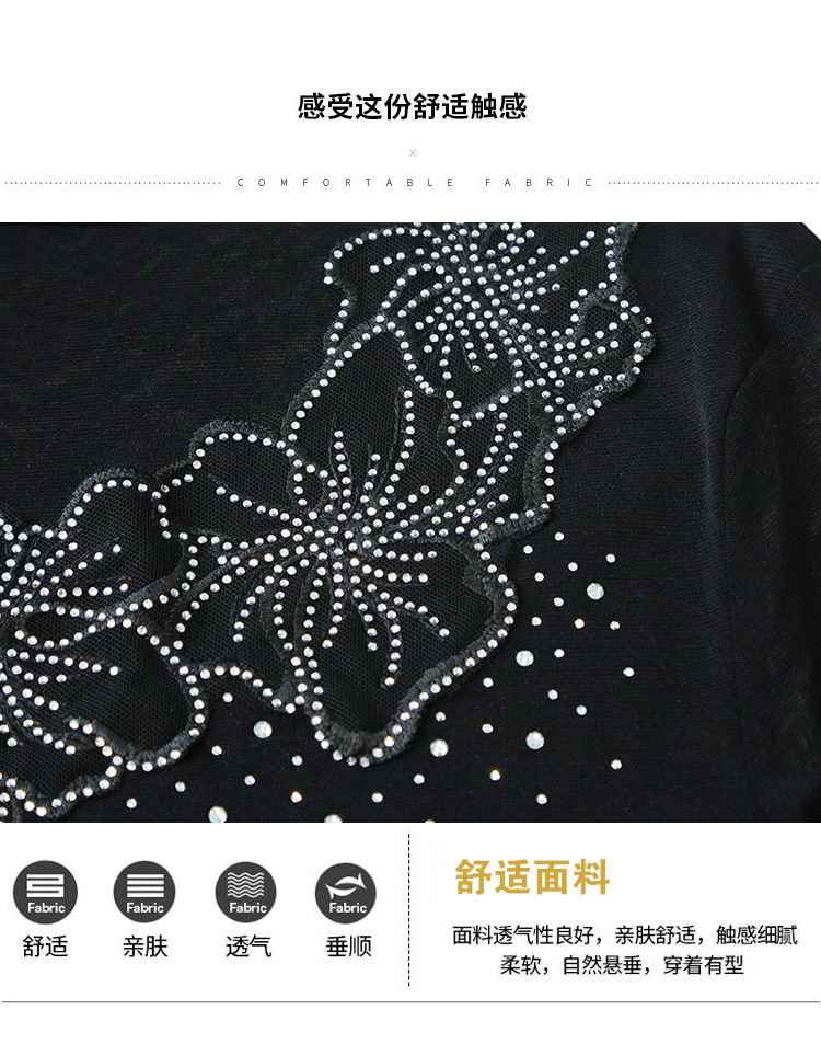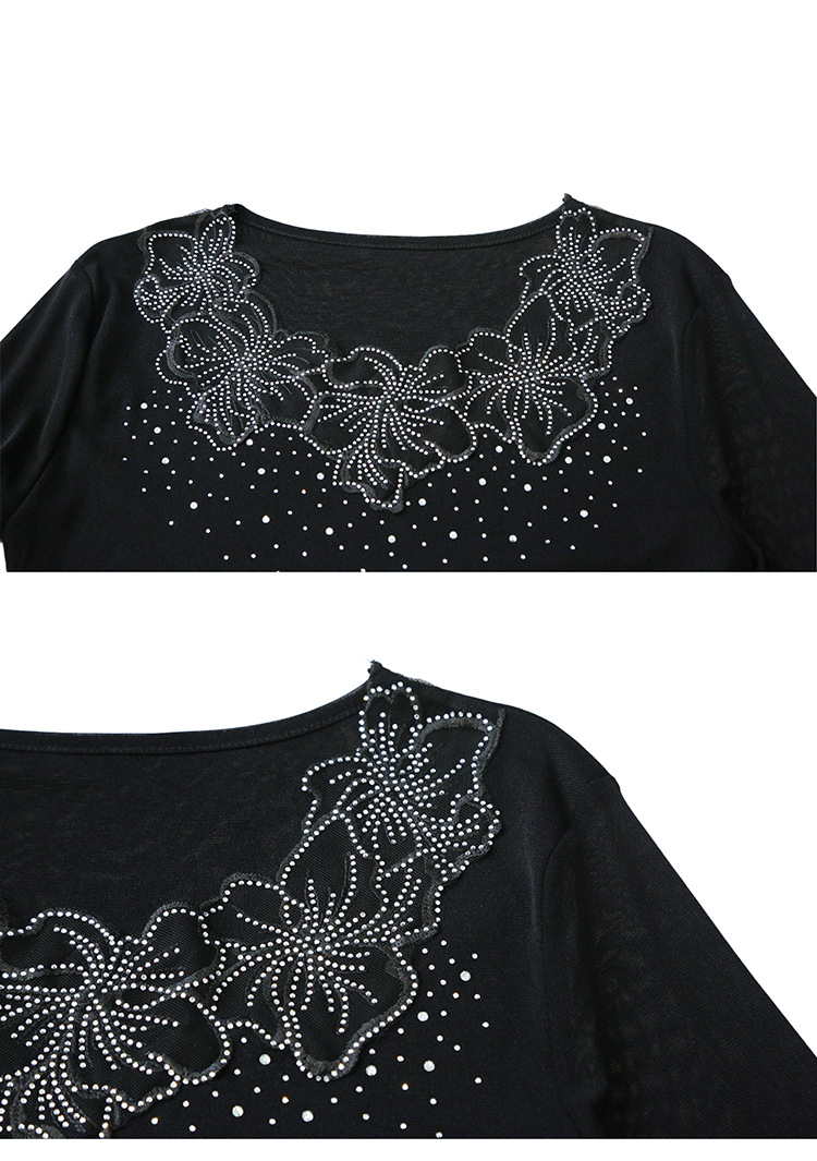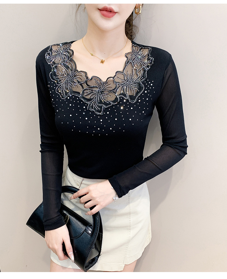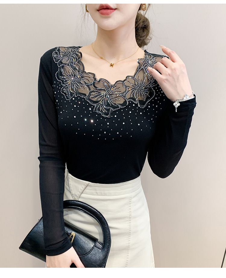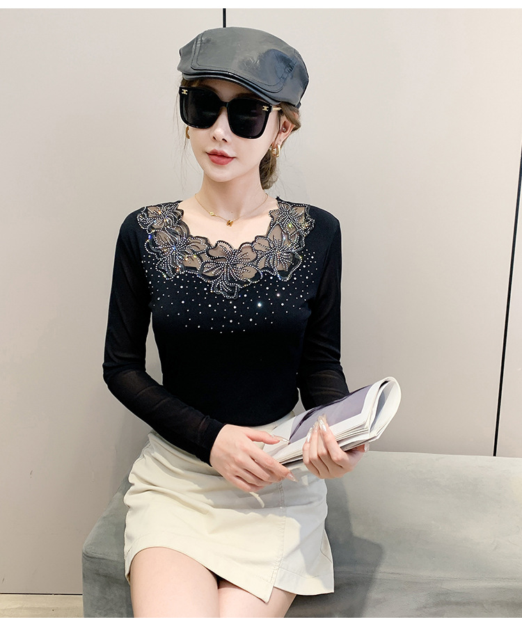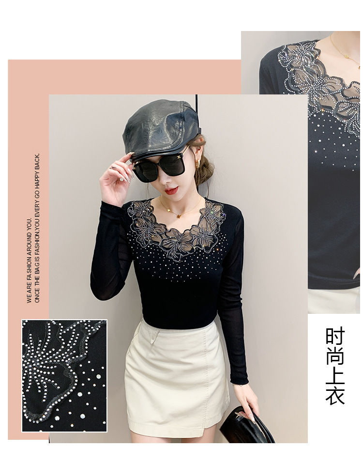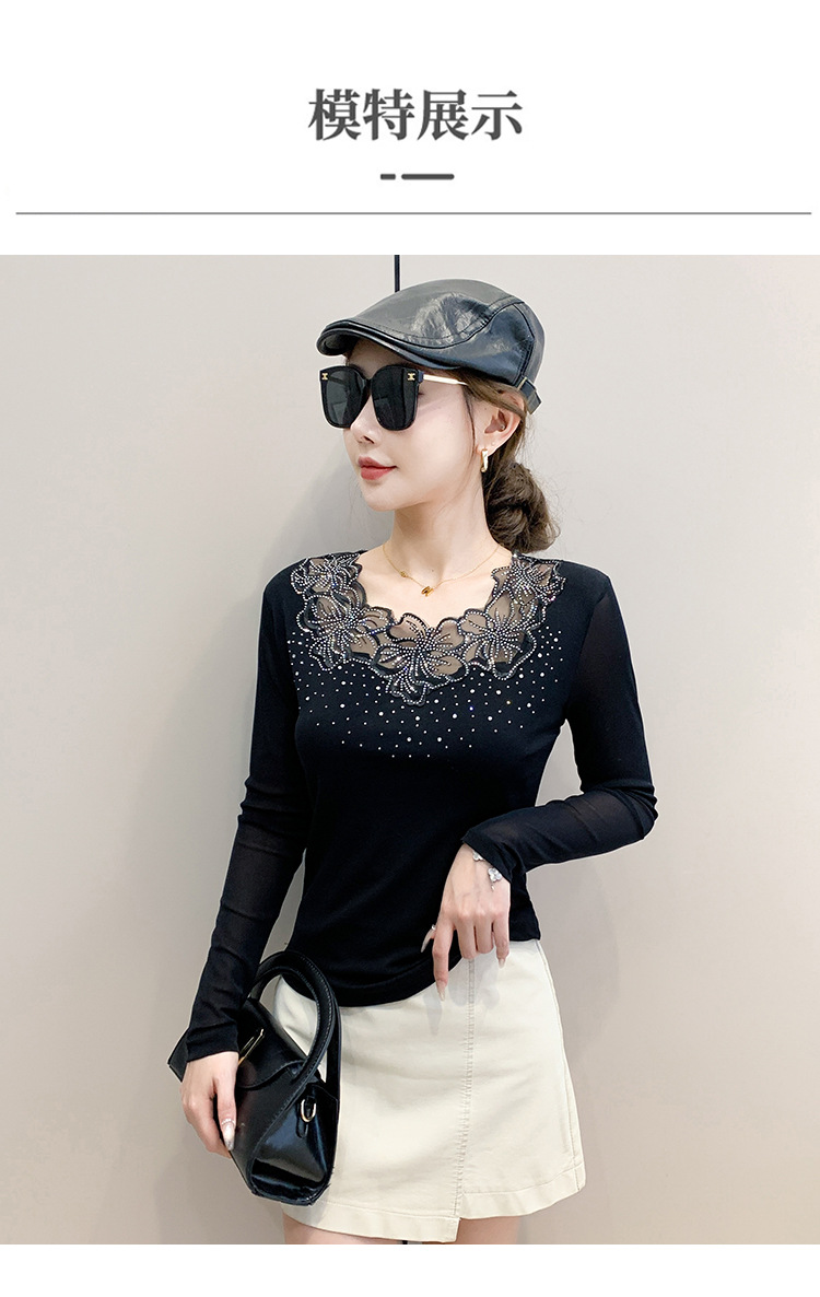 KQL 461H8018蕾丝镂空烫钻网纱长袖修身显瘦T恤