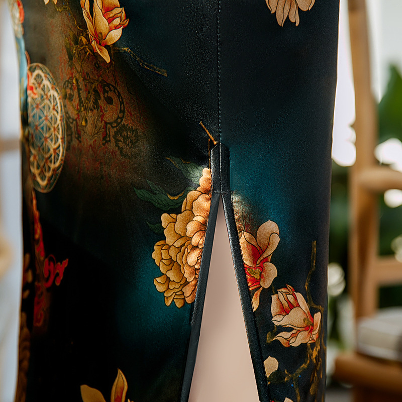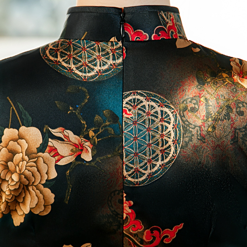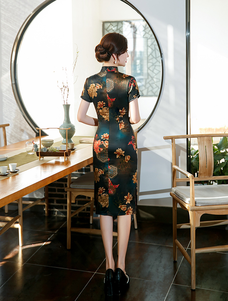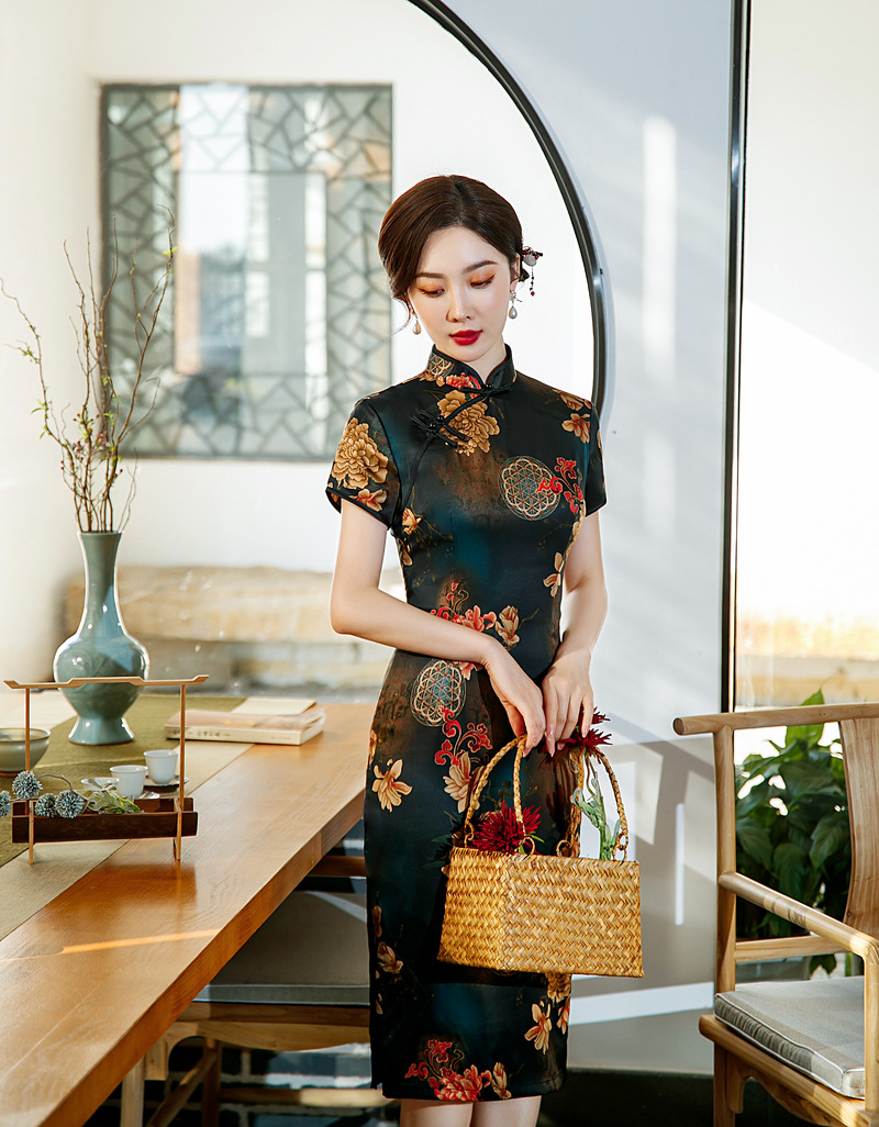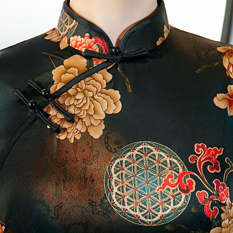 ZAYS-82243春夏中长双层印花旗袍改良气质复古立领丝绸斜襟短袖旗袍