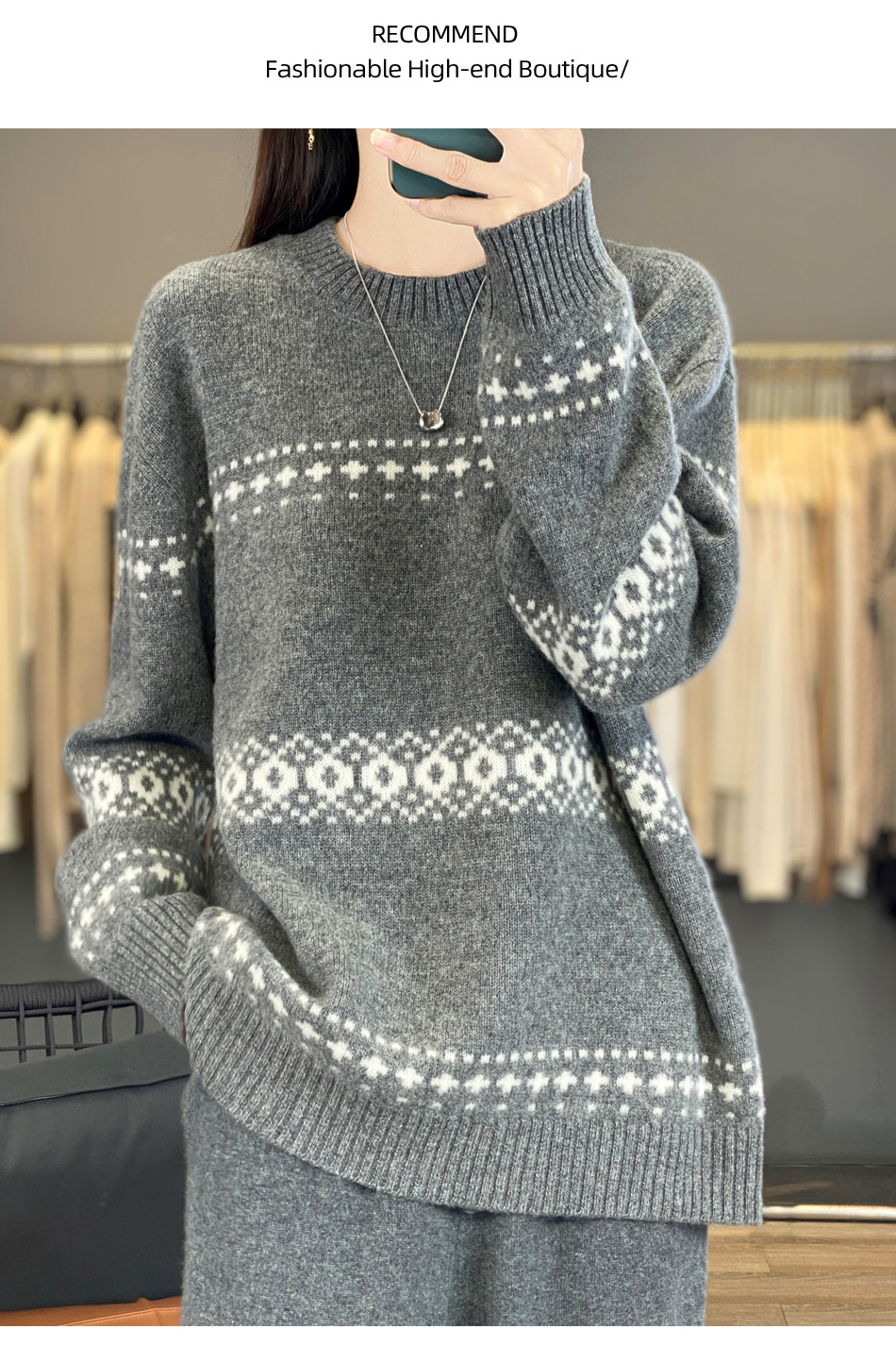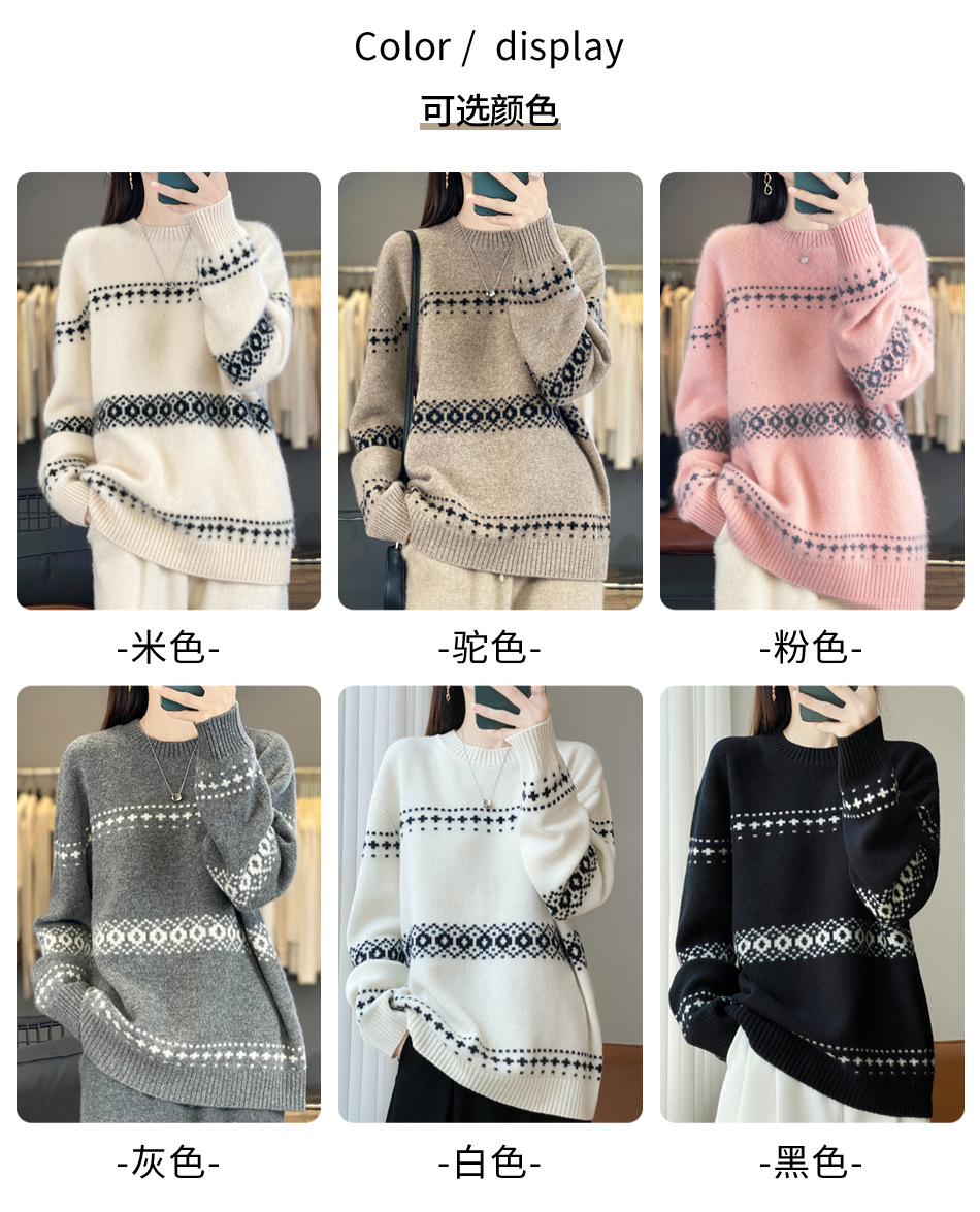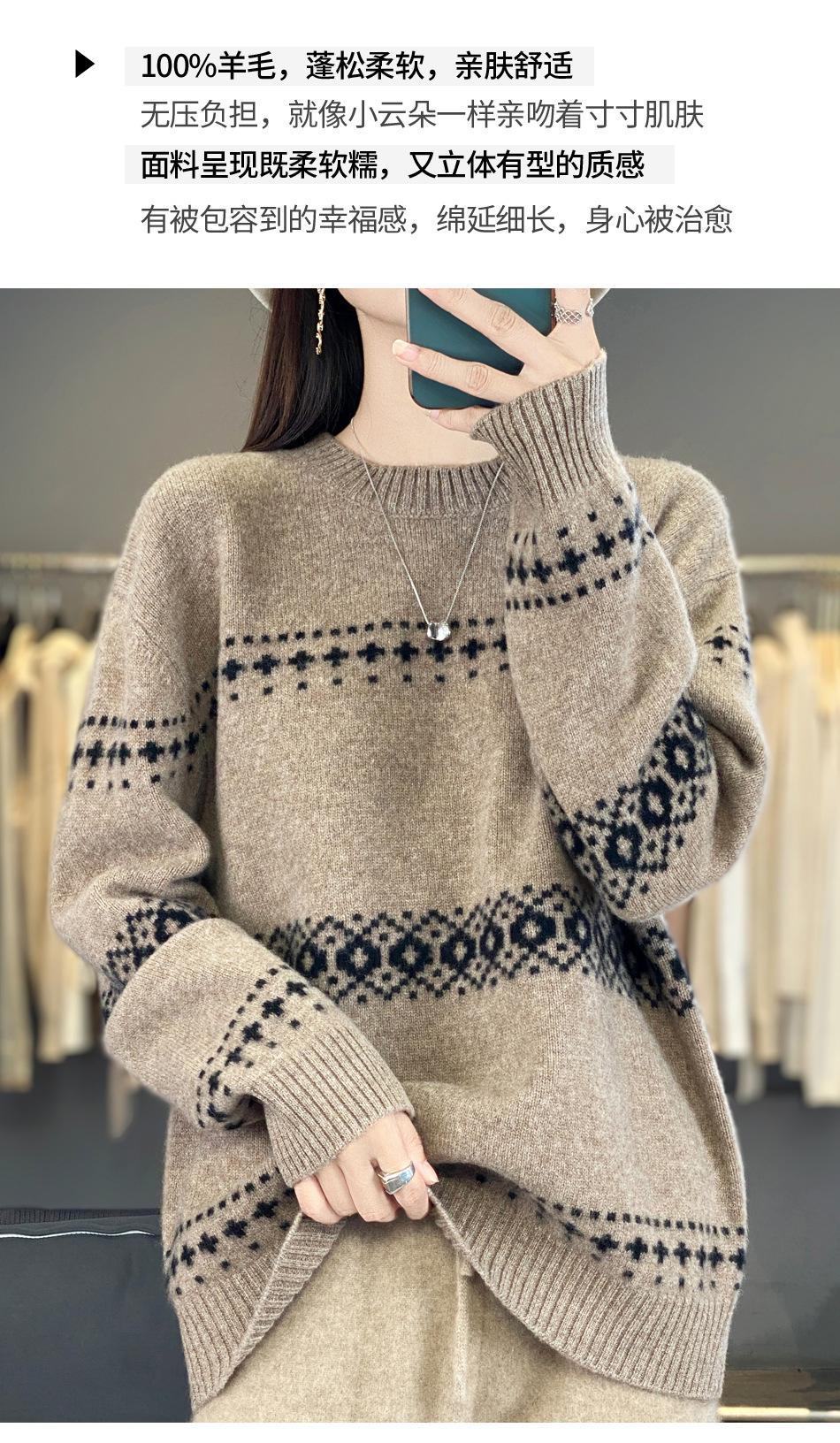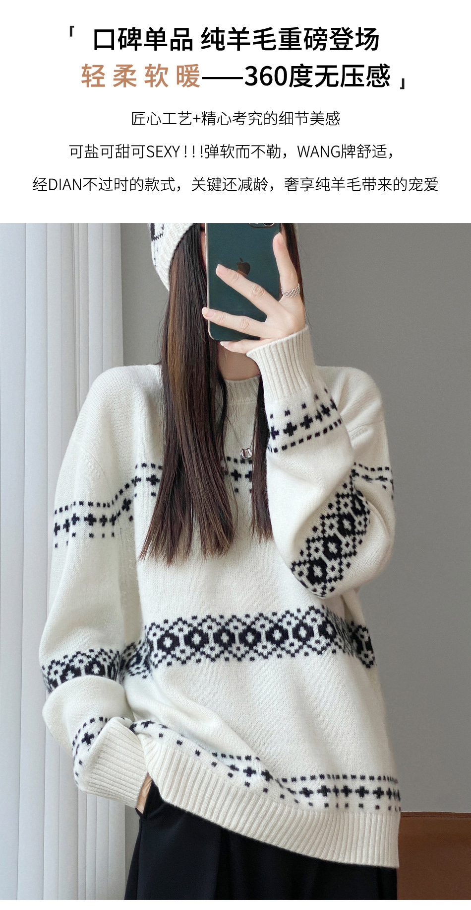 丁摩100%纯羊毛新款女式宽松圆领复古加厚套头打底针织衫毛衣ALM2-461