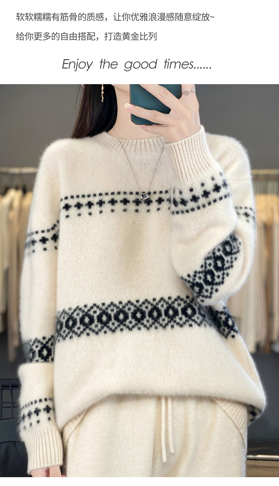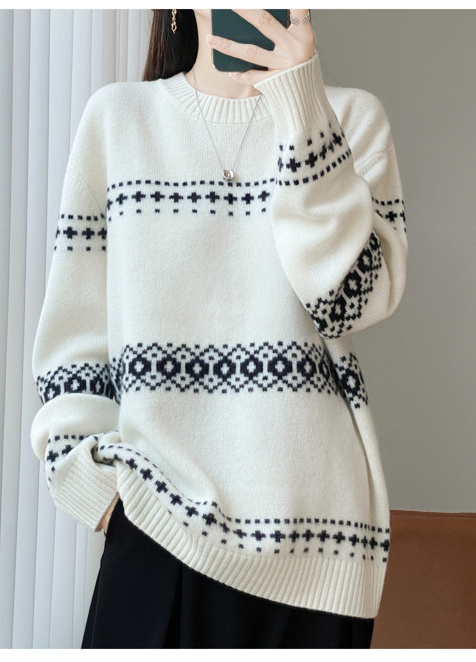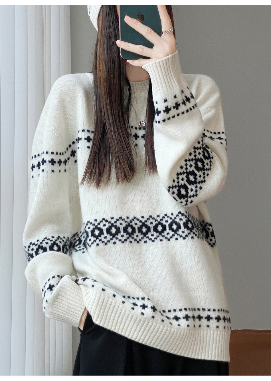 丁摩100%纯羊毛新款女式宽松圆领复古加厚套头打底针织衫毛衣ALM2-461