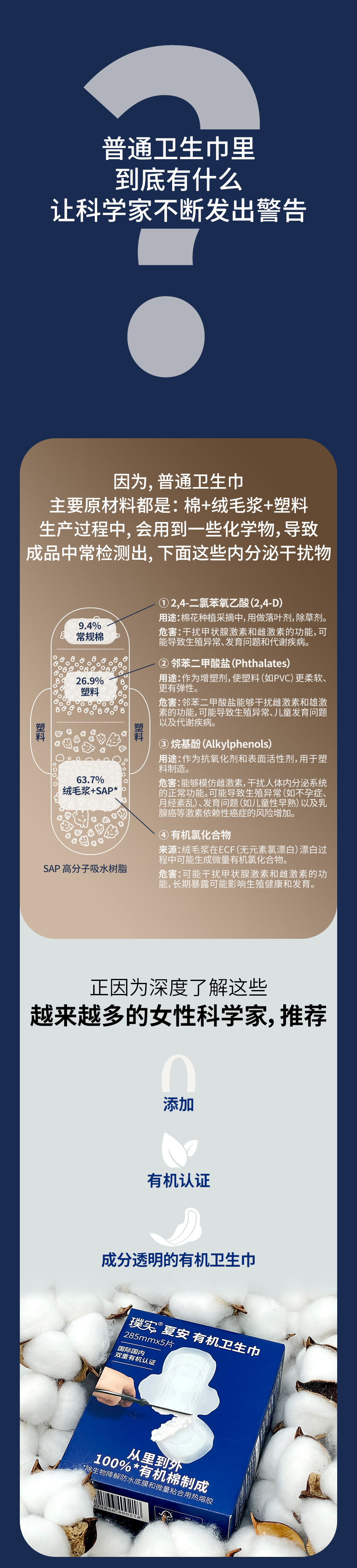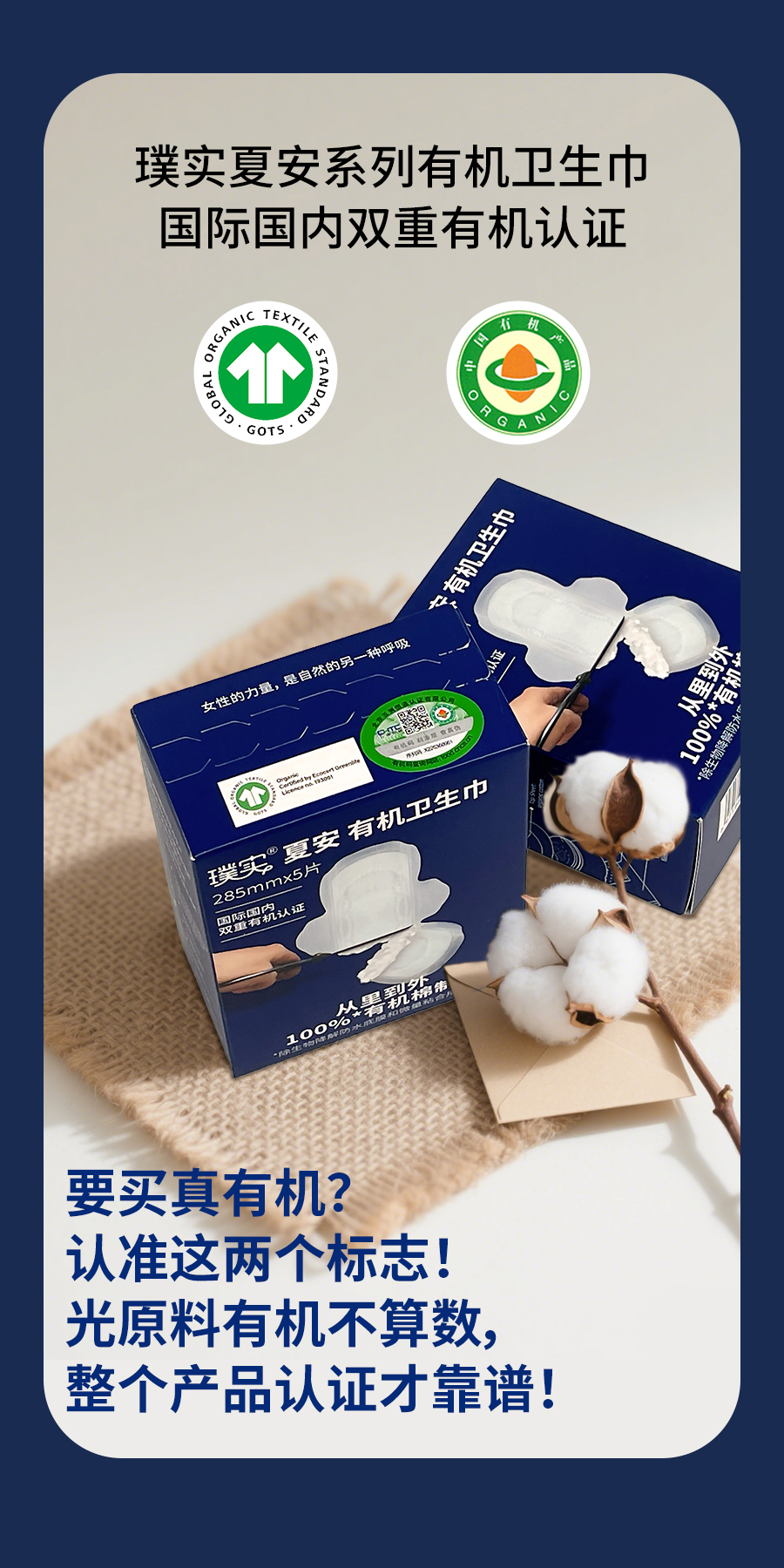 夏安 100%有机棉敏柔卫生巾 非聚乙烯 聚丙烯材质 无SAP 绿色环保
