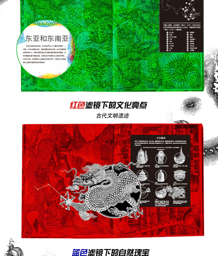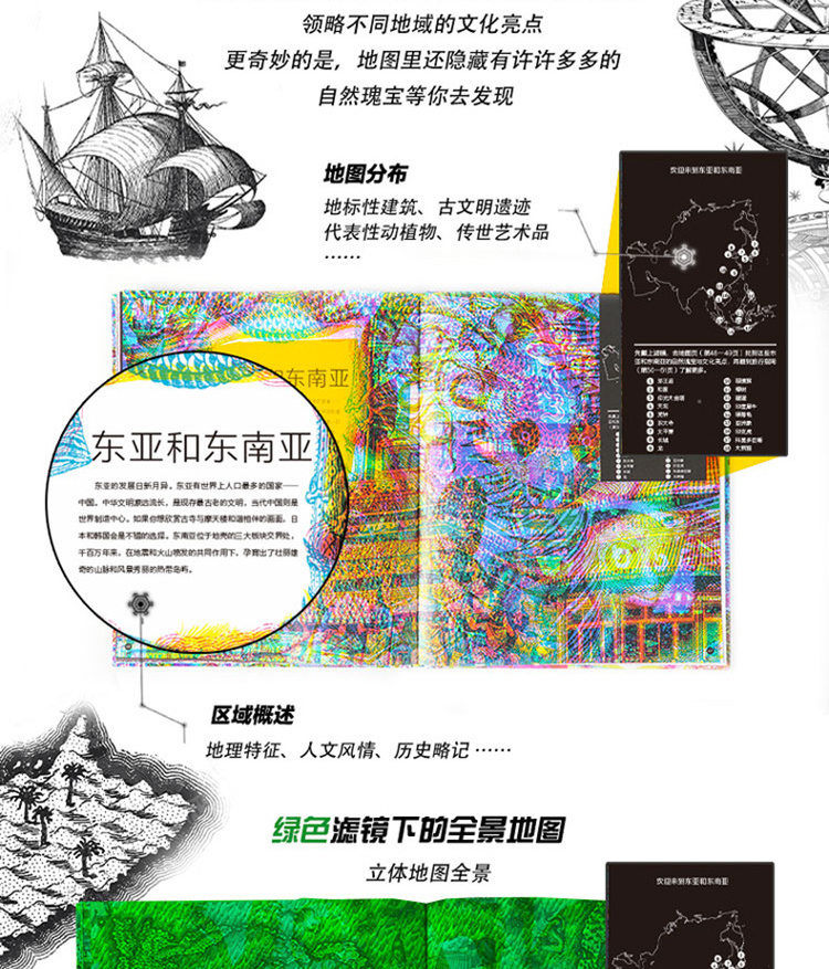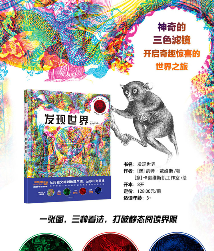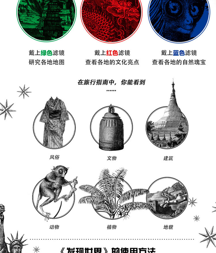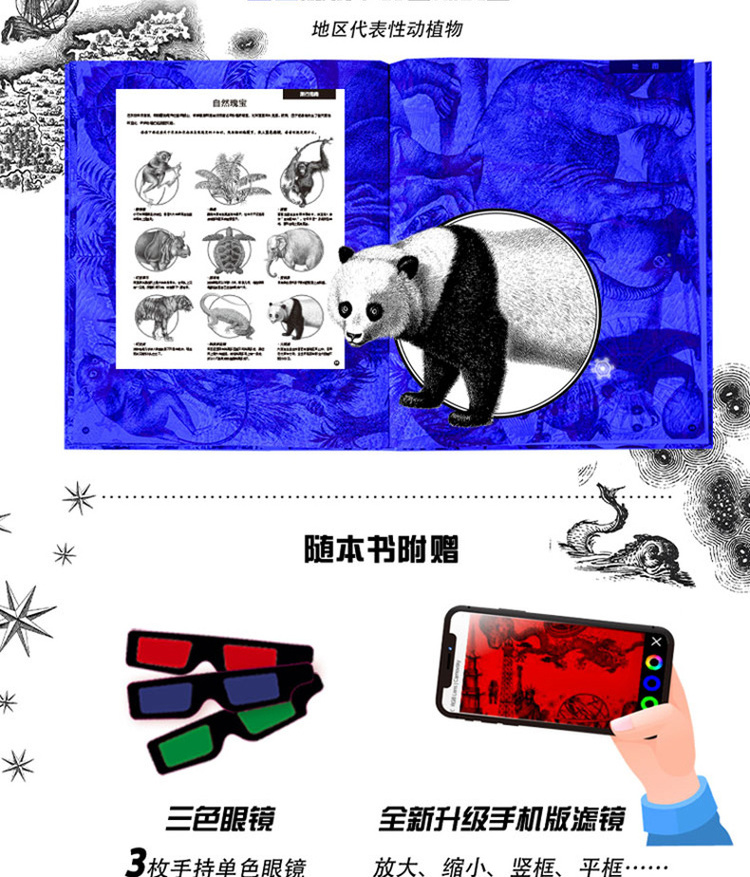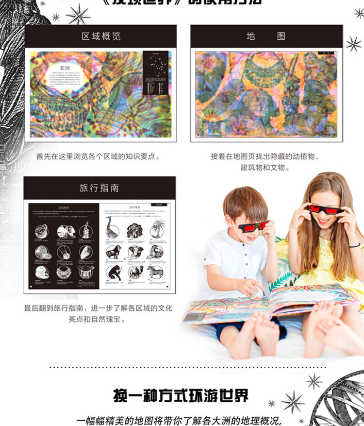 裸眼看时,是令人炫目的大幅彩色图画。戴上三色眼镜,新奇有趣的一幕便发生了!意想不到的画面会魔术般一一呈现在你面前。绿色的镜头用来揭秘每个区域的地图,红色的镜头将帮你观察到这个区域内的风土人情,蓝色的镜头将为你解锁这个区域里的自然宝藏。化平面阅读为立体,宛若身临其境。