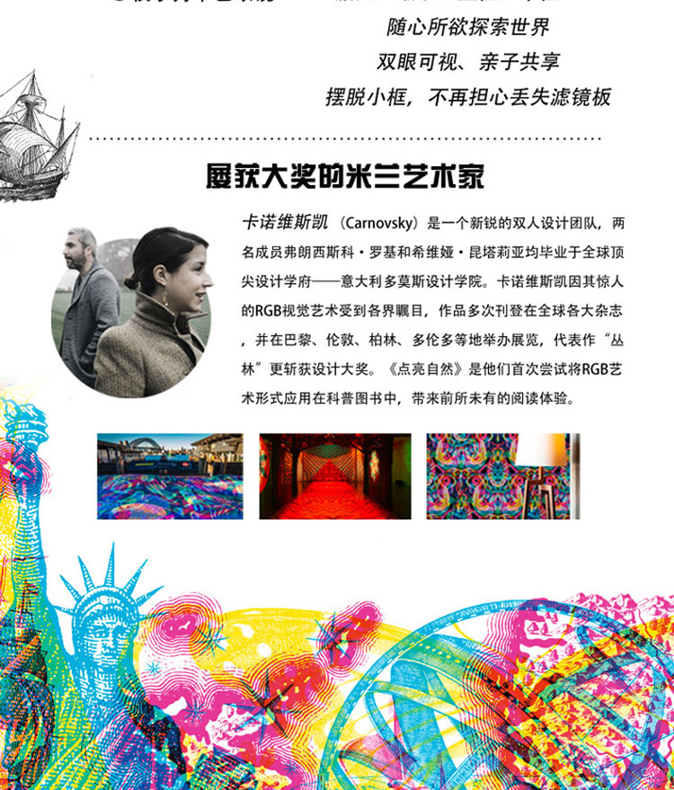 凯特·戴维斯(KateDavies)是一名童书作者和编辑,目前生活在伦敦,同时她还表演和推广喜剧,并且在奶酪上花费了大量的时间和金钱。凯特?戴维斯曾经在白金汉宫工作,向游客推销擦碗巾,她从没遇到过女王,但她的确撸过女王的狗。卡诺维斯凯(Carnovsky)是一个新锐的设计团队,两名成员弗朗西斯科罗基和希维娅昆塔莉亚均毕业于意大利多莫斯设计学院。卡诺维斯凯因其惊人的RGB视觉艺术作品受到各界瞩目,作品多次刊登在全球各大杂志,并在巴黎、伦敦、柏林、多伦多等地举办展览,代表作“丛林”更斩获设计大奖,全球知名品牌Adidas等纷纷与他们展开合作。出版代表作有《探秘人体》《点亮自然》等。