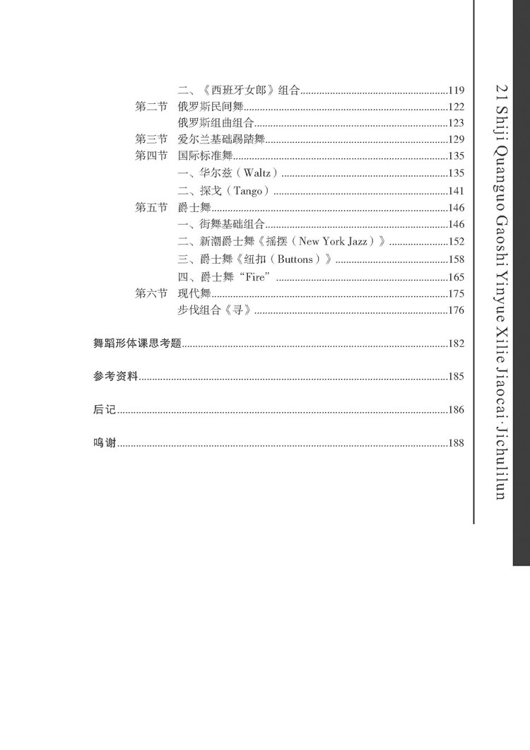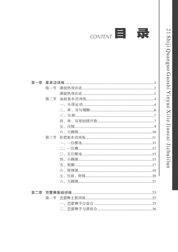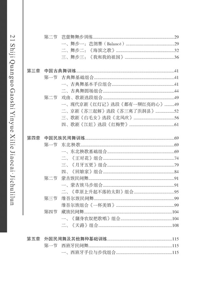 《舞蹈形体教程》是一部音乐与舞蹈表演相结合的范本教材,适用于高等音乐院校的演唱专业、音乐剧专业、影视表演专业以及音乐教育专业。从结构意义上讲,本教程涉及面广、以点带面,强调重点知识反复再现与新知识上下链接的主张,以期达到融则全贯、贯则全通的教学目标。从内容写作上看,本教程细致详能,一招一式拆解合理。作者对每个单元章节讲述清晰、范例明确、实践性强,使学生在原有的程度上通过舞蹈形体课的学习从而达到教学要求。