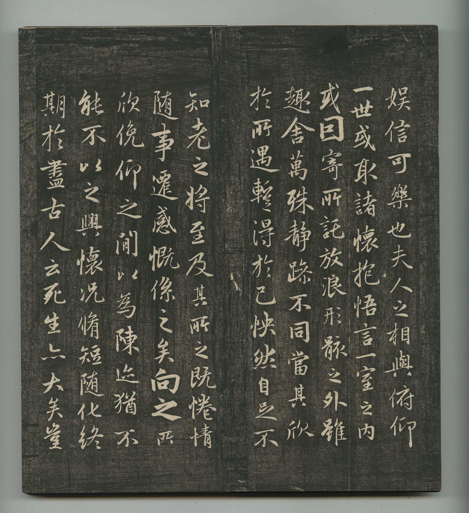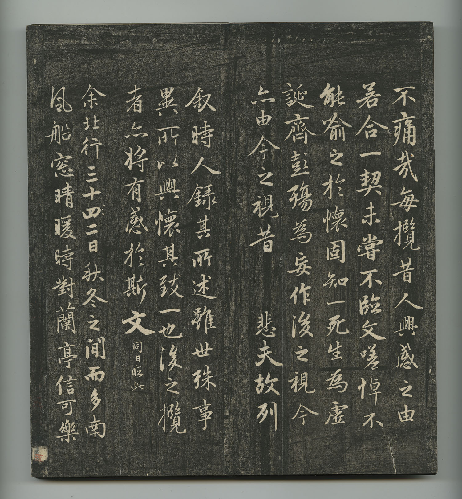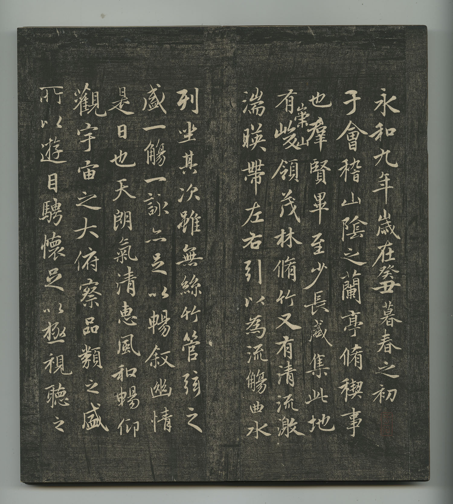 至北宋慶曆時,李學究在真定發現一塊蘭亭刻石,傳爲以唐代歐陽詢臨本摹刻,五代末契丹人入汴得之,輦石北去,遺弃在此。因北宋當地駐有義武軍,避宋太宗諱改名定武,故此刻石被稱爲《定武蘭亭》。後薛向爲統帥,將原石獻于天府,其子紹彭又翻刻一本,并將原石鑿損“湍、流、帶、右、天”五字,成爲判别版本的重要依據,另有九字損者,更在五字之前。由于唐摹本稀少,北宋人始重定武,至南宋高宗時期達到頂峰,幾欲凌駕所有蘭亭版本之上。定武刻石入内府後,消失于靖康之亂。原石拓本在宋時即已難求,故翻刻極夥,南宋桑世昌《蘭亭考》、俞松《蘭亭續考》記載了當時流傳拓本及翻刻情况。至元代,如趙孟頫、柯九思等書畫鑒藏大家,所見真本亦不過三四。