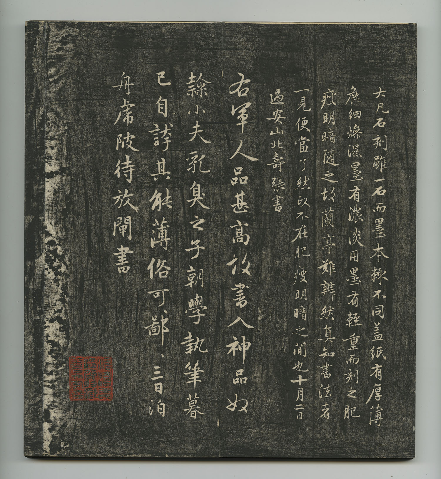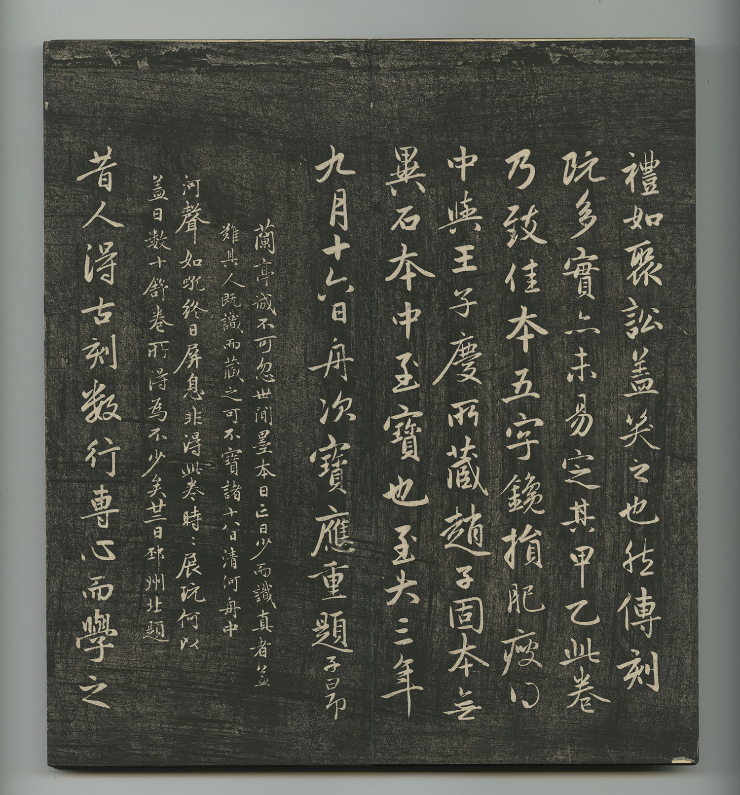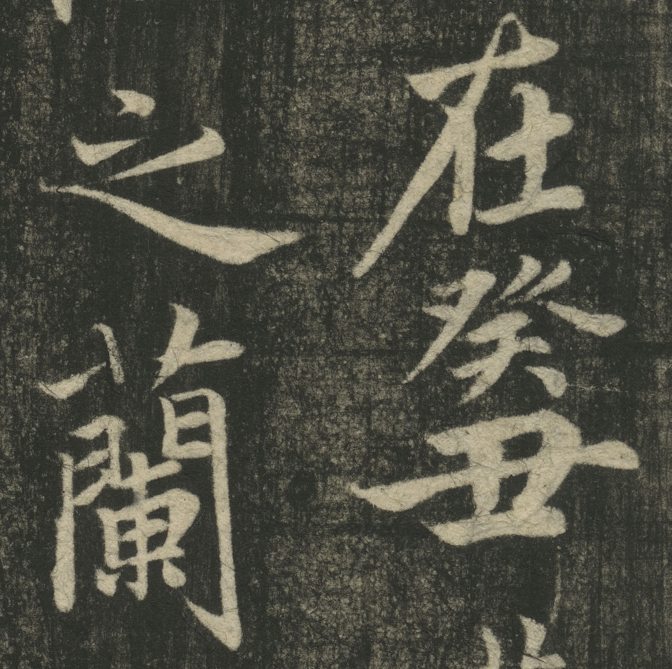 至北宋慶曆時,李學究在真定發現一塊蘭亭刻石,傳爲以唐代歐陽詢臨本摹刻,五代末契丹人入汴得之,輦石北去,遺弃在此。因北宋當地駐有義武軍,避宋太宗諱改名定武,故此刻石被稱爲《定武蘭亭》。後薛向爲統帥,將原石獻于天府,其子紹彭又翻刻一本,并將原石鑿損“湍、流、帶、右、天”五字,成爲判别版本的重要依據,另有九字損者,更在五字之前。由于唐摹本稀少,北宋人始重定武,至南宋高宗時期達到頂峰,幾欲凌駕所有蘭亭版本之上。定武刻石入内府後,消失于靖康之亂。原石拓本在宋時即已難求,故翻刻極夥,南宋桑世昌《蘭亭考》、俞松《蘭亭續考》記載了當時流傳拓本及翻刻情况。至元代,如趙孟頫、柯九思等書畫鑒藏大家,所見真本亦不過三四。