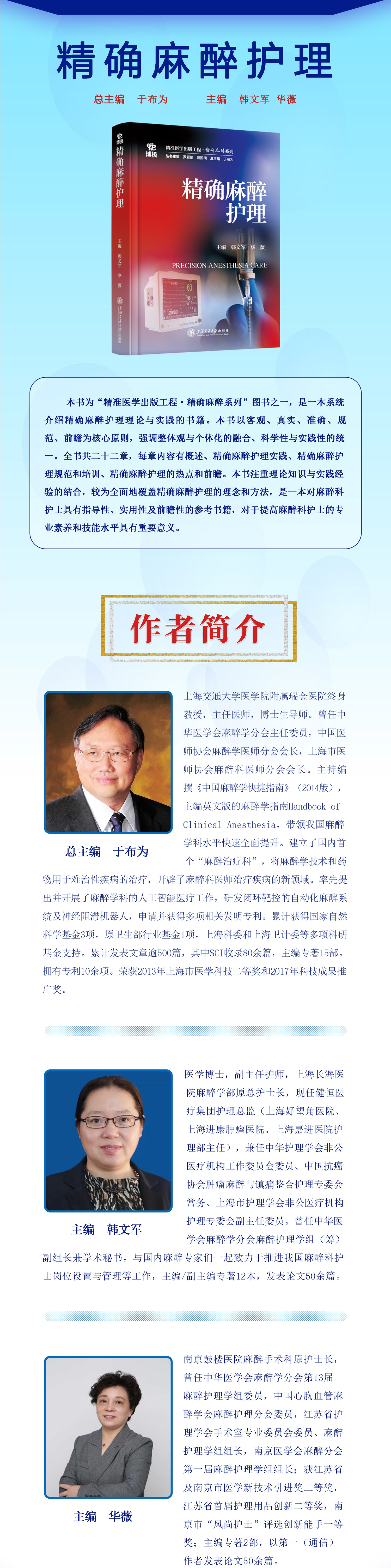 本书为“精准医学出版工程·精确麻醉系列”图书之一,是一本系统介绍精确麻醉护理理论与实践的书籍。本书以客观、真实、准确、规范、前瞻为核心原则,强调整体观与个体化的融合、科学性与实践性的统一。全书共二十二章,每章内容有概述、精确麻醉护理实践、精确麻醉护理规范和培训、精确麻醉护理的热点和前瞻。本书注重理论知识与实践经验的结合,较为全面地覆盖精确麻醉护理的理念和方法,是一本对麻醉科护士具有指导性、实用性及前瞻性的参考书籍,对于提高麻醉科护士的专业素养和技能水平具有重要意义。