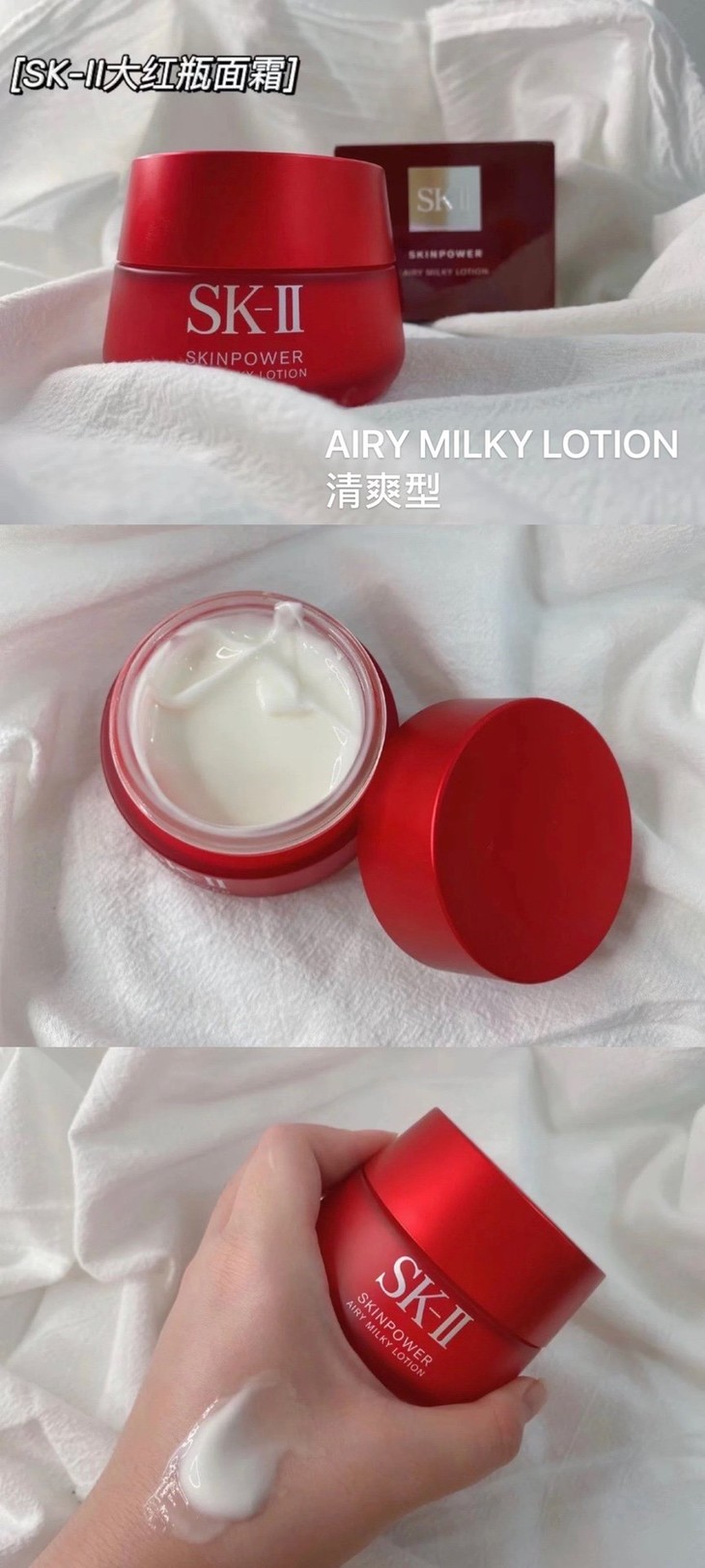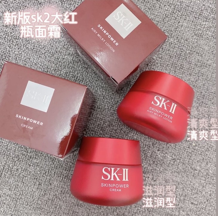 SK2新版磨砂瓶精华霜#Cream滋润型80g/100g|#Airy Milky Lotion清爽型80g👍SK-II元老级,一瓶=N瓶护肤品的效果❤。加入经典成分PITERA™,针对法令纹,干燥,缺乏光泽等10大肌肤衰老症状。维稳保湿,紧致弹嫩,隐形毛孔,淡化细纹,扫去暗沉疲惫。全新升级版采用INFINTPOWER黑科技😎为肌肤由内而外地“充电”,更侧重于皮肤弹润紧实度方面的改善✔️,让肌肤通透饱满有光泽的好状态维持一整天🔆〰*清爽型适合油性、混油或夏季使用/*滋润型适合干性、混干或秋冬季使用