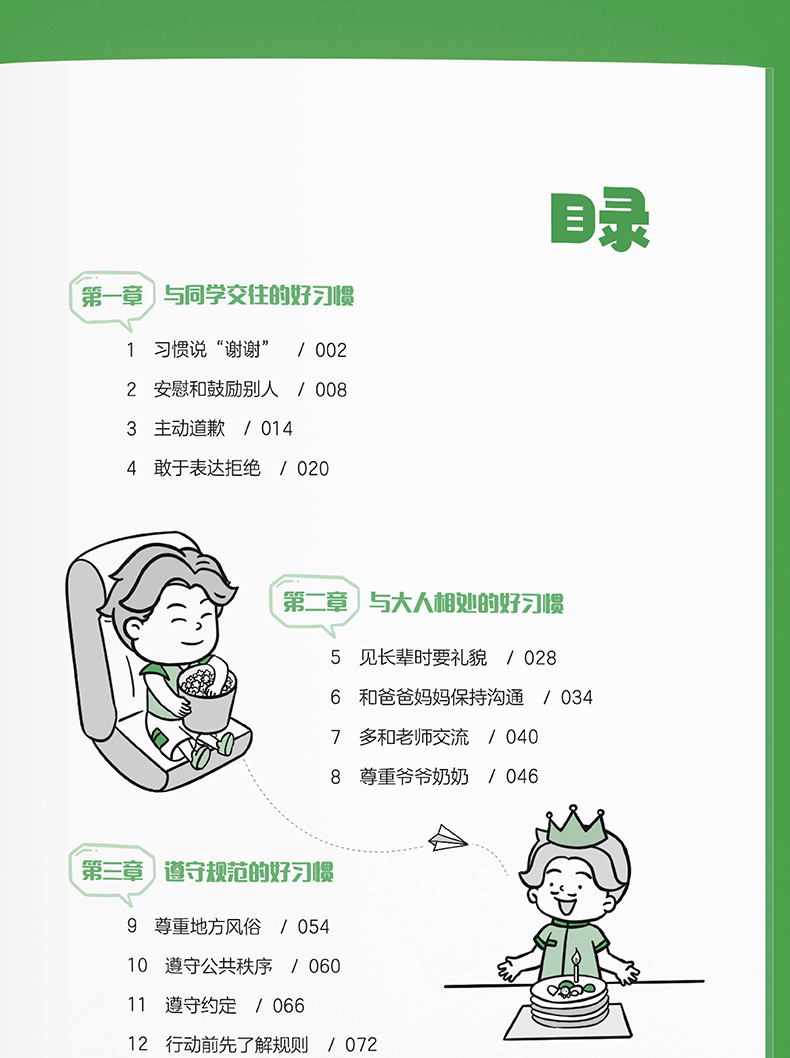 本书选取社交习惯、日常行为习惯、时间管理习惯、生活方式习惯等几个方面的内容,用漫画生活场景再现小朋友日常生活中最常见的24件小事,浅显易懂,趣味性浓,能帮助小朋友快速养成好习惯,塑造美好人生。