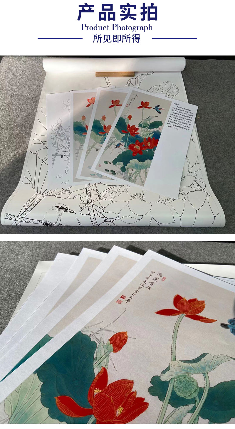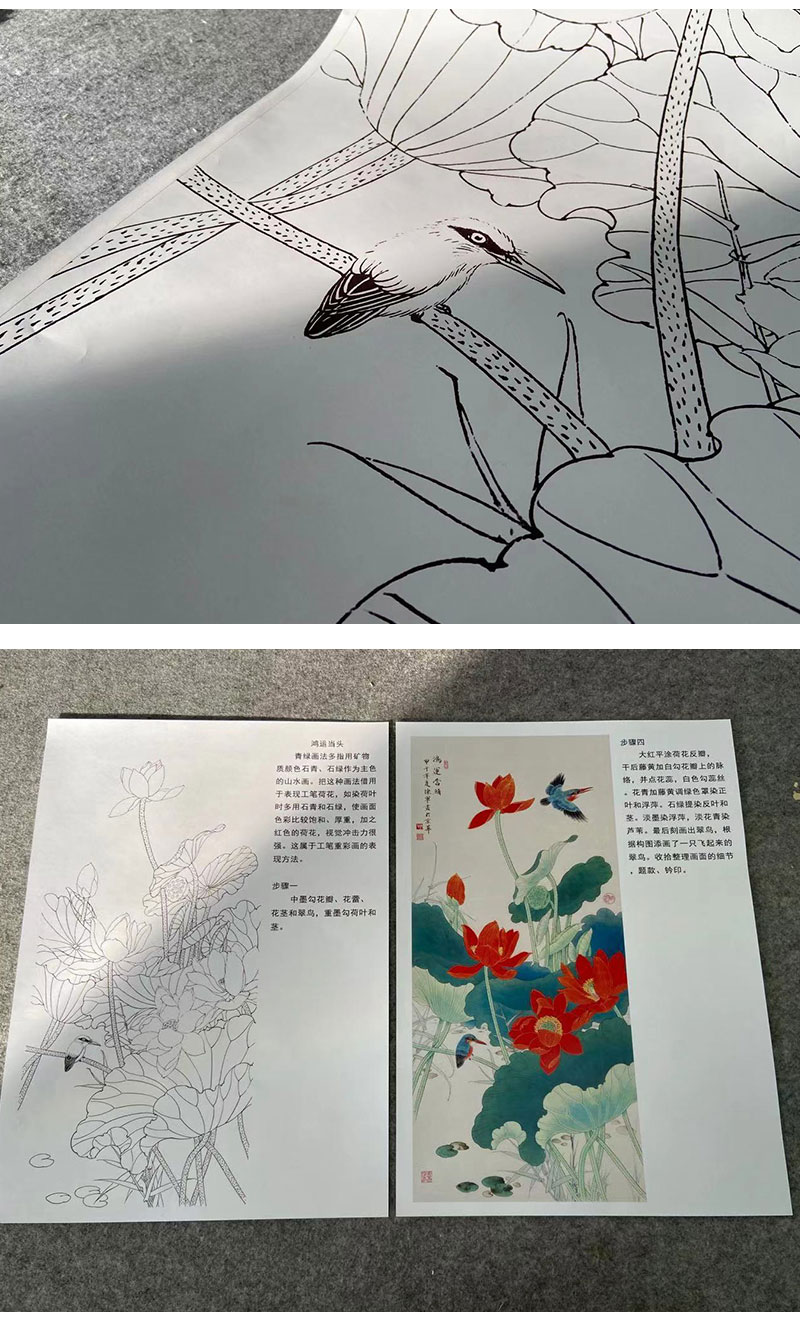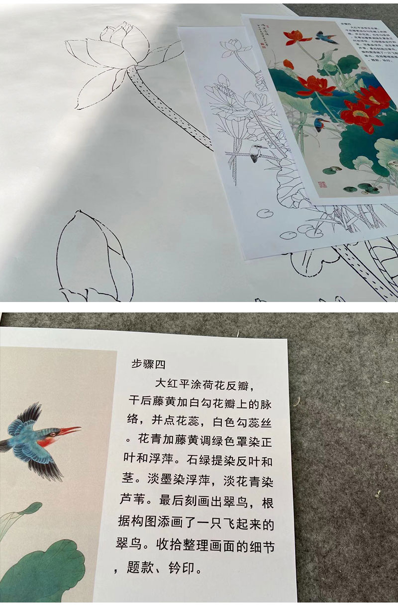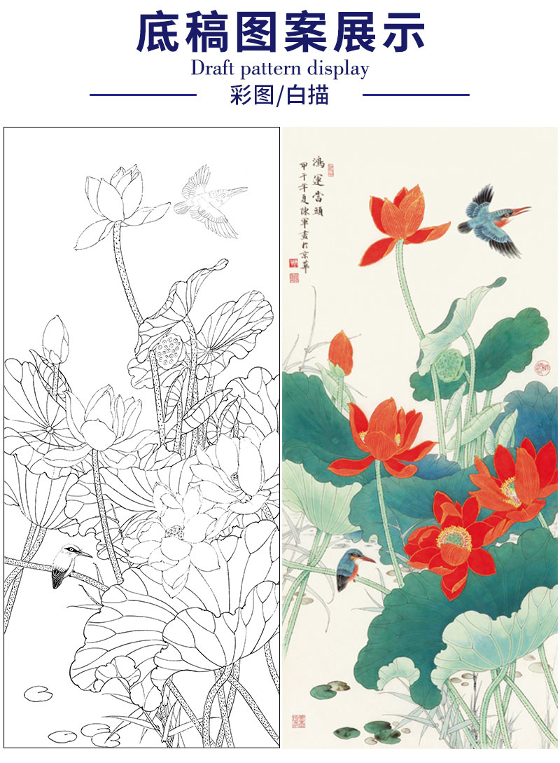 【有步骤、大彩图】陈军工笔画白描底稿《鸿运当头》荷花翠鸟初学者临摹花鸟线稿CJ02