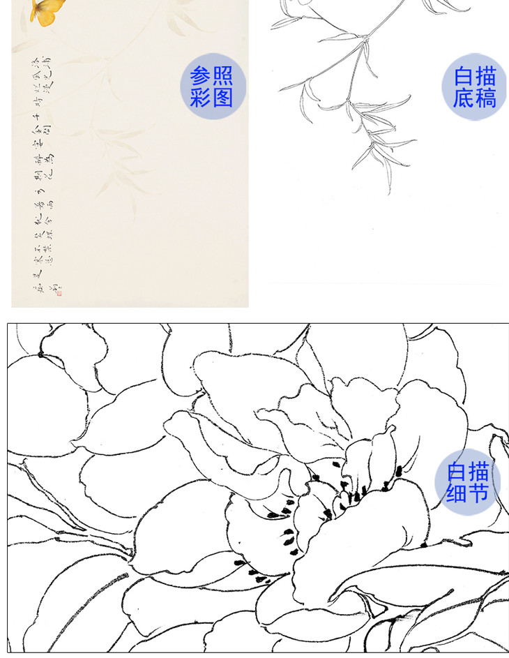 【有步骤、大彩图】郑玲玲工笔画白描底稿《 锦羽祥瑞》锦鸡牡丹初学者临摹花鸟线稿ZL97