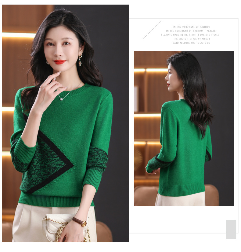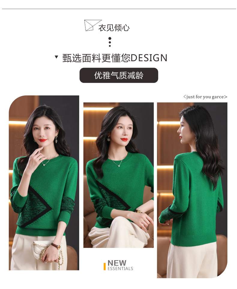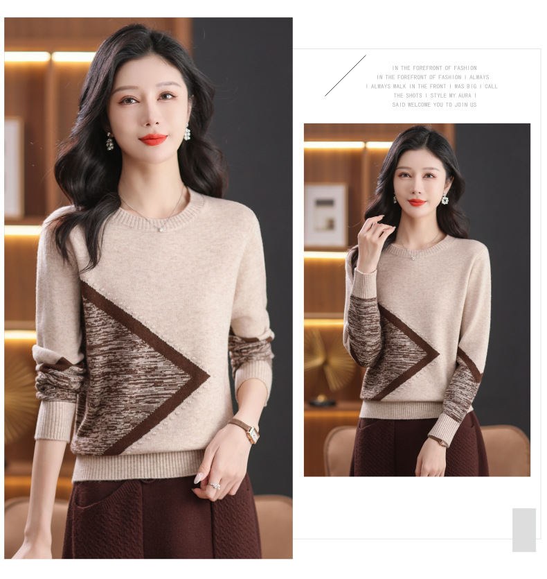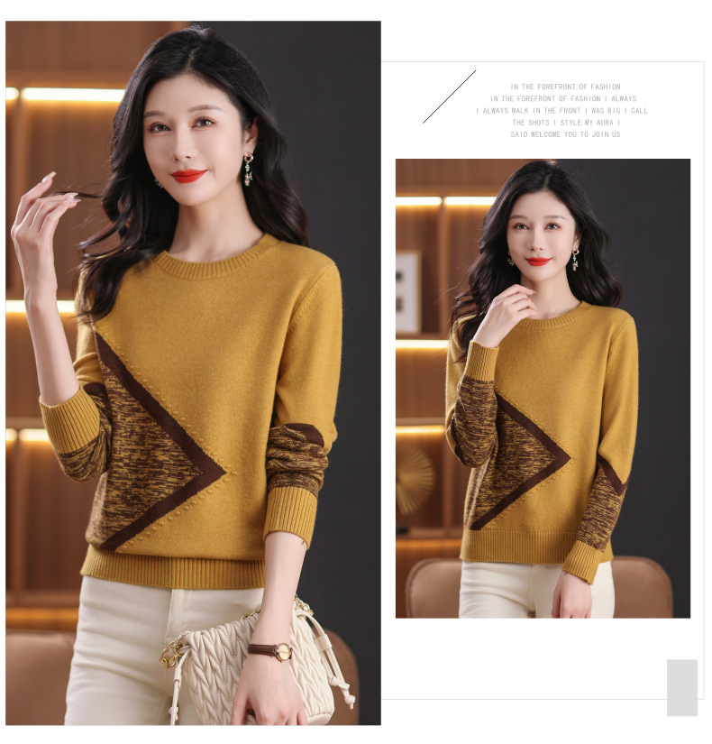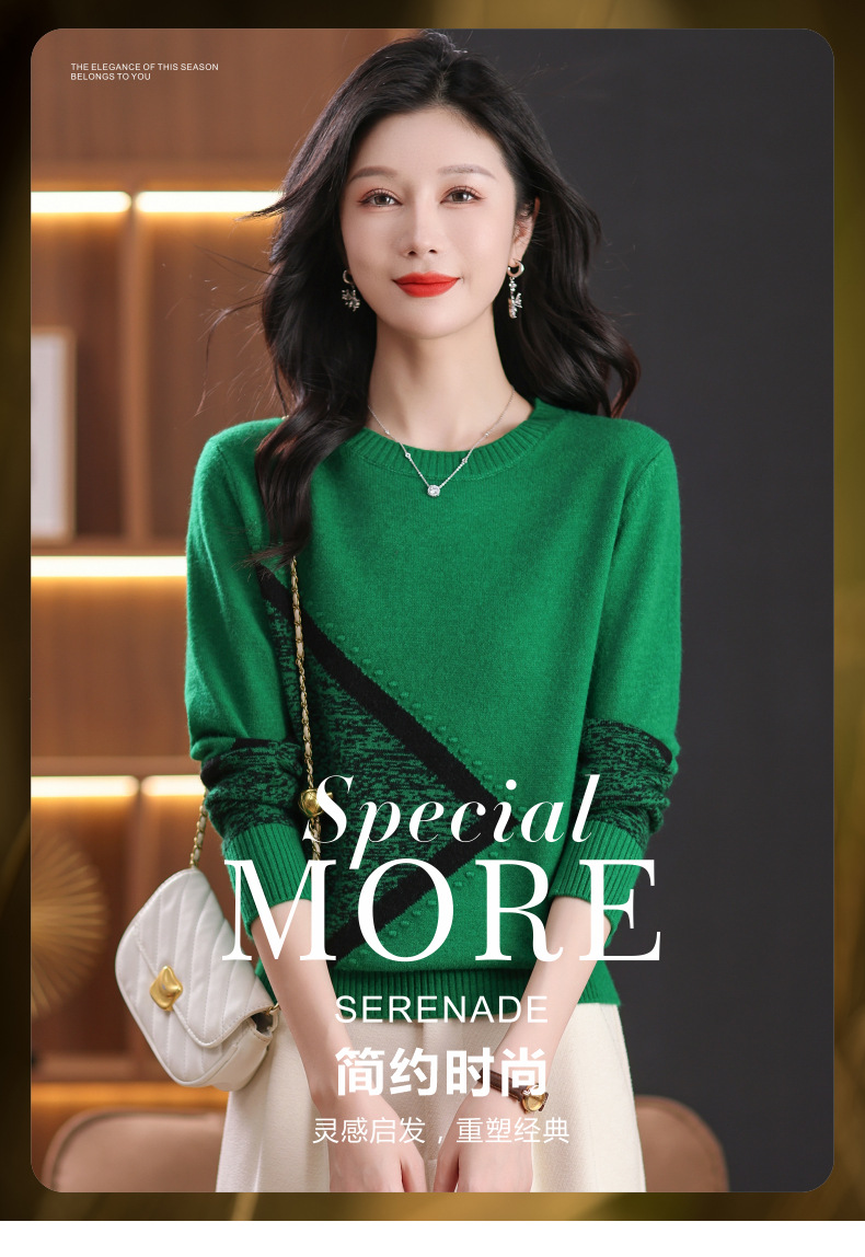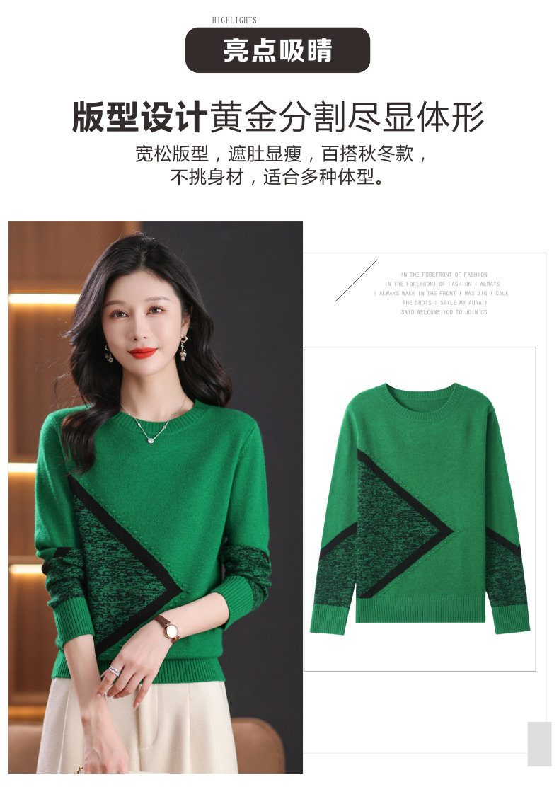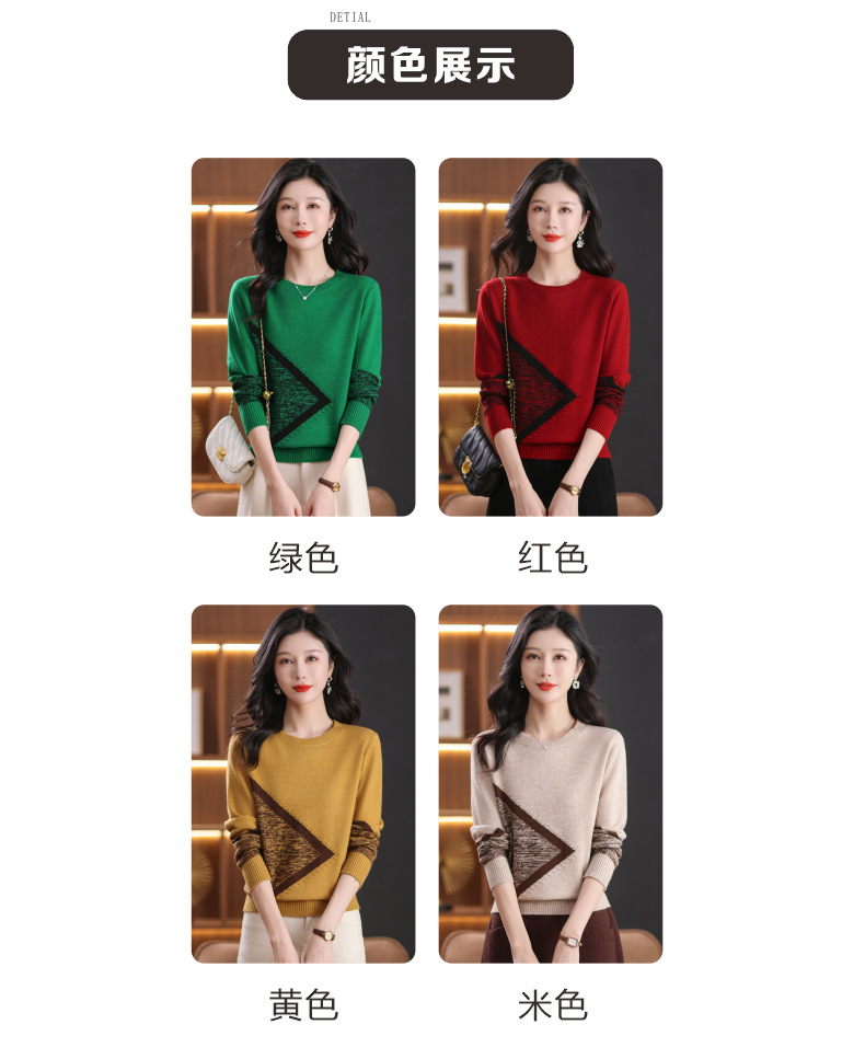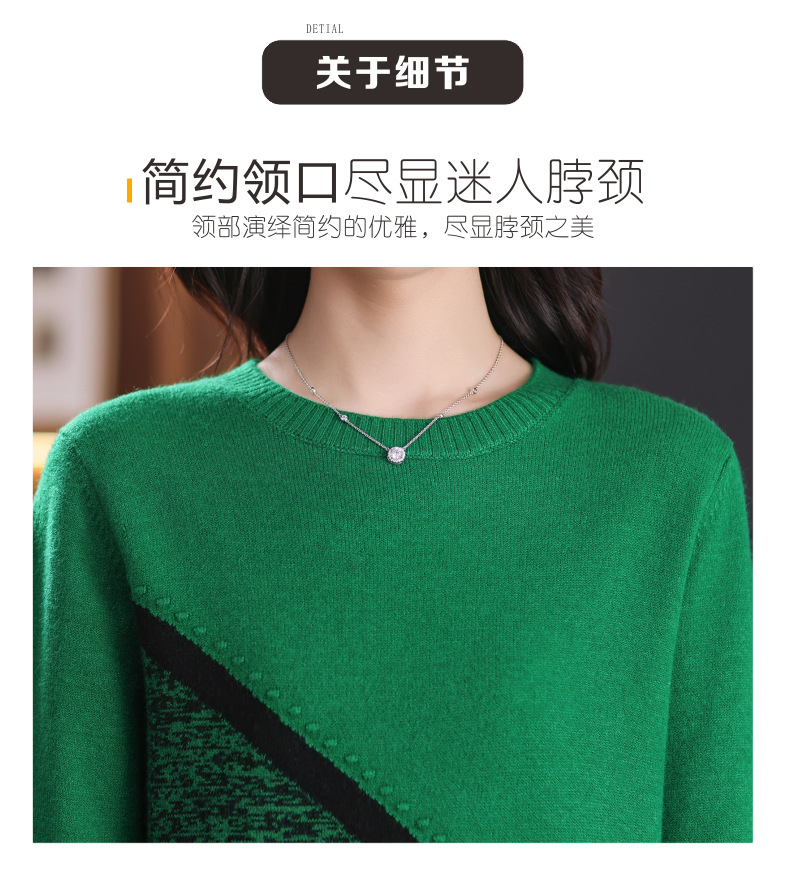 CC-89-726圆领拼色针织衫毛衣女装长袖秋冬新款韩版小众宽松显瘦打底衫上衣