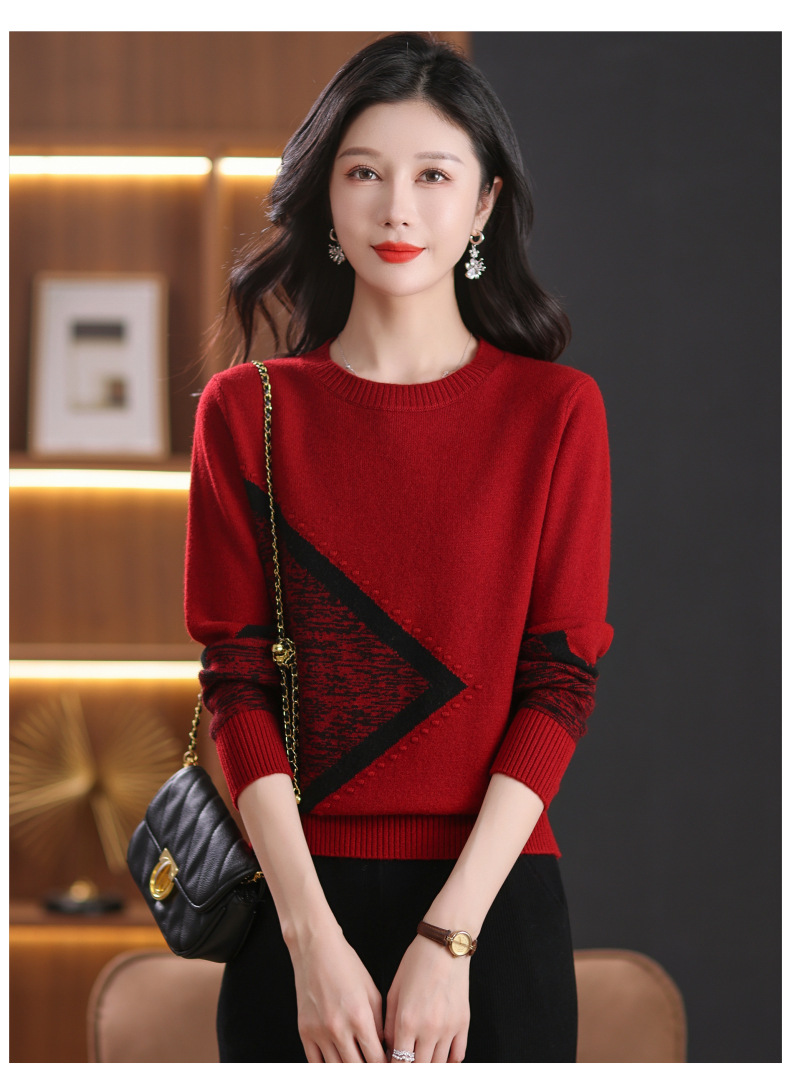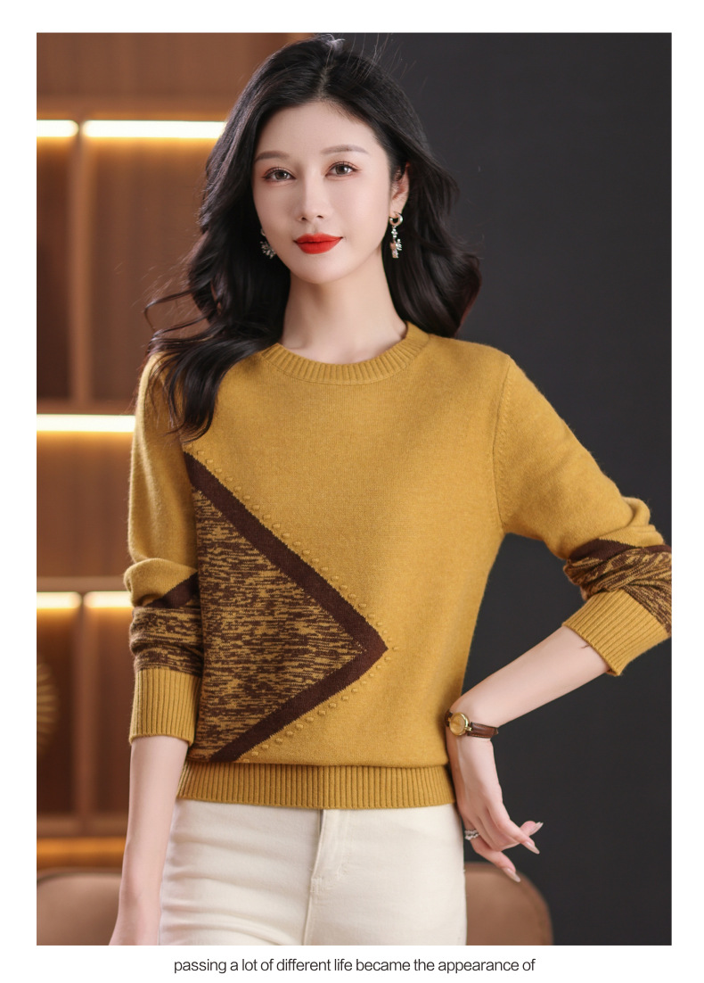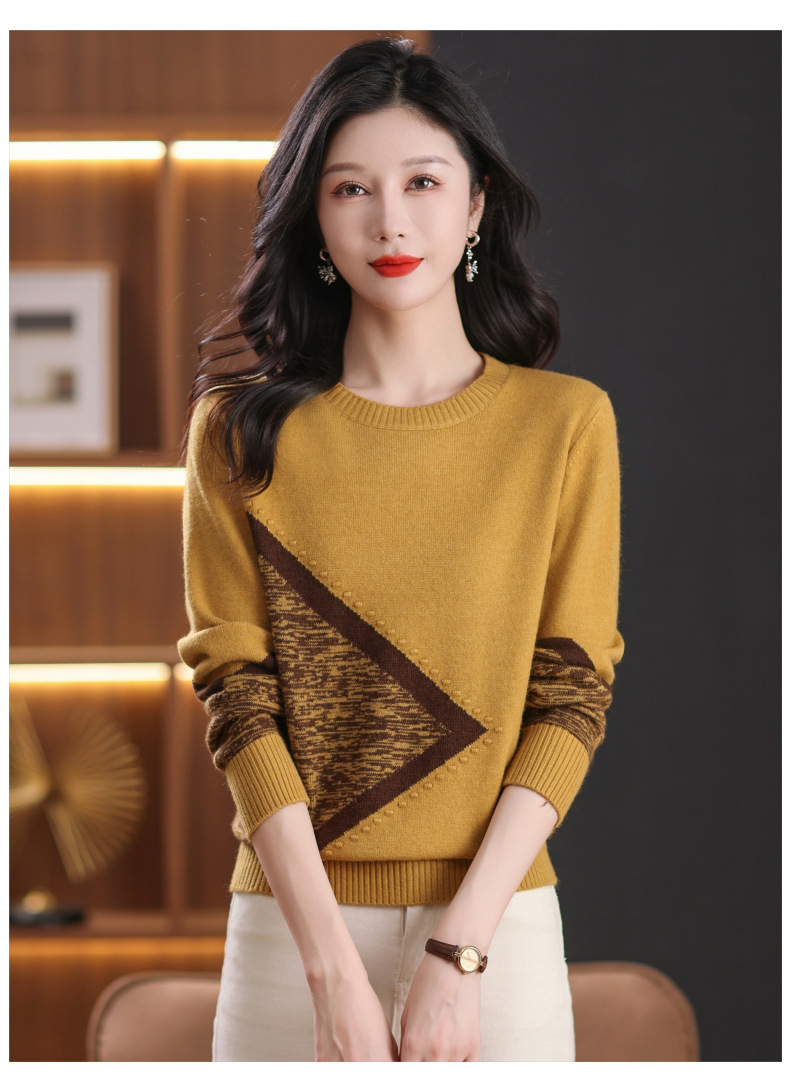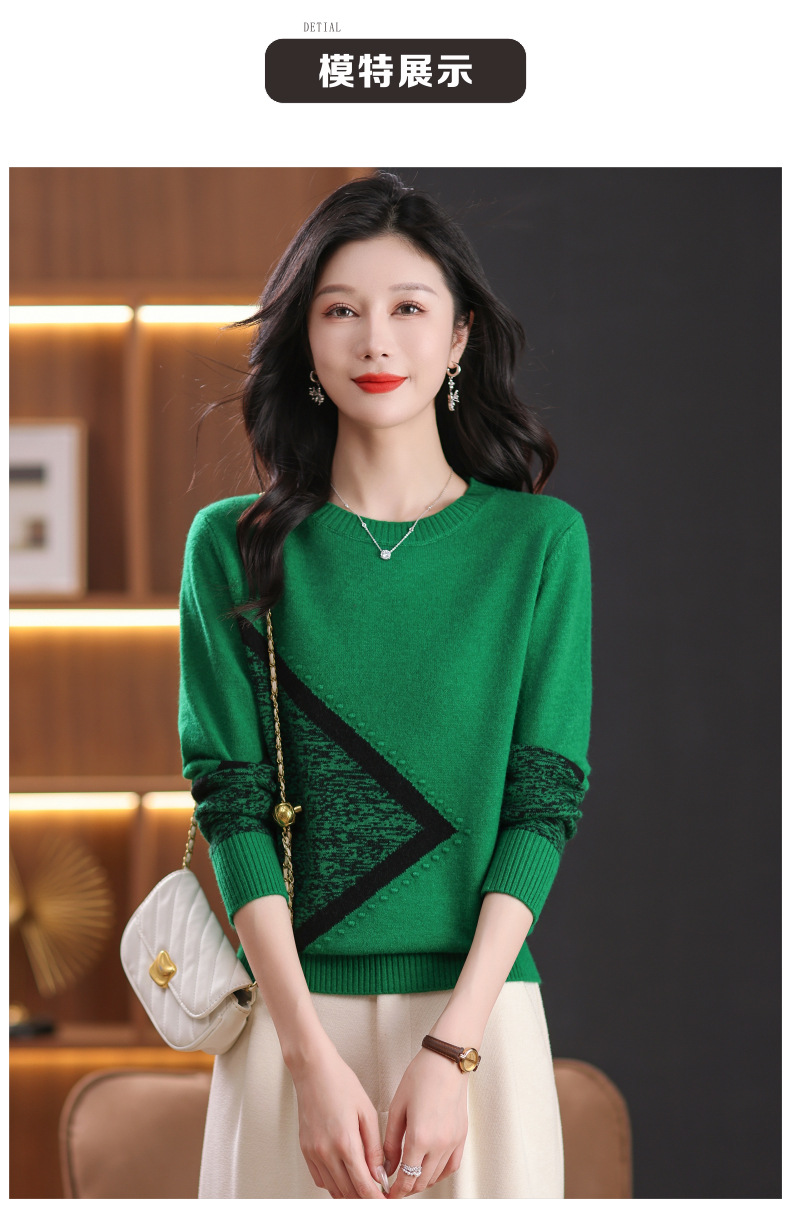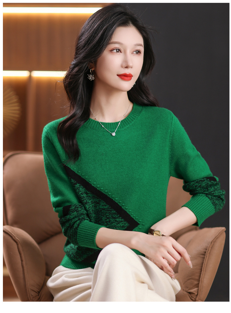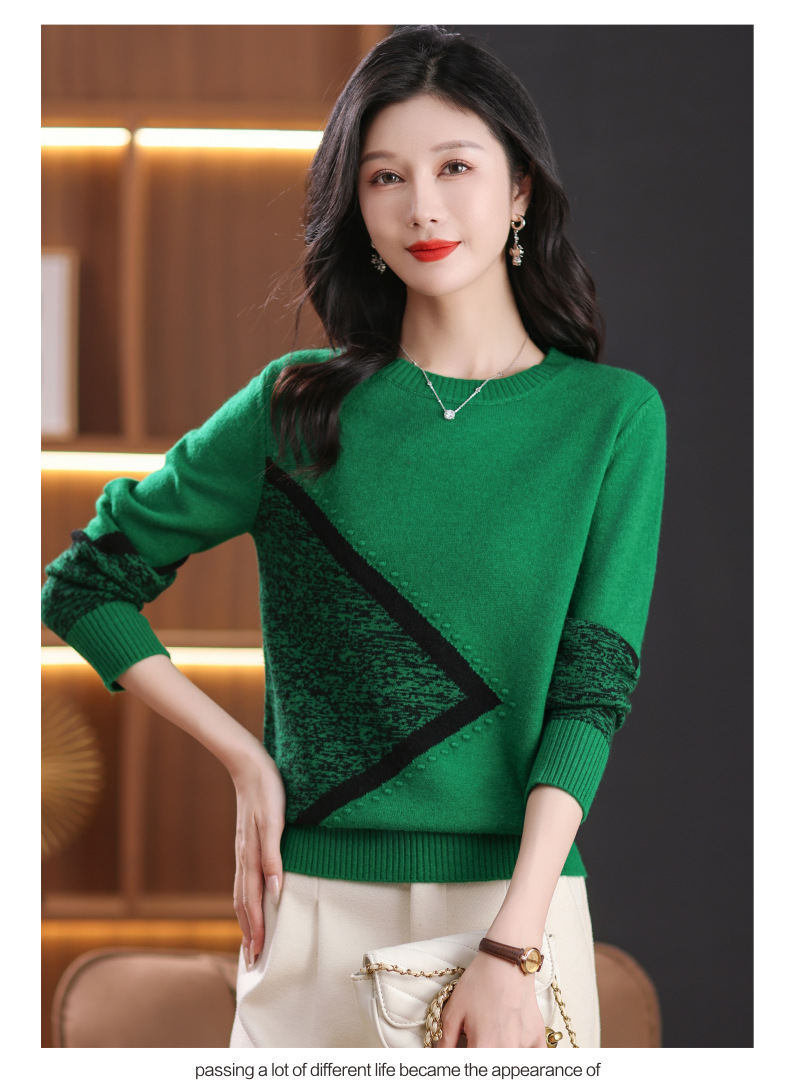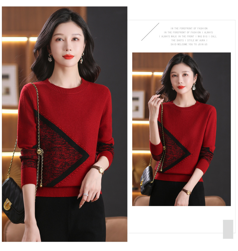 CC-89-726圆领拼色针织衫毛衣女装长袖秋冬新款韩版小众宽松显瘦打底衫上衣