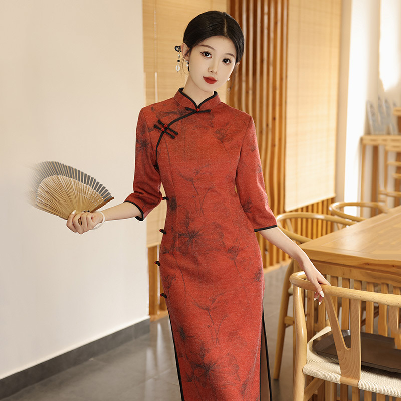 SC17346绿色国风中式长款秋季七分袖旗袍改良年轻款女复古修身收腰春秋装 商品图0