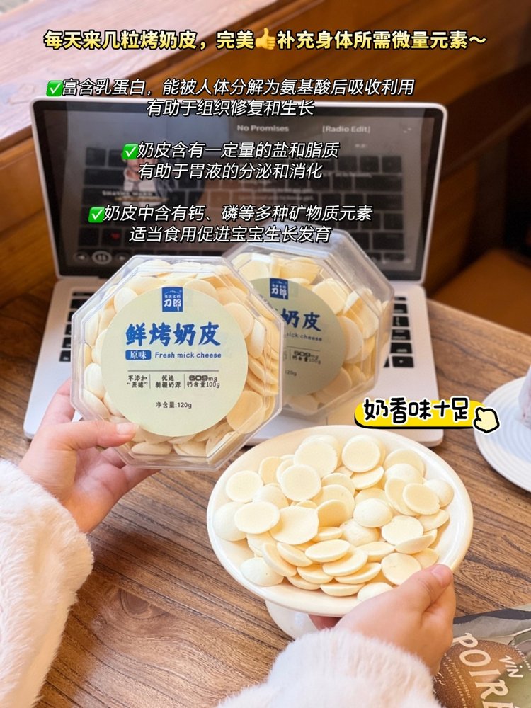 高钙高蛋白,入口嘎嘣脆,鲜甜浓郁的奶香在嘴里蔓延。不加一滴水,0添加香精、色素、防腐剂;改良版的奶皮子,更适合中国宝宝体质,特别是不爱喝牛奶的小朋友,一定要试一下!